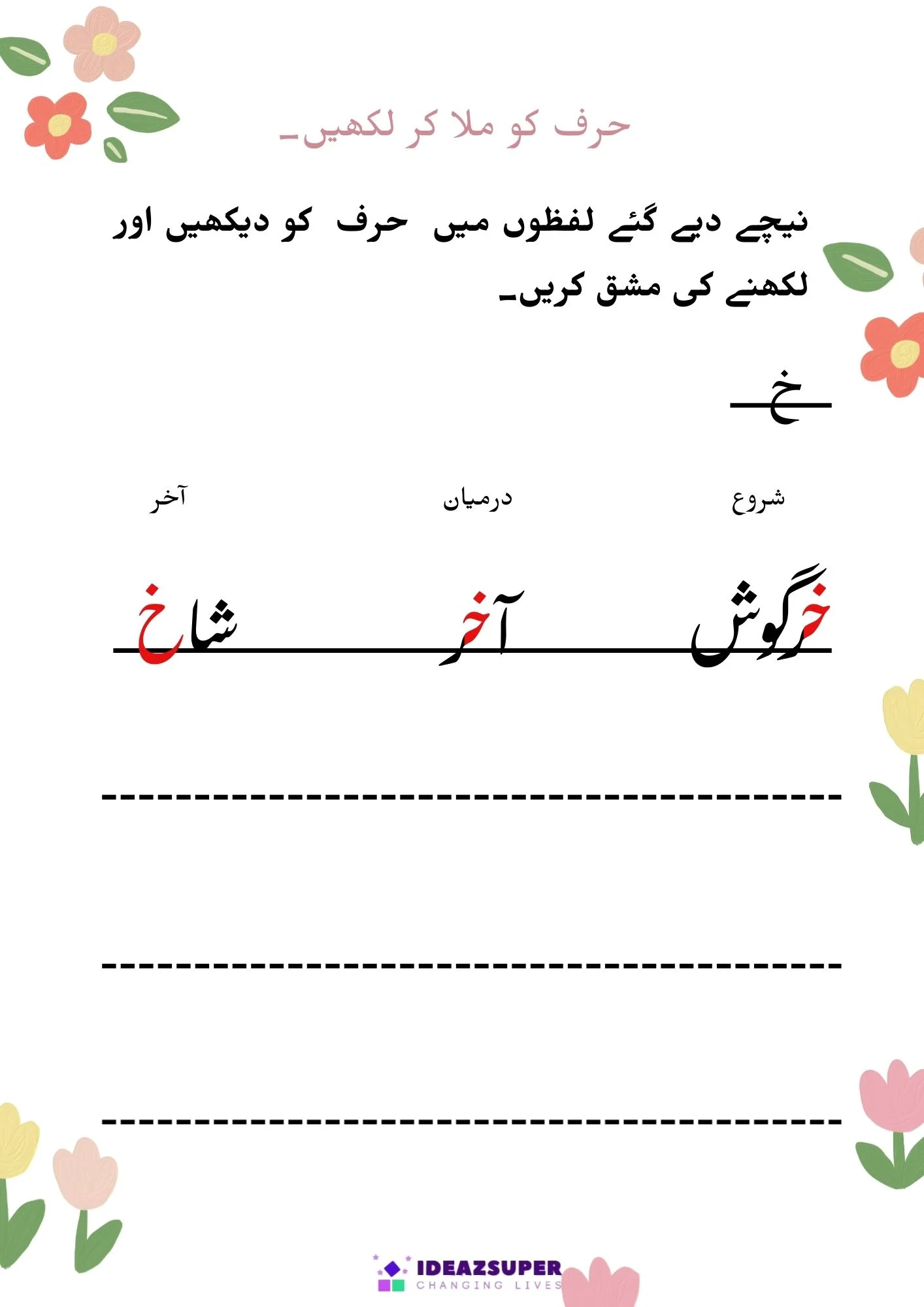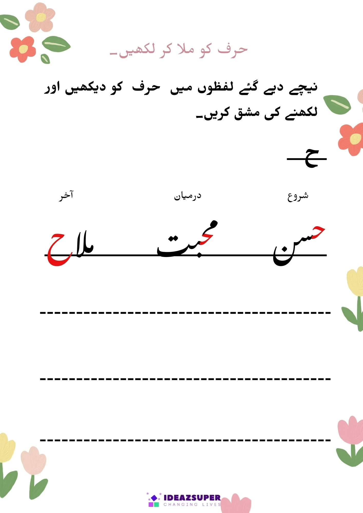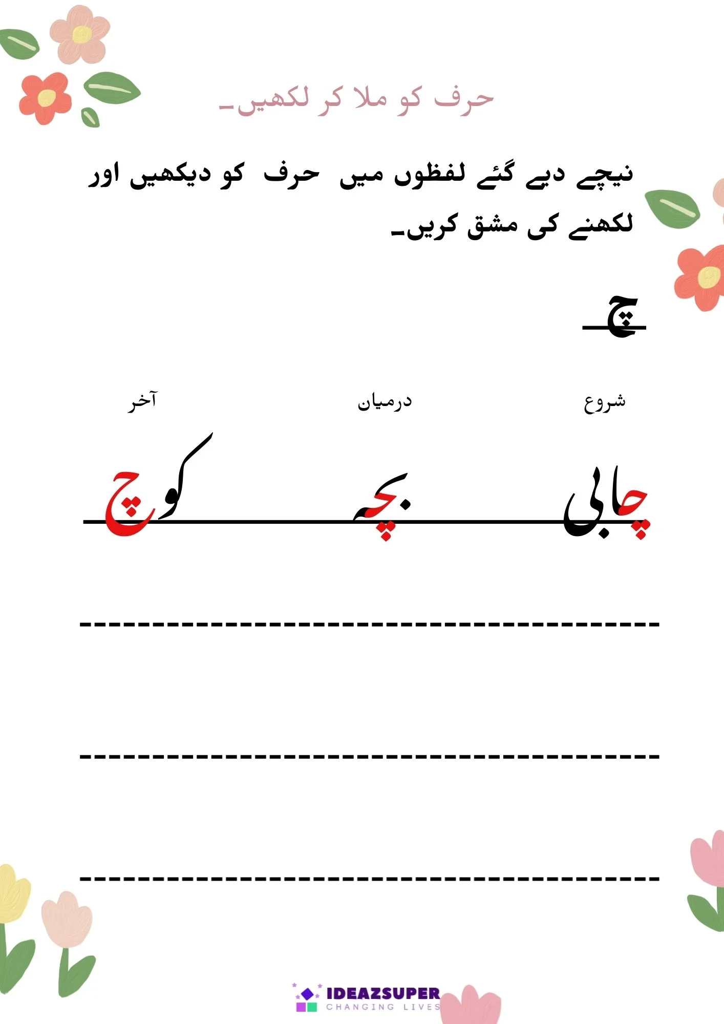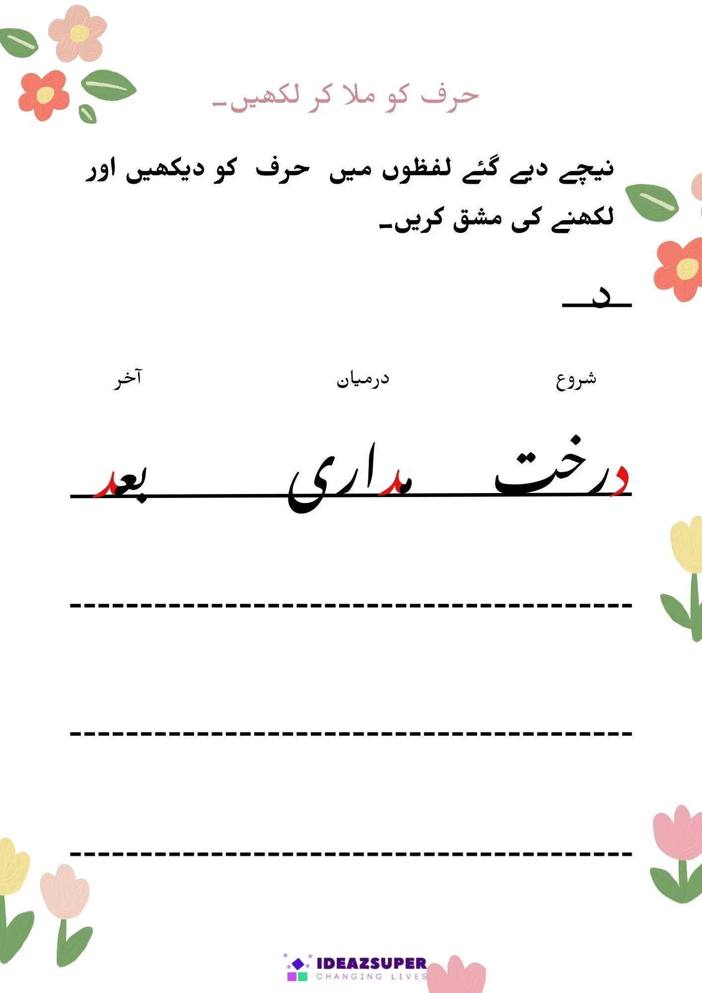 یہ ورک شیٹس بچوں کو اردو الفاظ میں شروع، درمیان اور آخر کے حروف کی آسان اور دلچسپ انداز میں پہچان سکھاتی ہیں۔ یہ سرگرمیاں پری اسکول اور کنڈرگارٹن بچوں کی اردو ریڈنگ، فونکس اور لفظ سازی کی صلاحیت کو بہتر بناتی ہیں۔