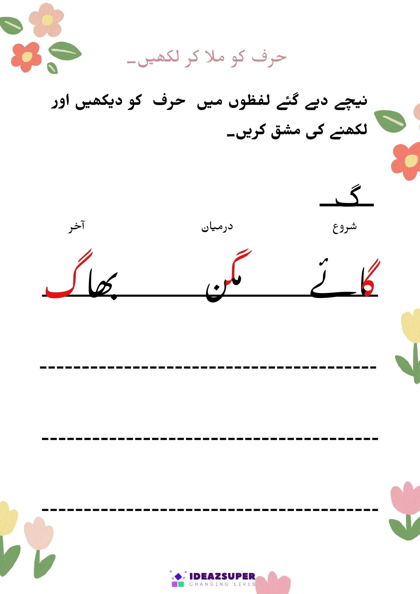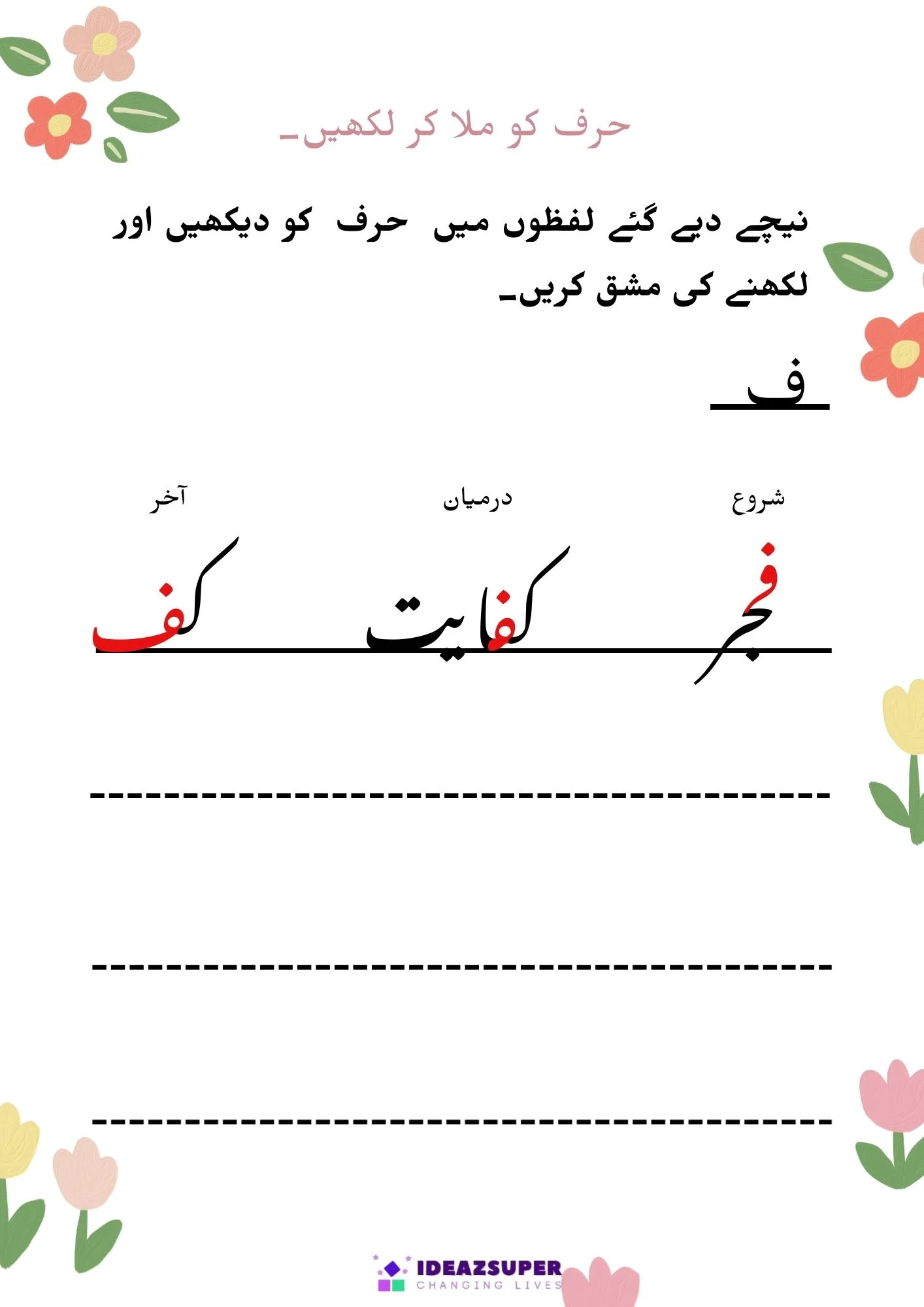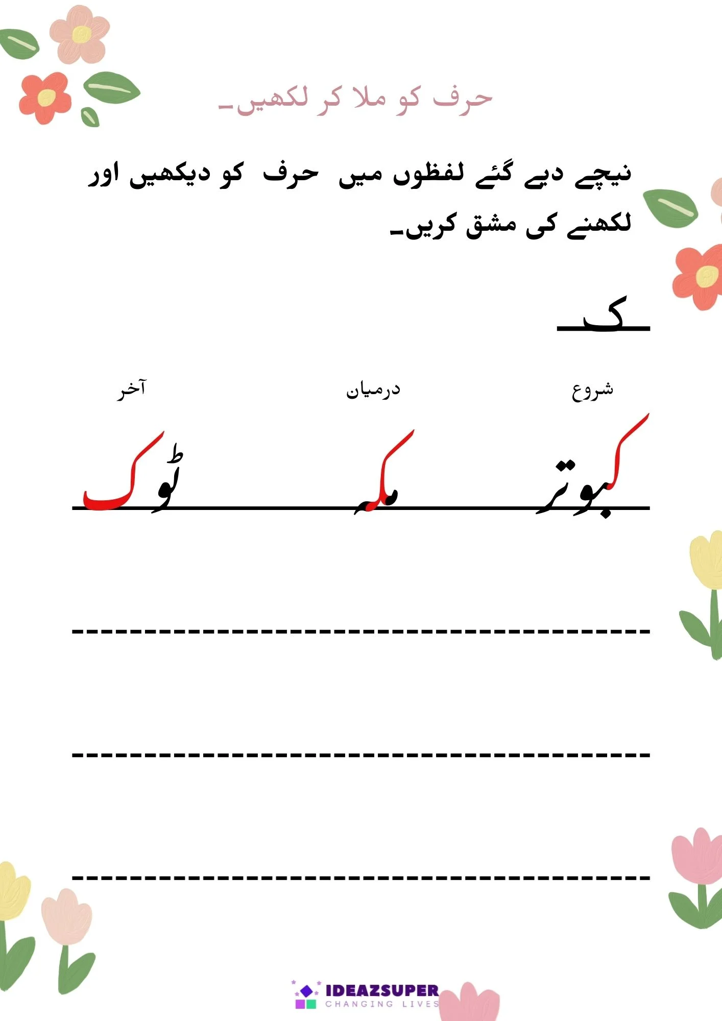 یہ ورک شیٹس بچوں کو اردو الفاظ میں شروع، درمیان اور آخر کے حروف کی آسان اور دلچسپ انداز میں پہچان سکھاتی ہیں۔ یہ سرگرمیاں پری اسکول اور کنڈرگارٹن بچوں کی اردو ریڈنگ، فونکس اور لفظ سازی کی صلاحیت کو بہتر بناتی ہیں۔