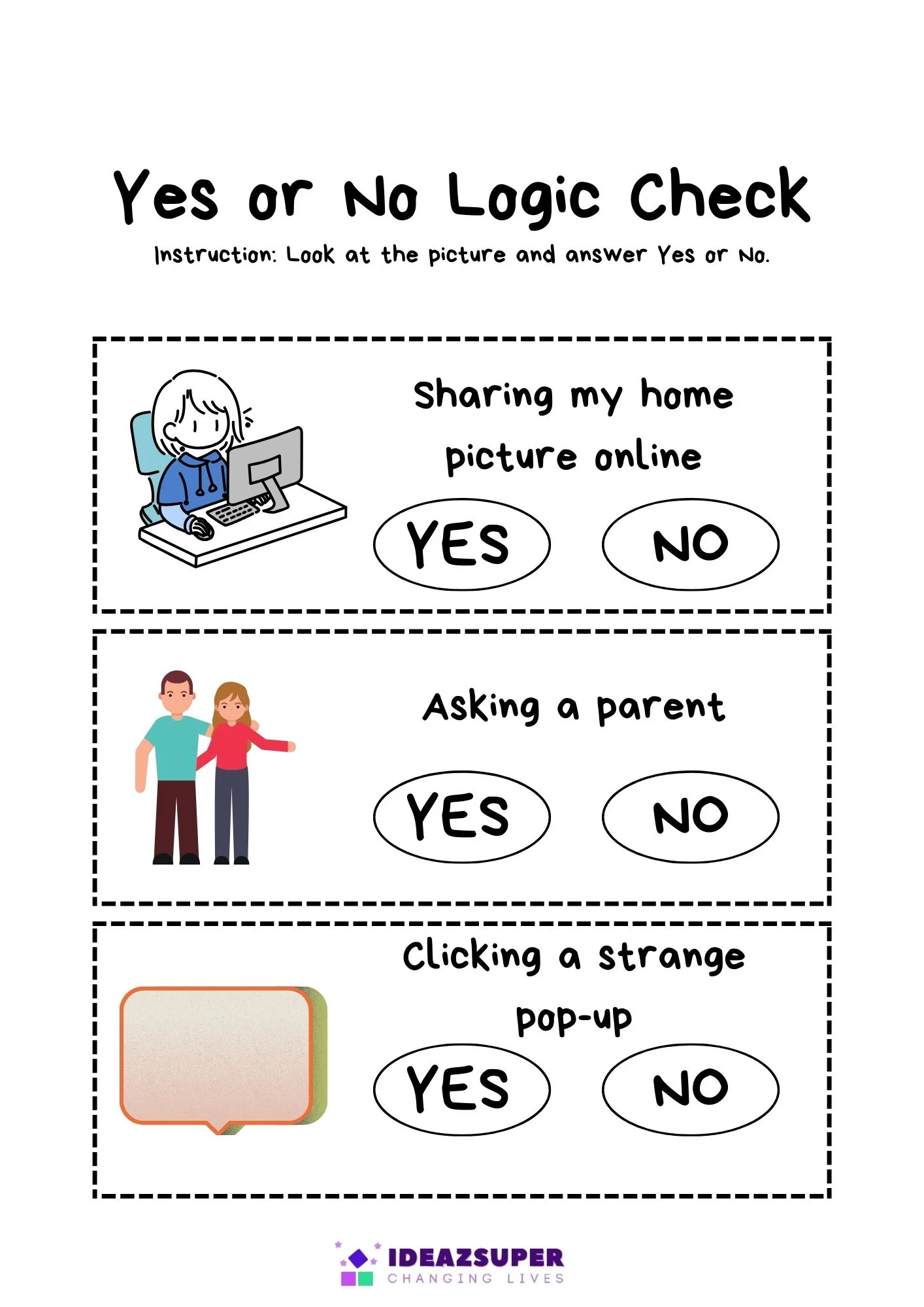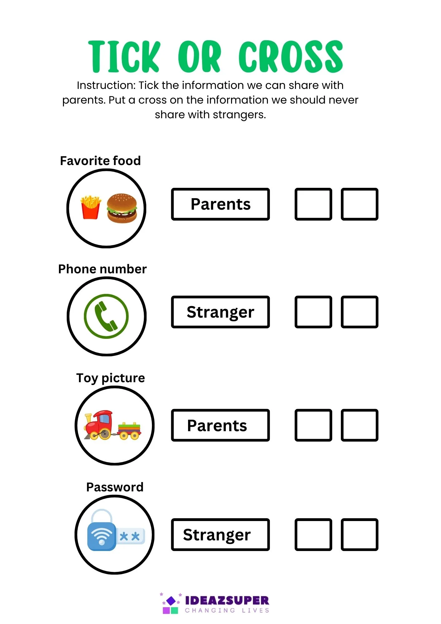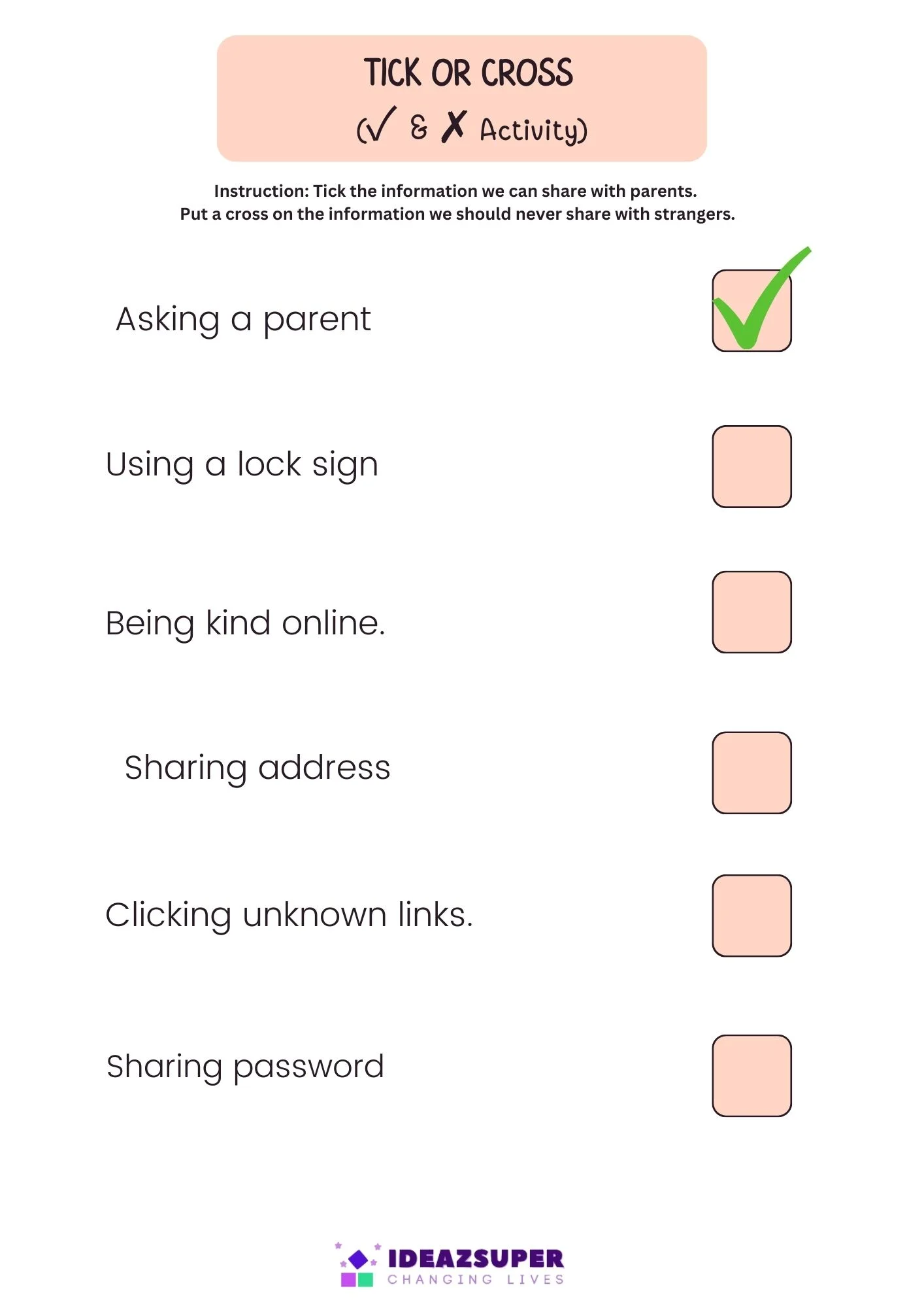 Data Privacy Day worksheets help children understand basic online safety and personal information protection. Through simple matching, tick-or-cross, and scenario-based activities, kids learn what information is safe to share and what should stay private. These worksheets build early digital awareness, responsible online behavior, and confidence when using technology in a safe way.