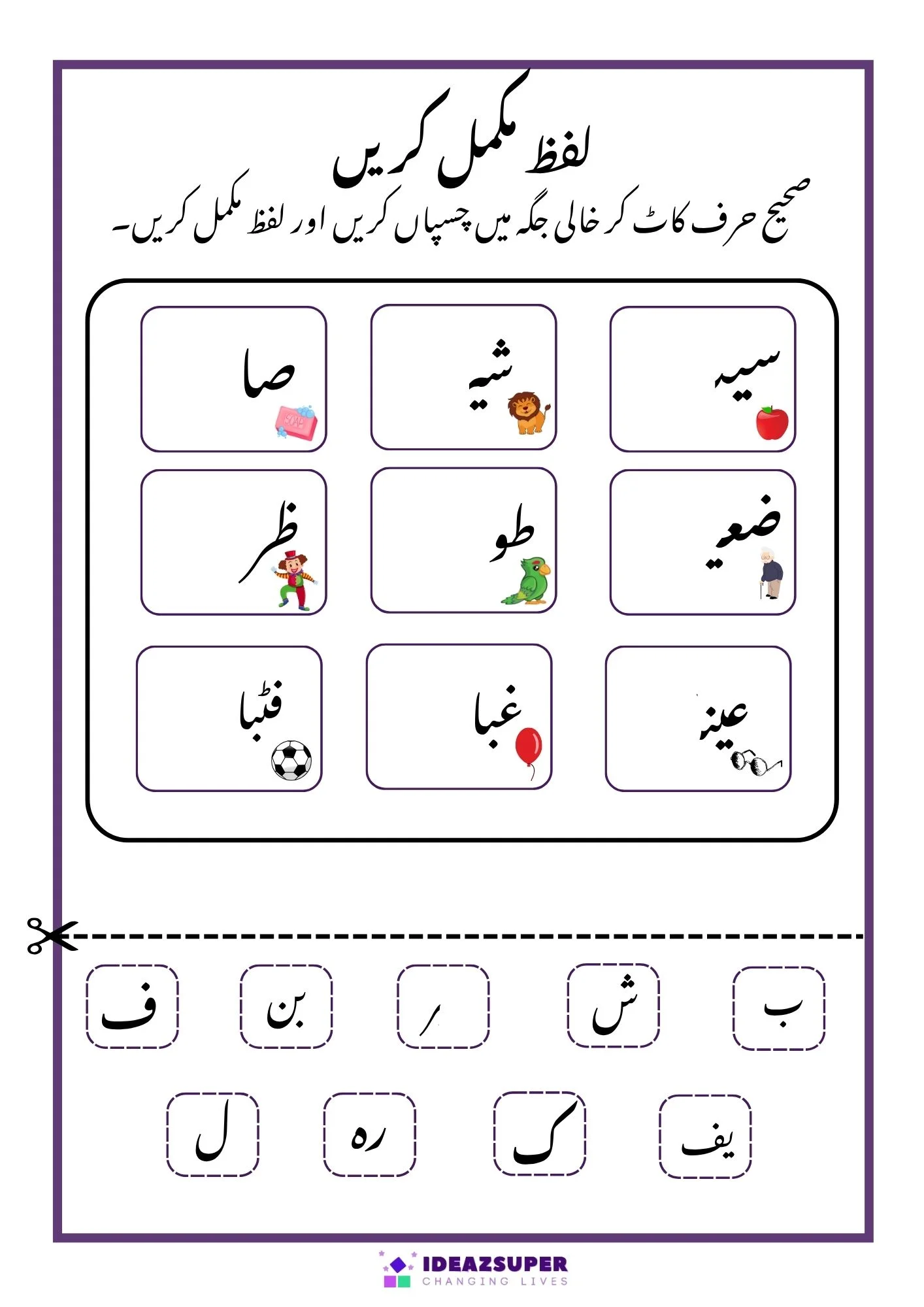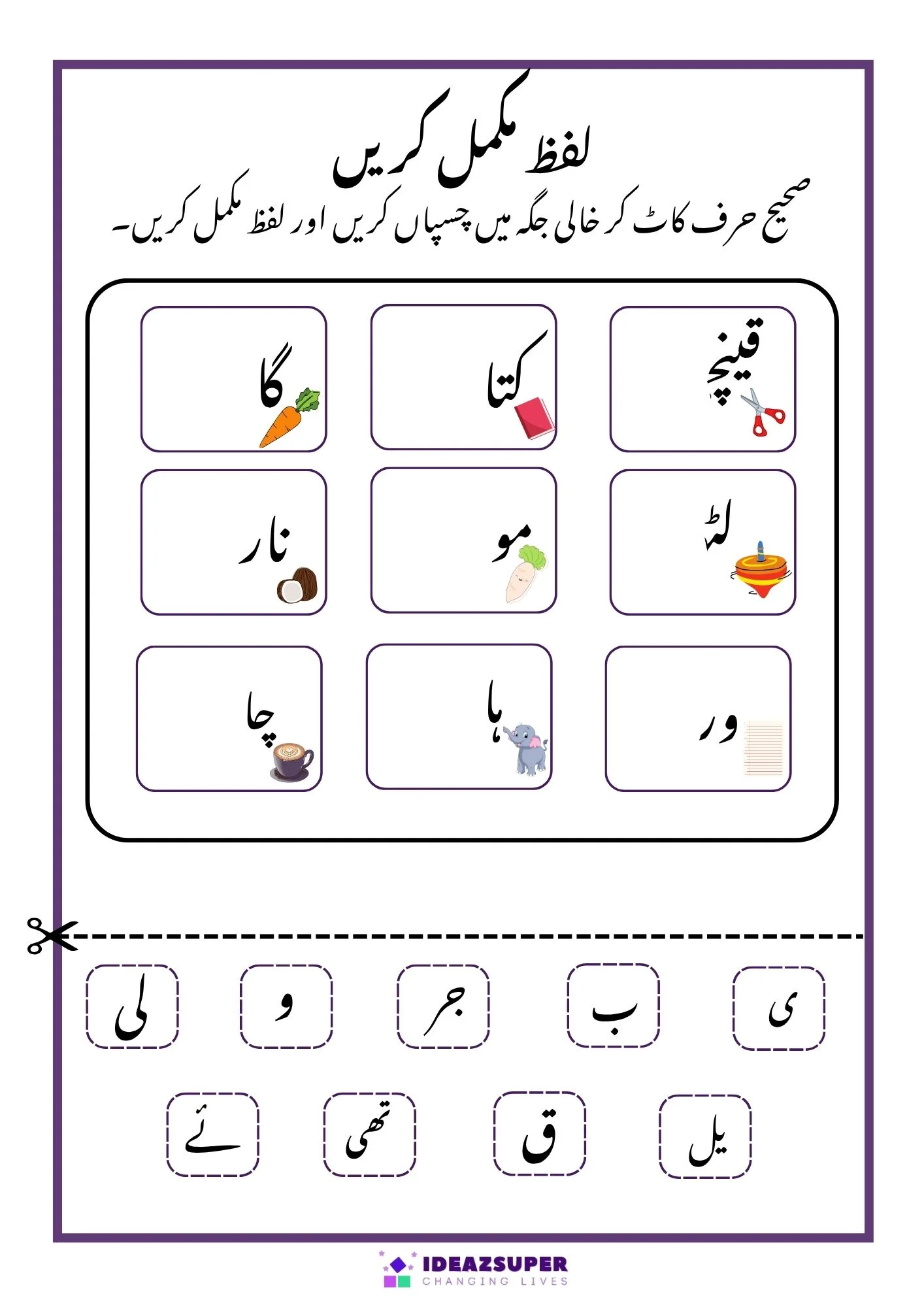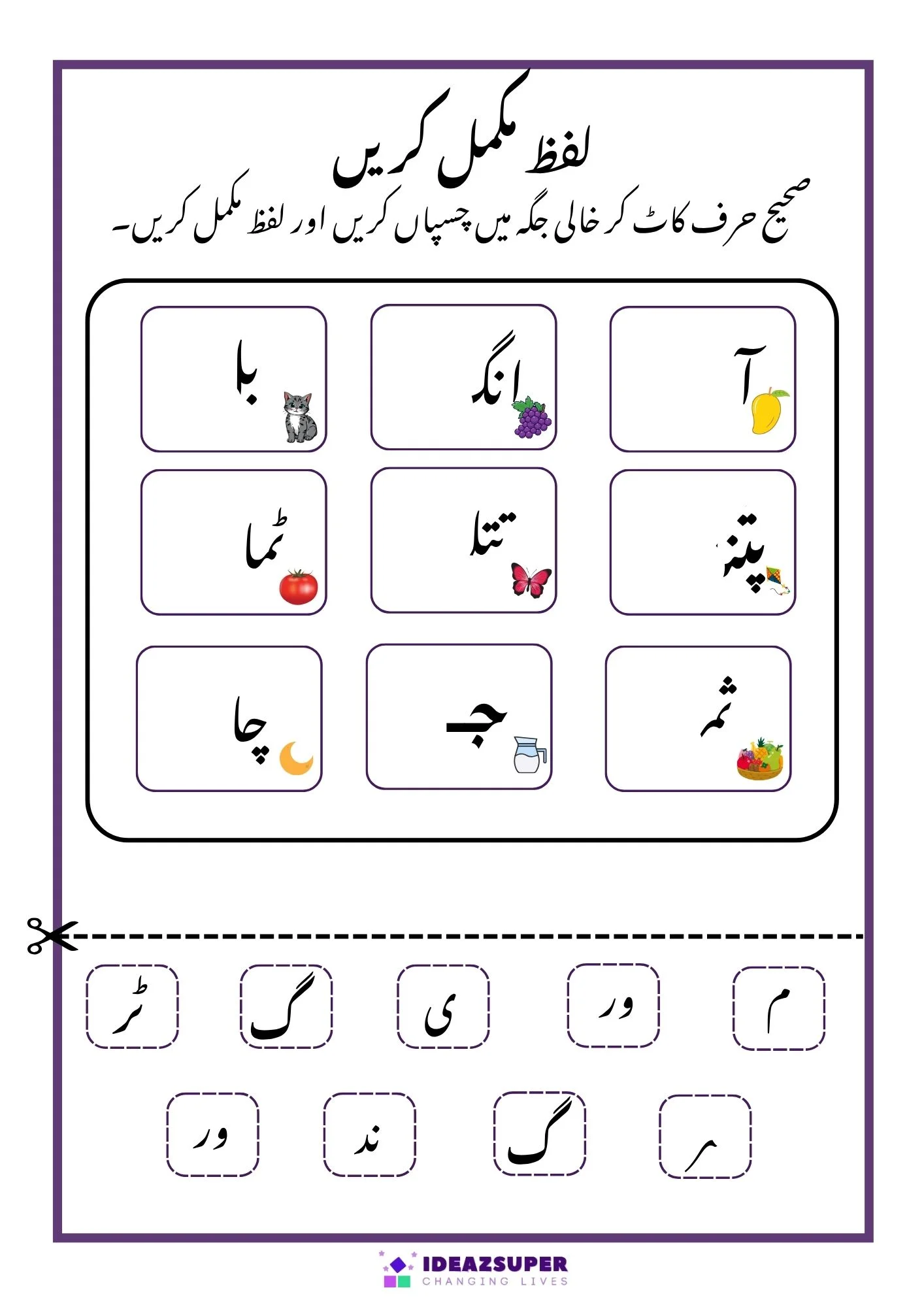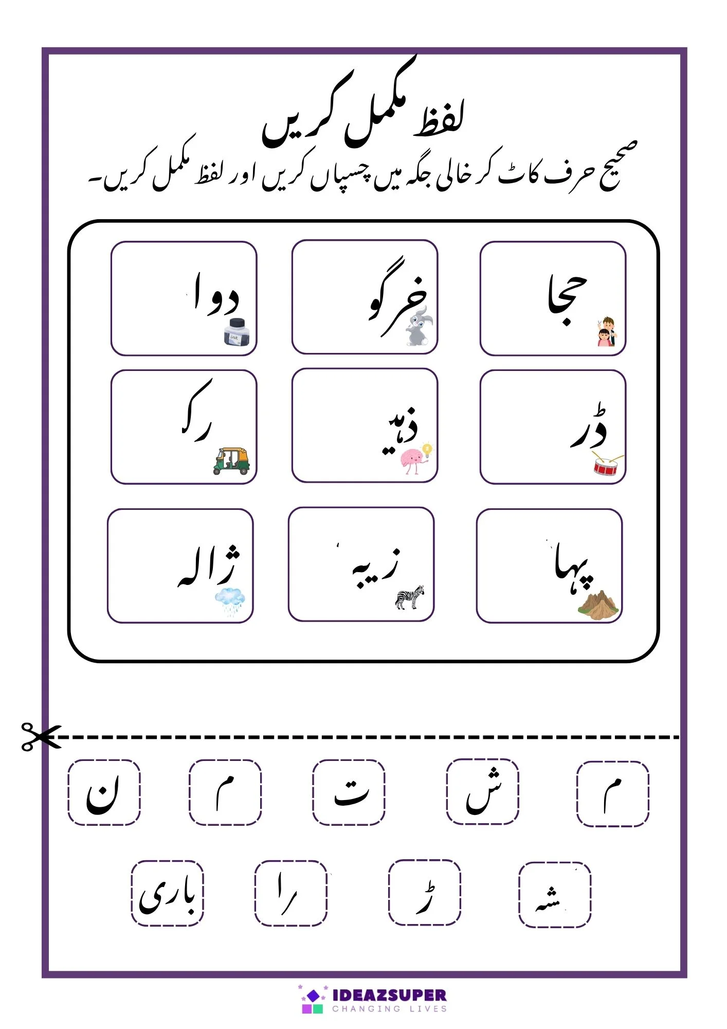 Kids learn to complete Urdu words by looking at a picture and pasting the correct missing letter. Each worksheet includes simple Urdu vocabulary suitable for beginners. This activity strengthens spelling, letter recognition, and picture-word association, making learning fun and interactive.