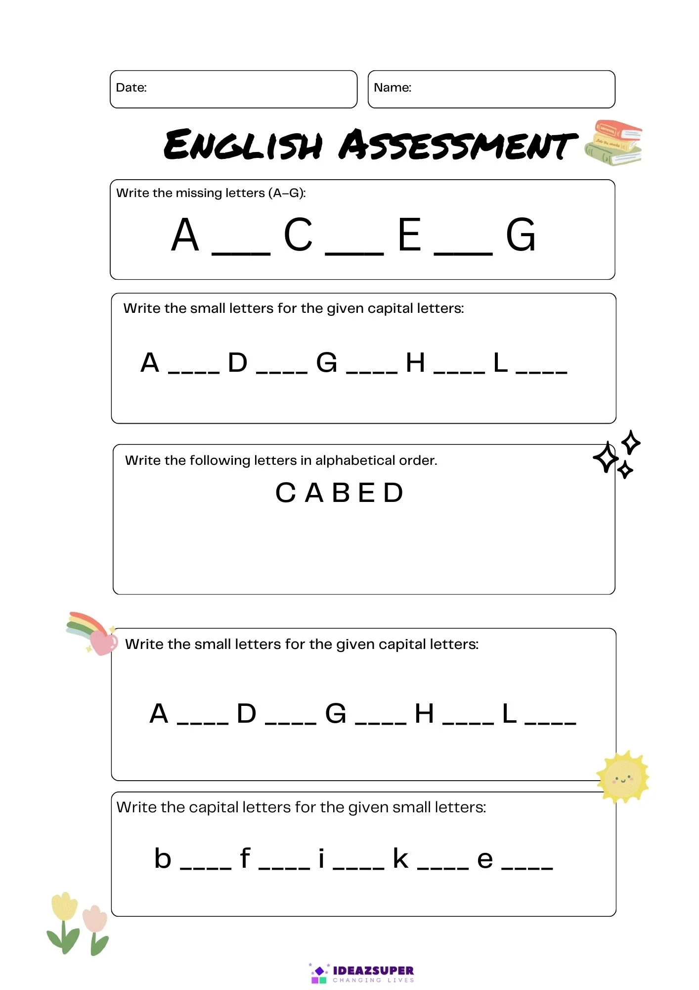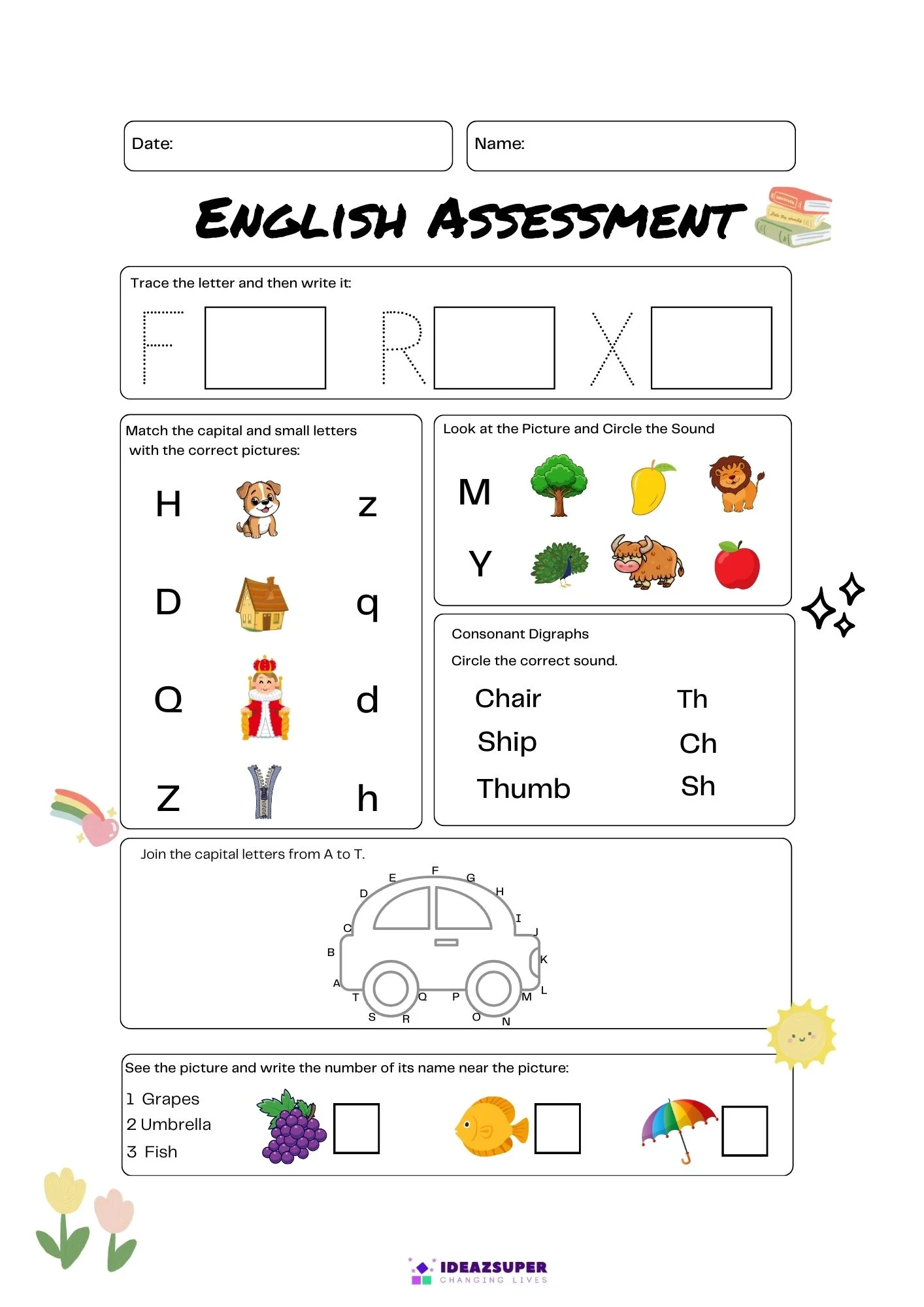 English admission test worksheets help 4–5 year old kids build early reading and writing skills while preparing for school admission assessments.