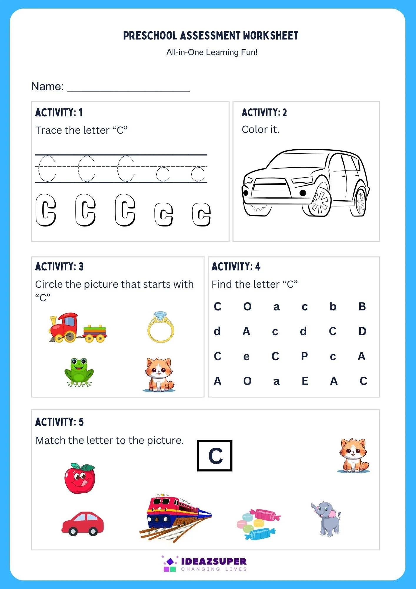 ✔️ Match the word with the picture – connect the image with the sound (e.g., C – Cat)