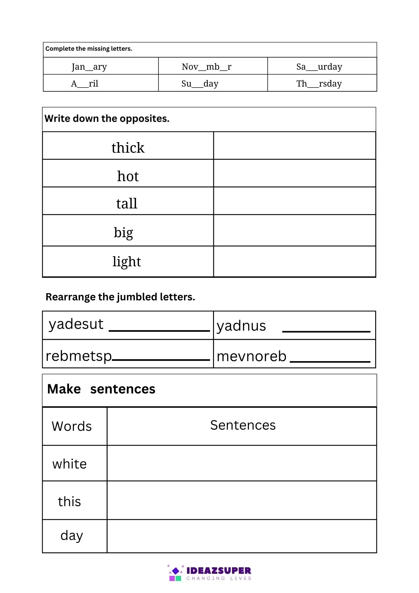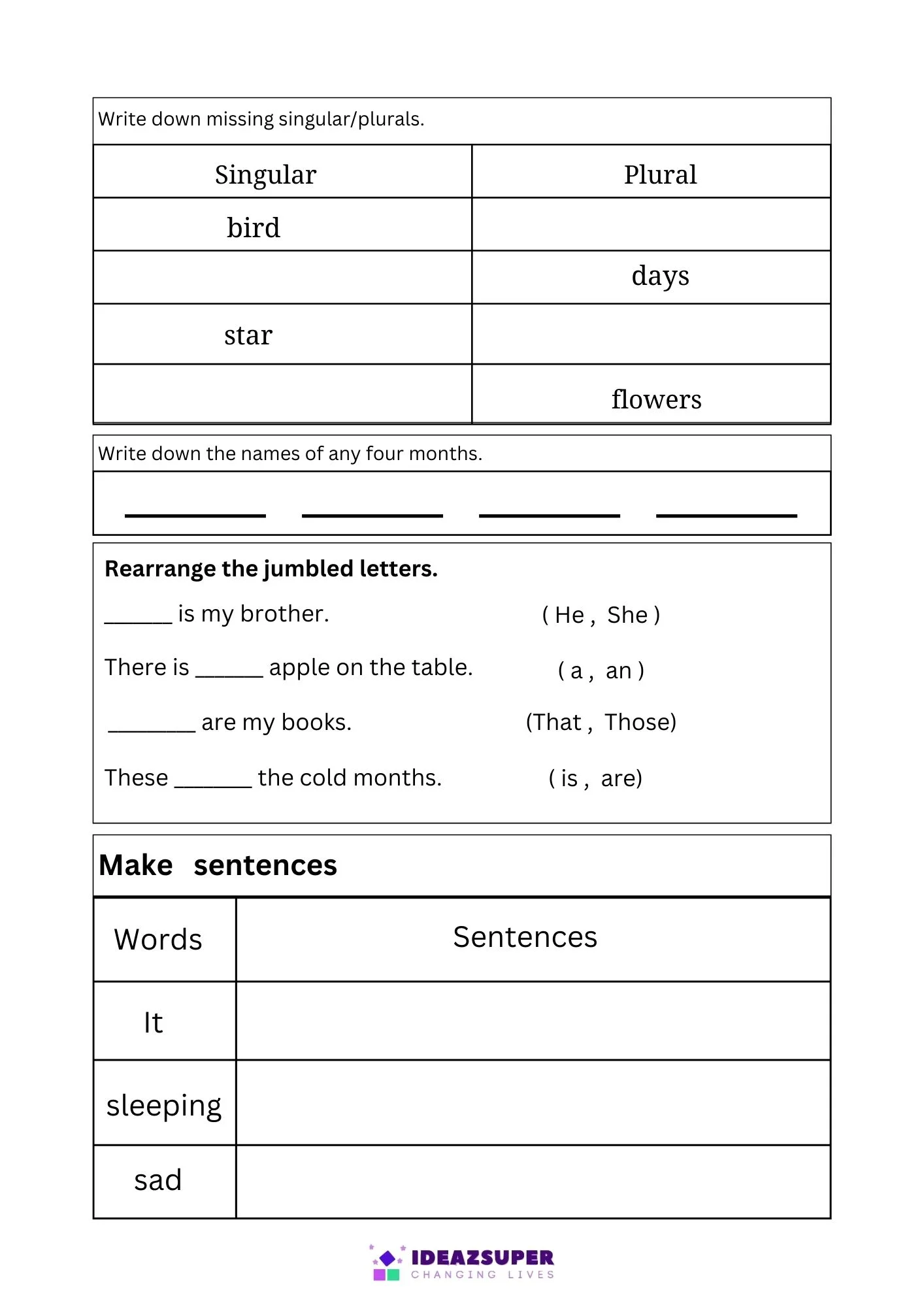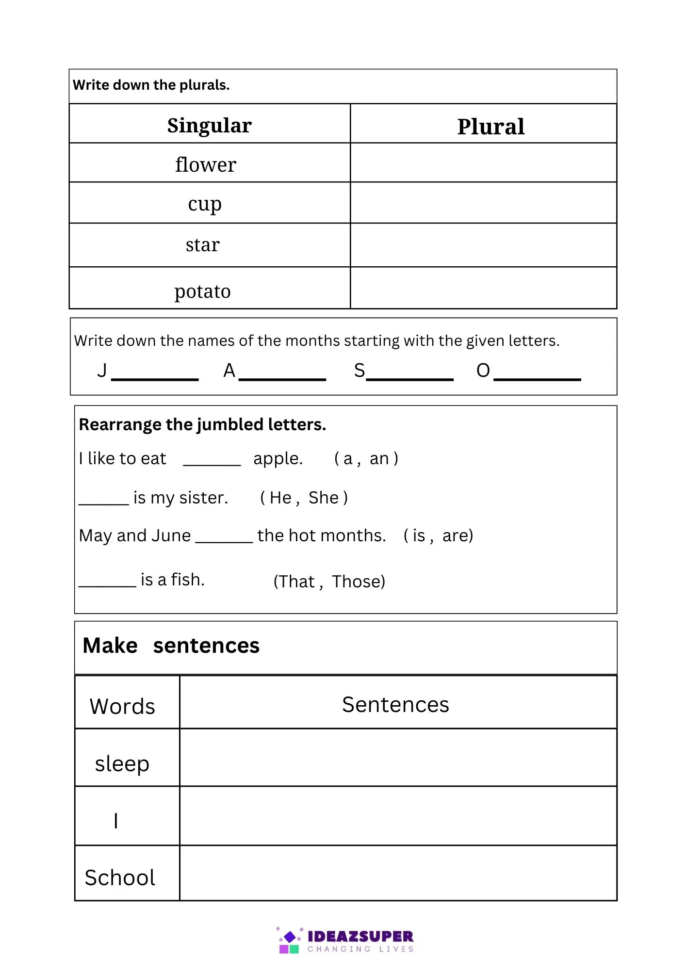 Activities include reading, phonics, sight words, sentence formation, and basic grammar using an exam-style format.