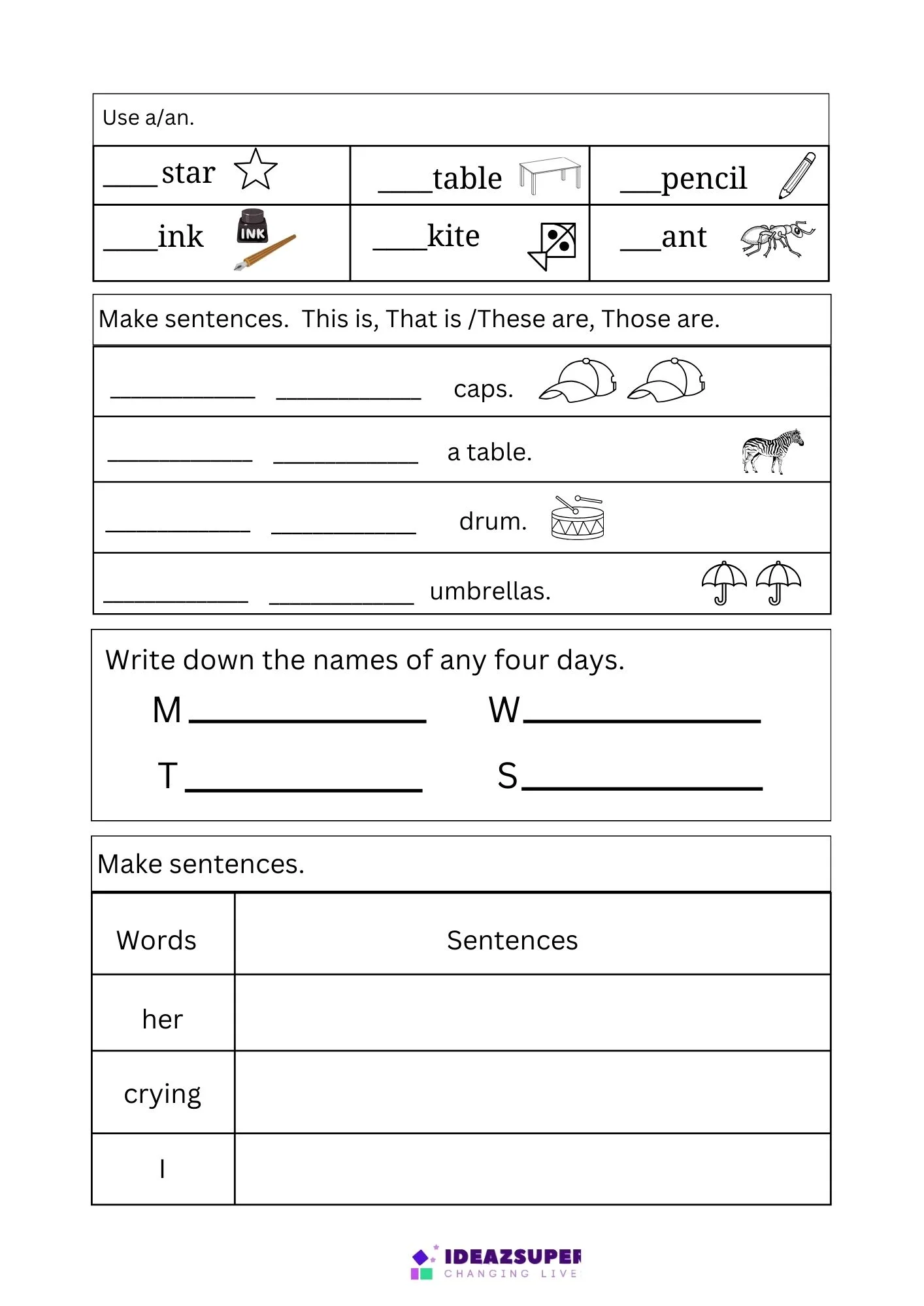 These English assessment worksheets are suitable for Montessori Advanced Prep, UKG, and Year 1 students (ages 5–6).