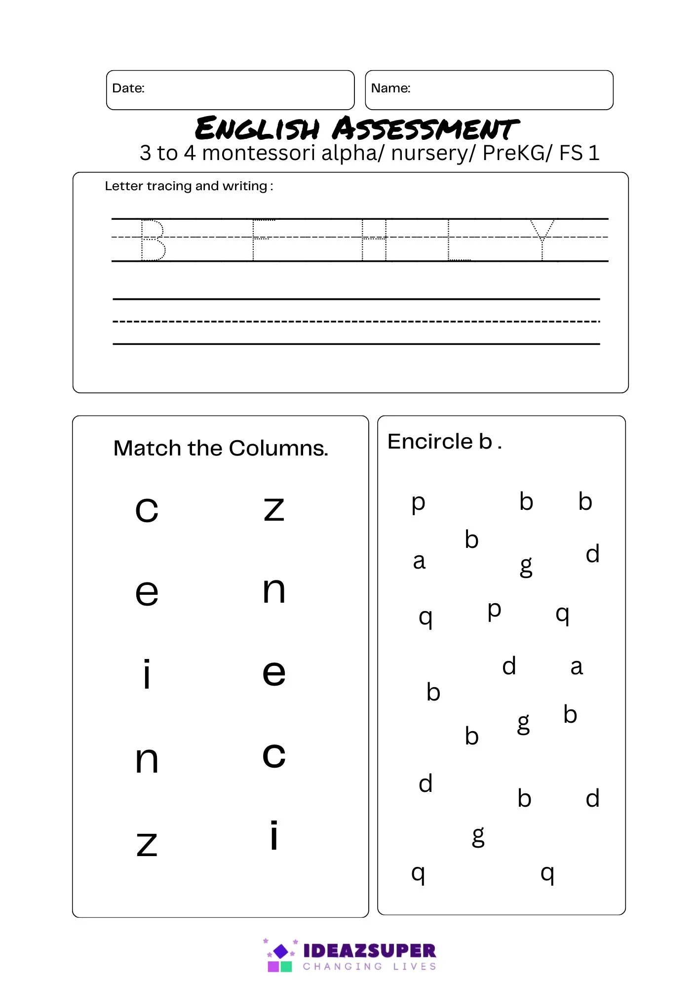 These English assessment worksheets for Pre-KG, Montessori, and FS-1 help young learners practice letters, phonics, matching, and basic concepts using an exam-pattern format.