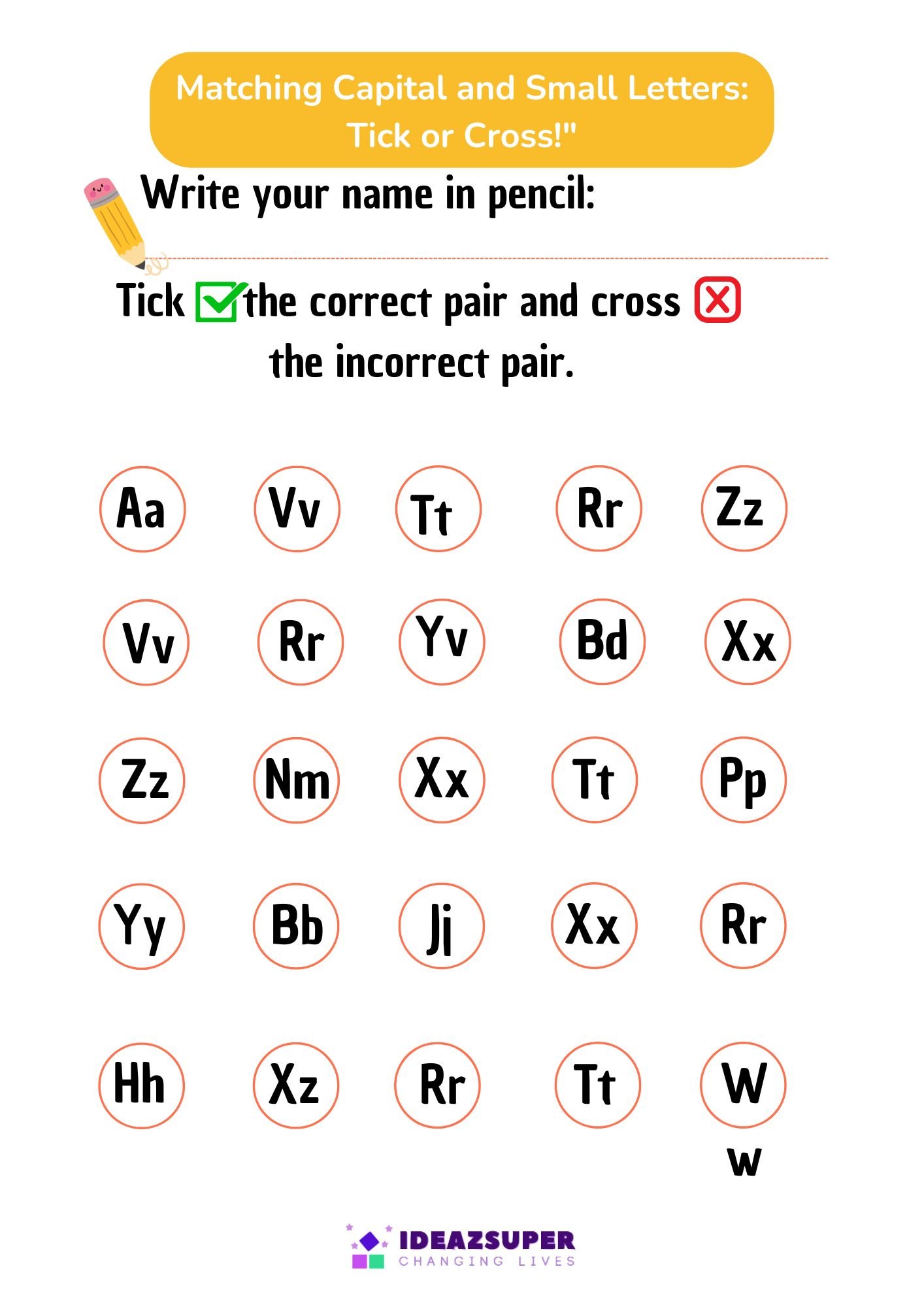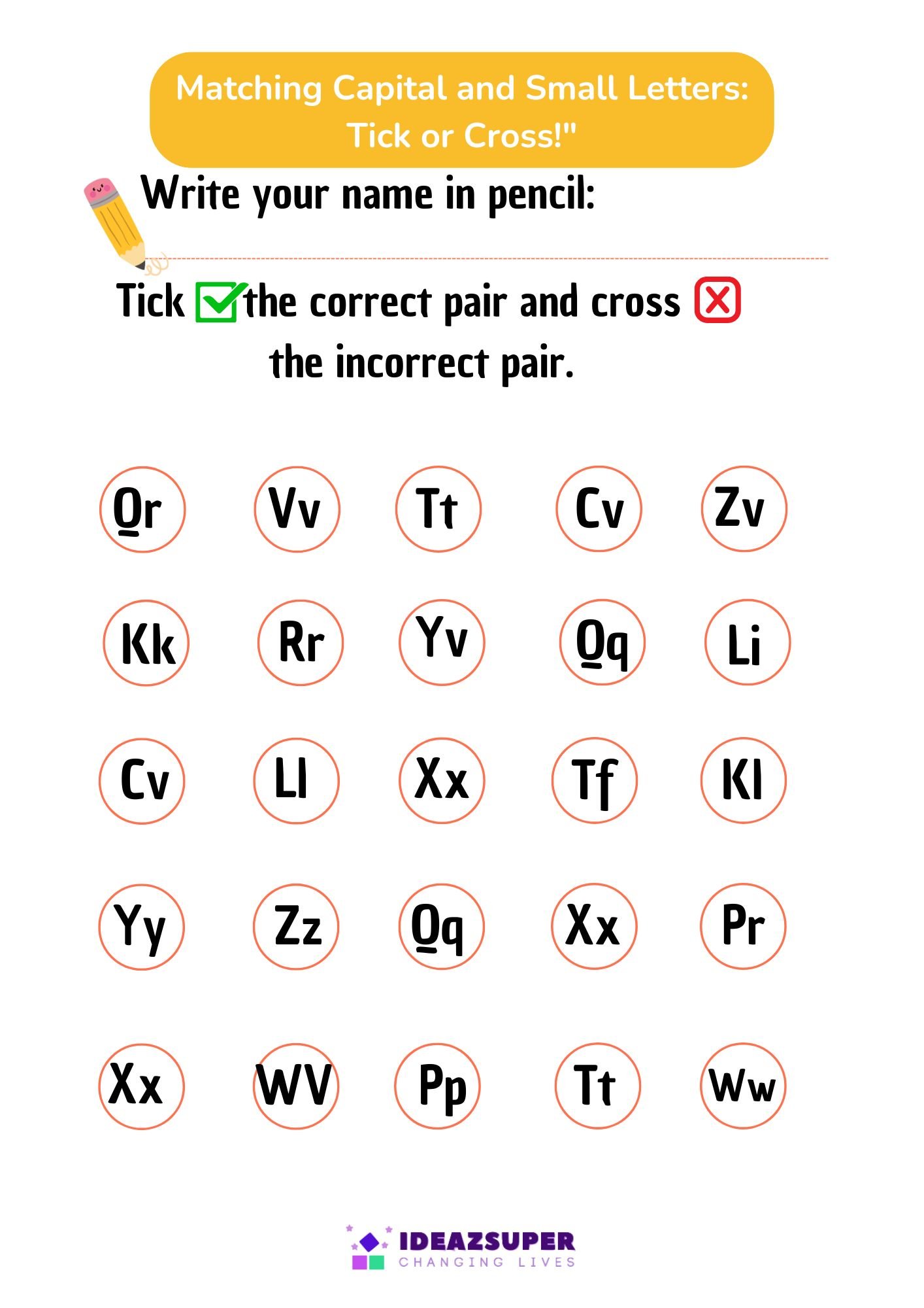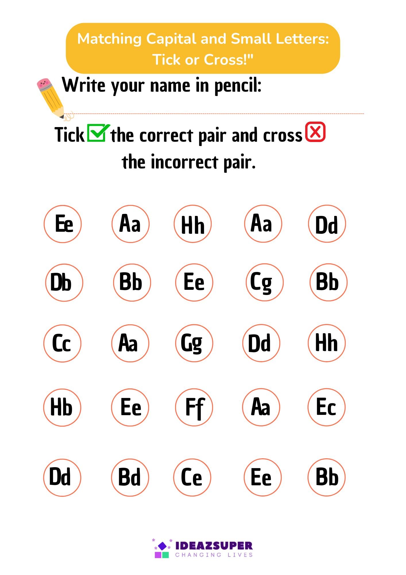 Make learning capital and small letters interactive with our Tick or Cross Worksheets. Designed for ages 3–6, these activities help children practice recognizing and connecting uppercase with their matching lowercase letters.