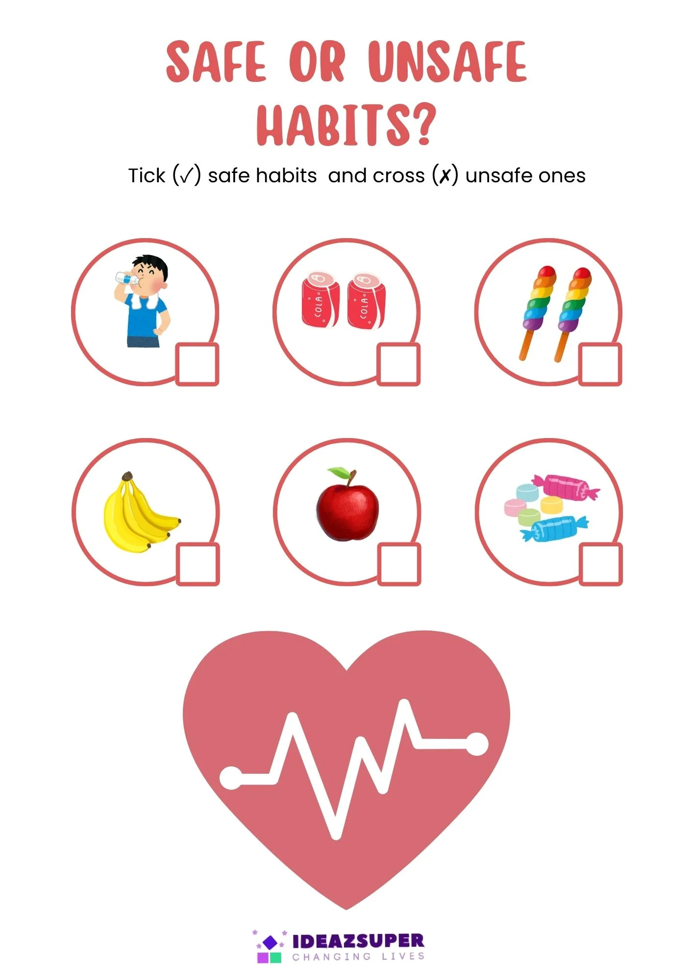 Teach children simple healthy habits like eating well and staying active through fun worksheets.