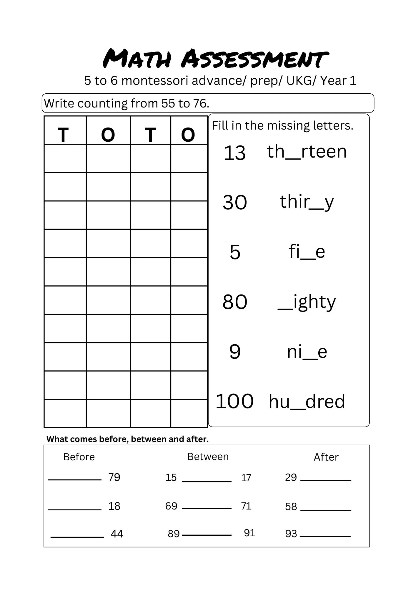 These Math assessment worksheets are designed for Montessori Advanced Prep, UKG, and Year 1 children (ages 5–6).