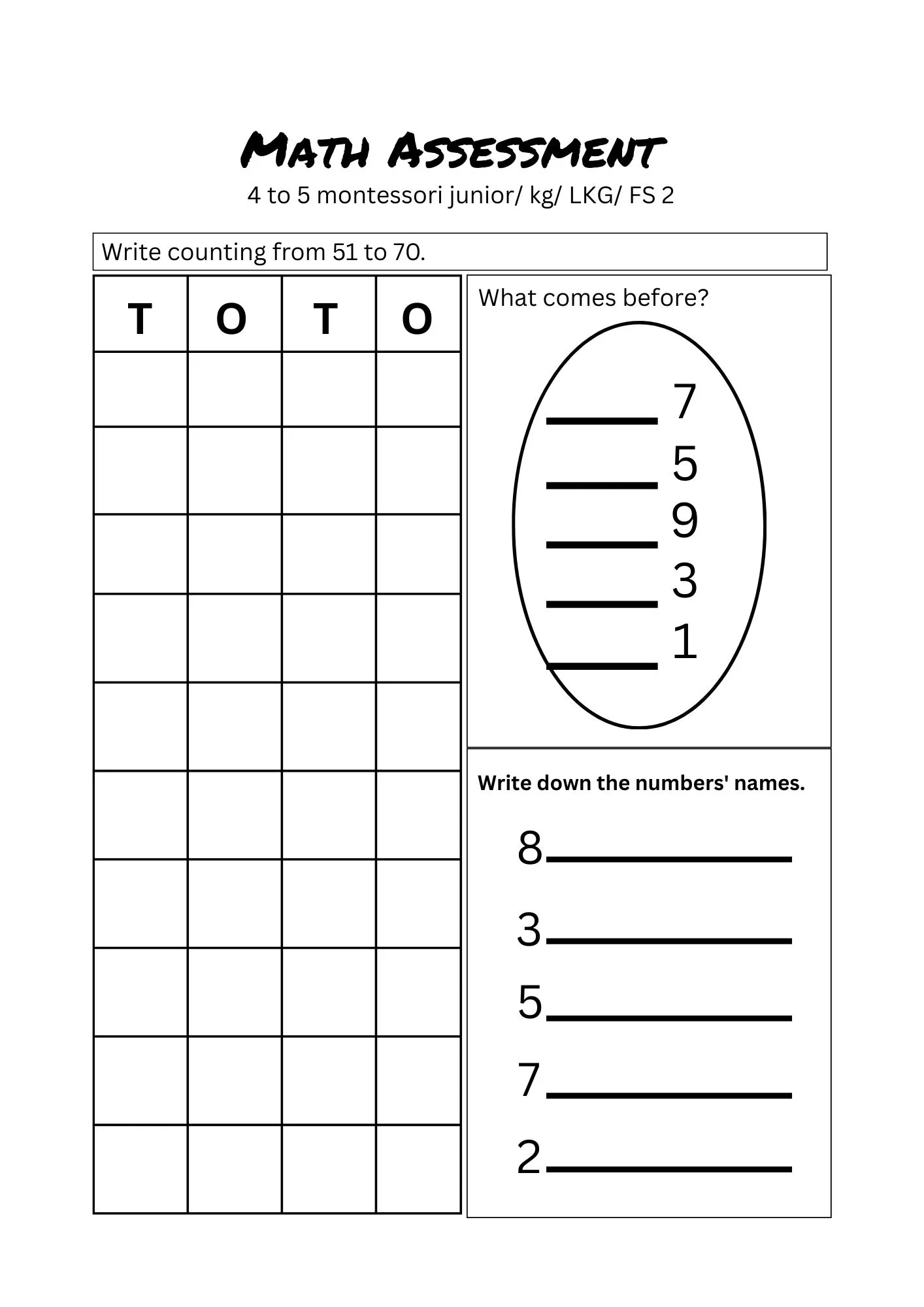 These Math assessment worksheets are designed for Montessori, Junior KG, LKG, and FS-2 children to practice numbers, counting, shapes, and basic math concepts.