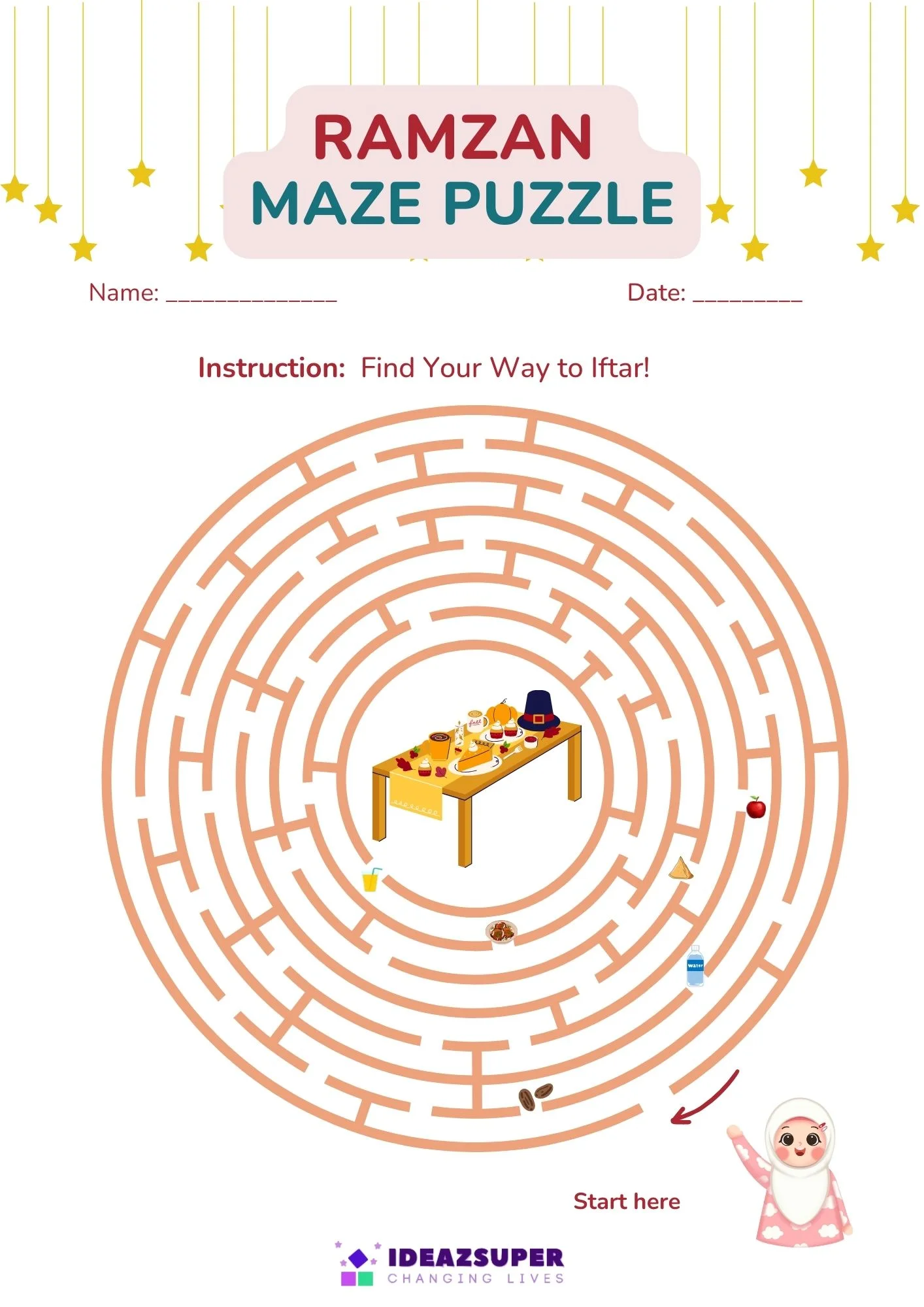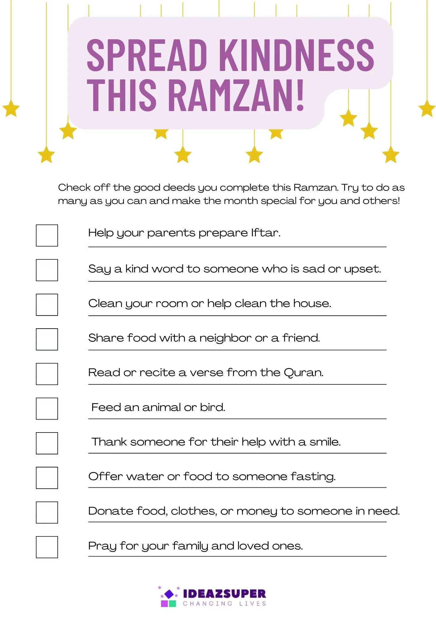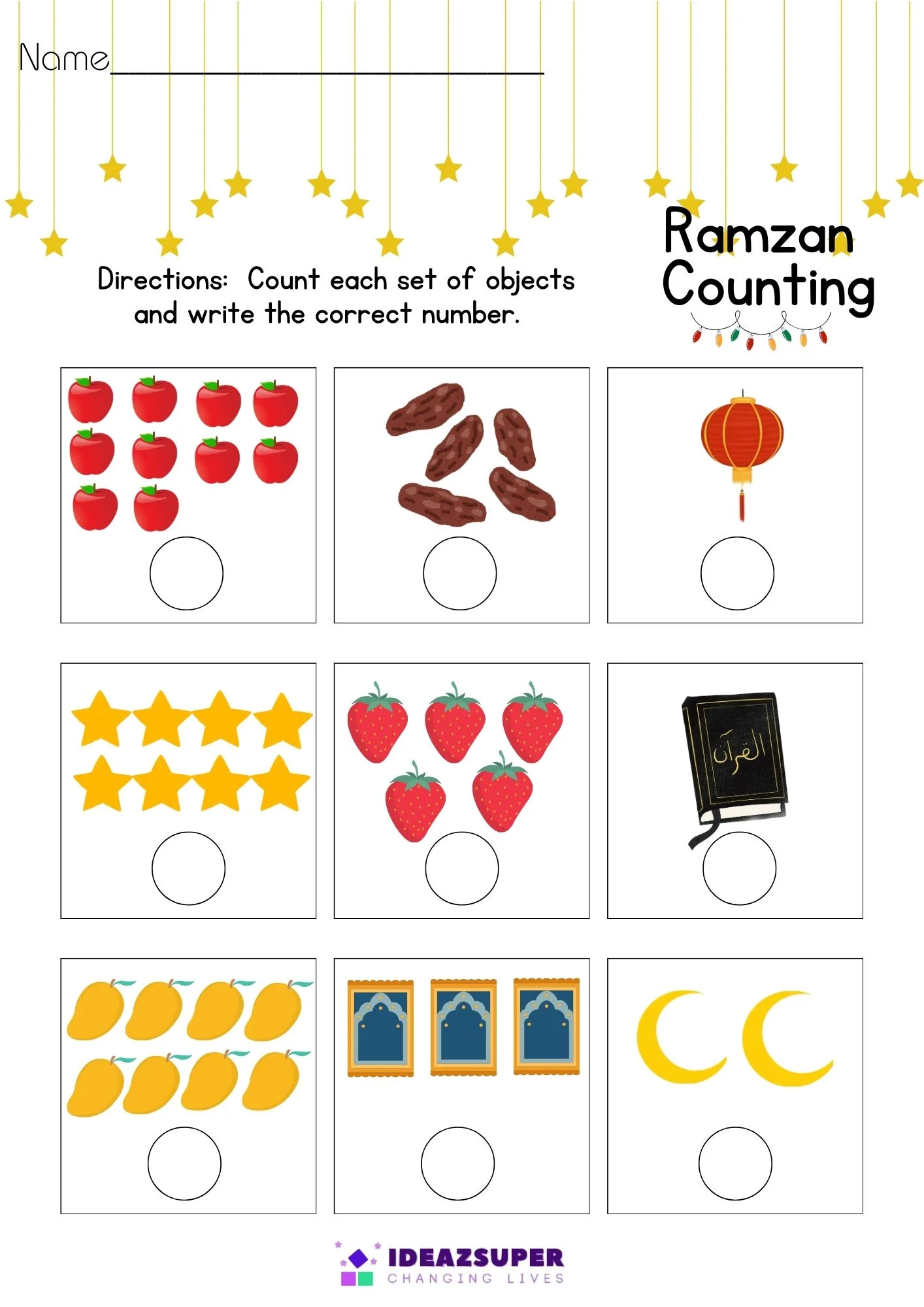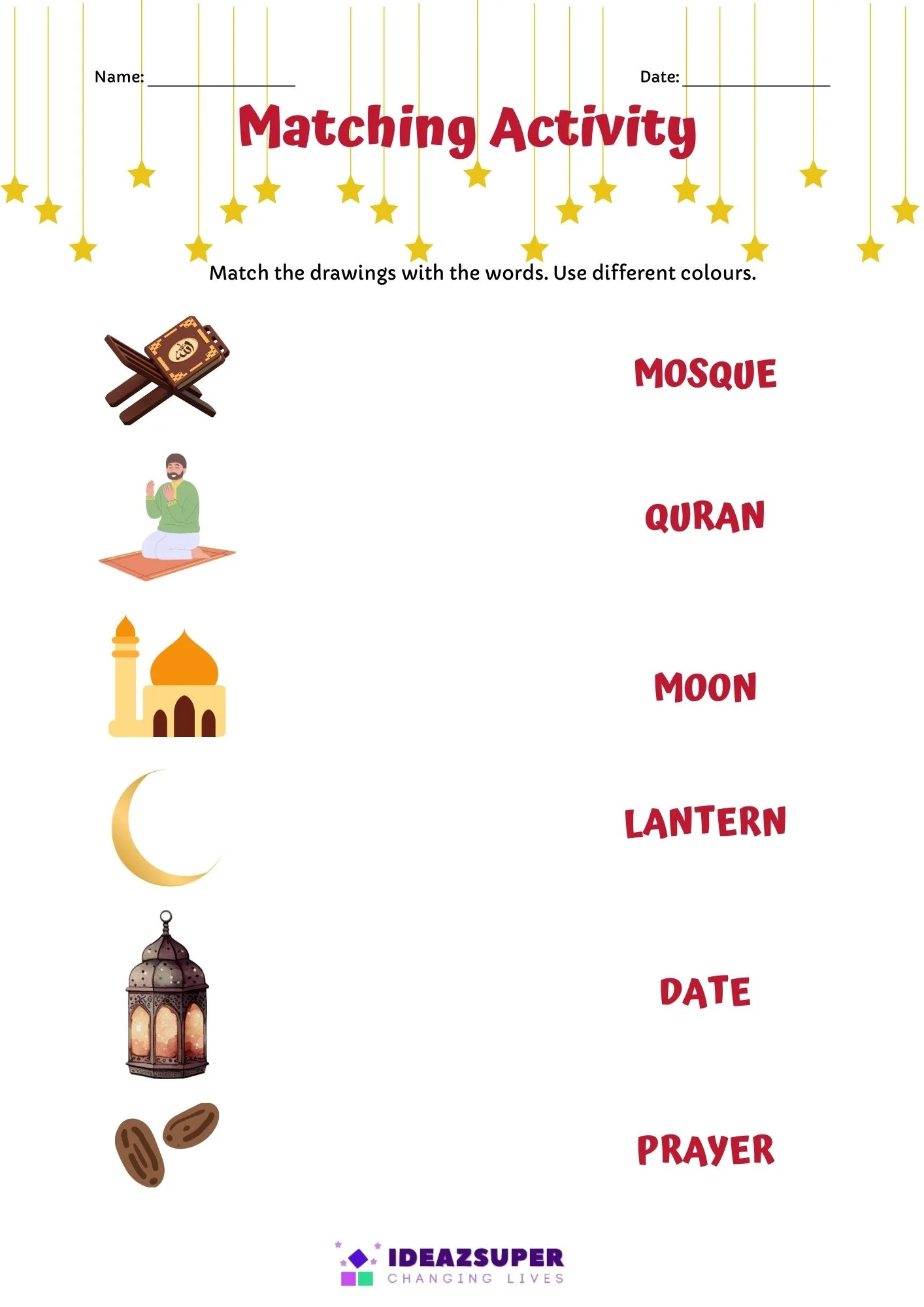 Ramadan worksheets help kids learn Islamic values such as patience, kindness, sharing, prayer, and good deeds using fun and age-uitable activities.