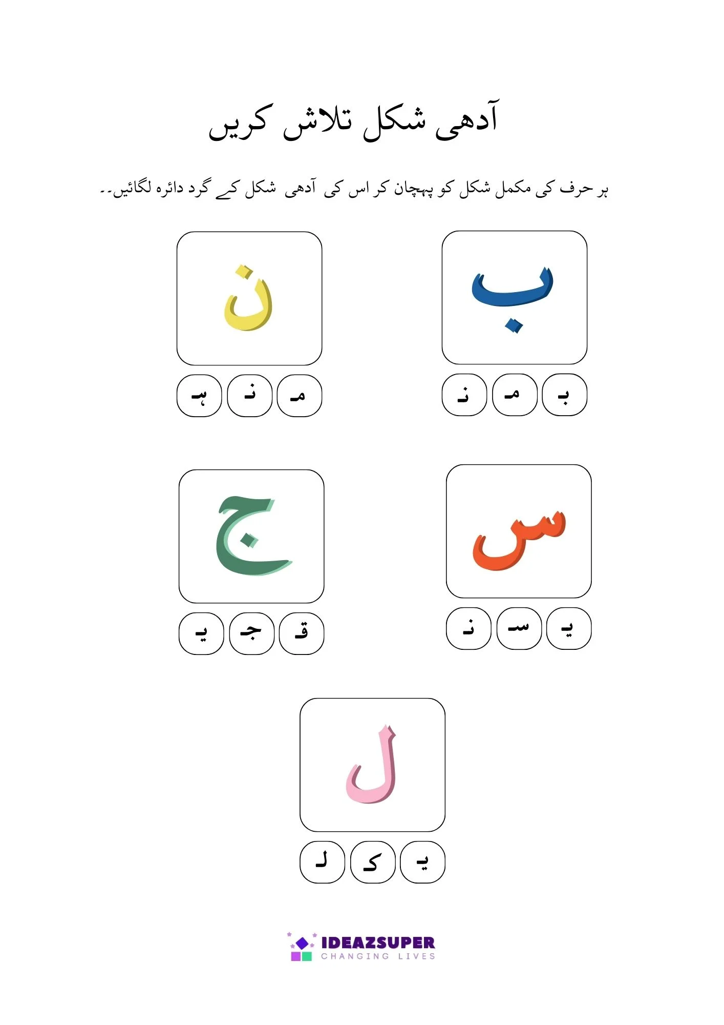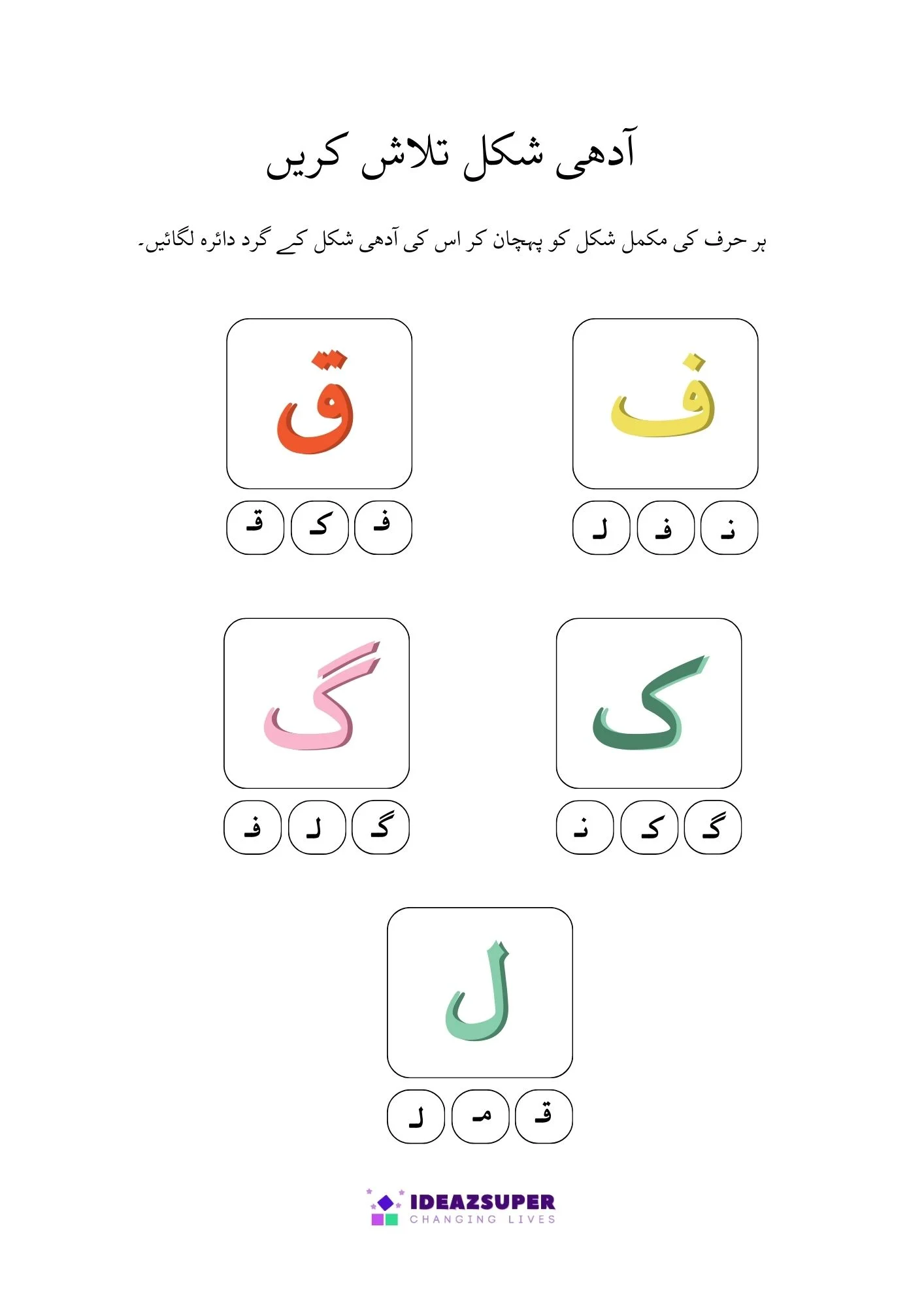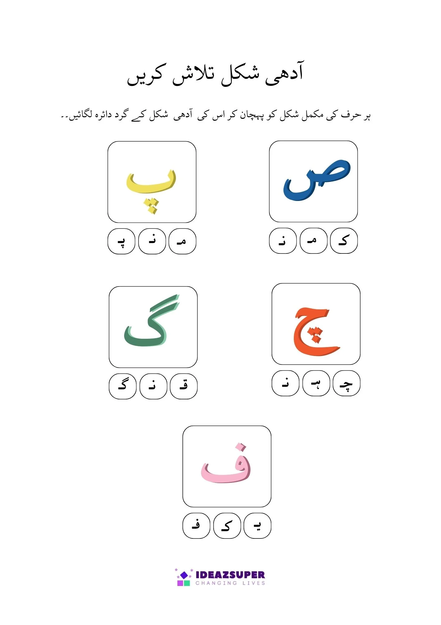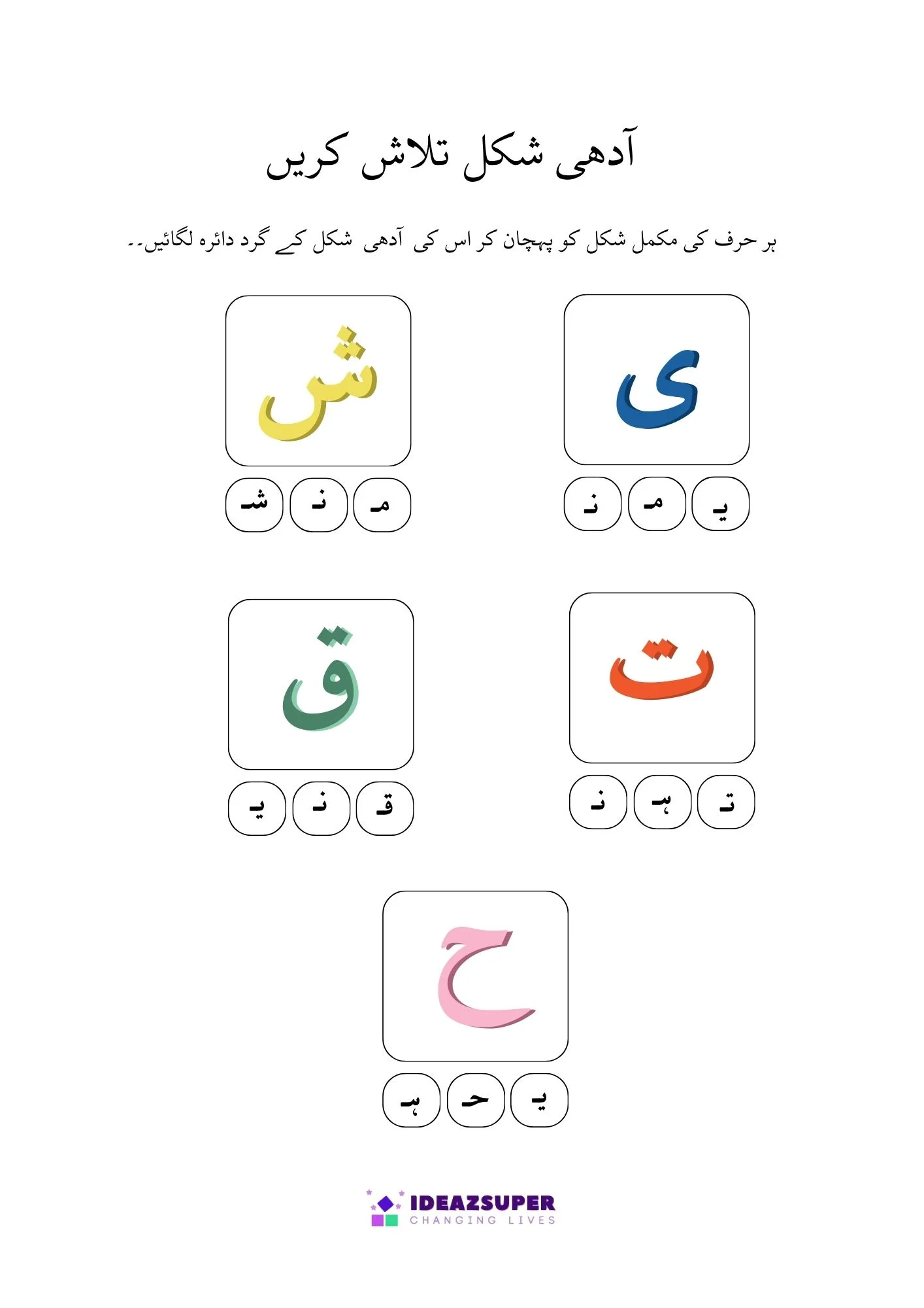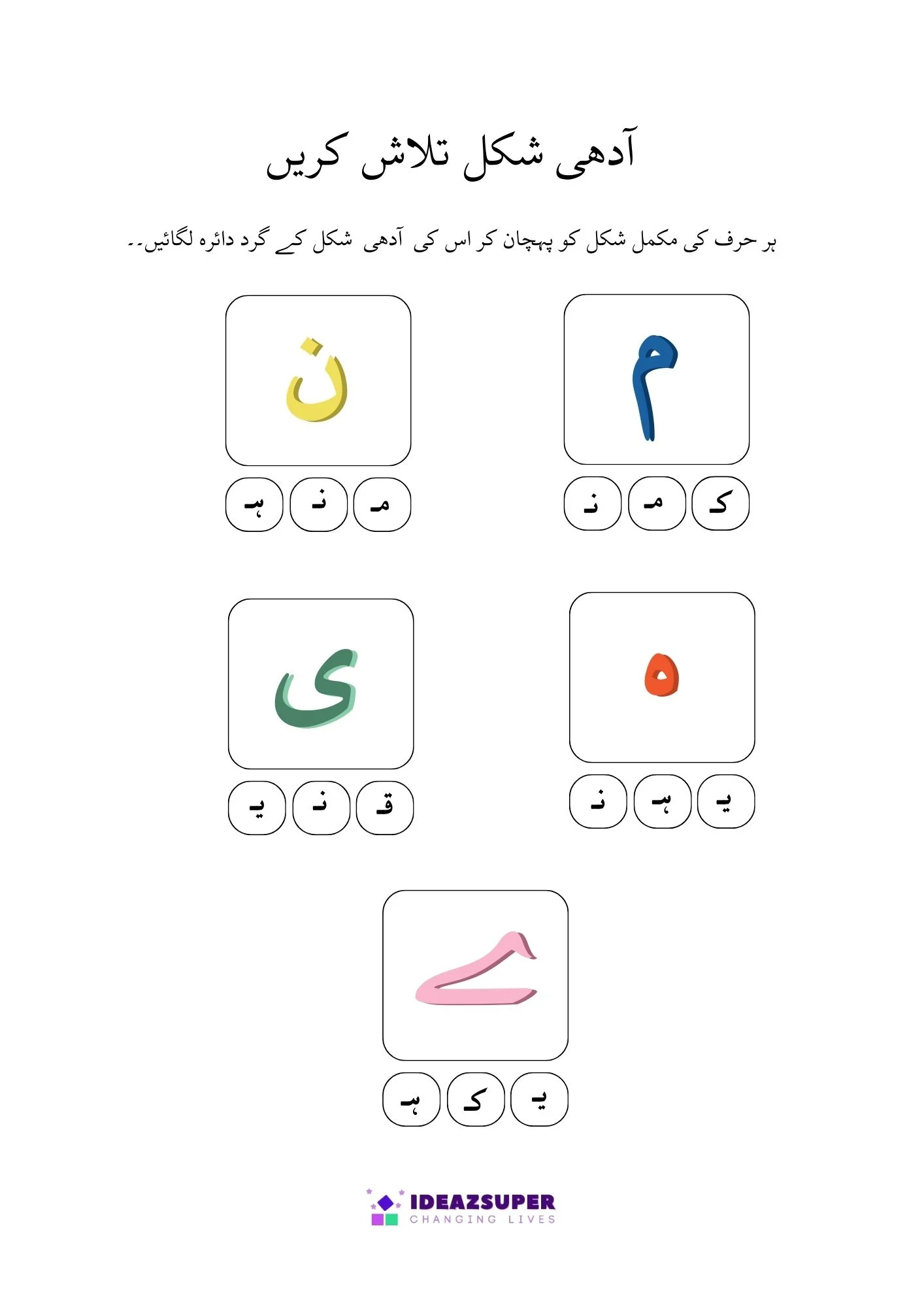 This worksheet helps young learners practice Urdu letter recognition through fun activities. Children will find and circle the correct Adhi Ashkaal (half shapes) and match them with Mukammal Huroof (complete letters). A simple and engaging worksheet designed for preschool and kindergarten kids.