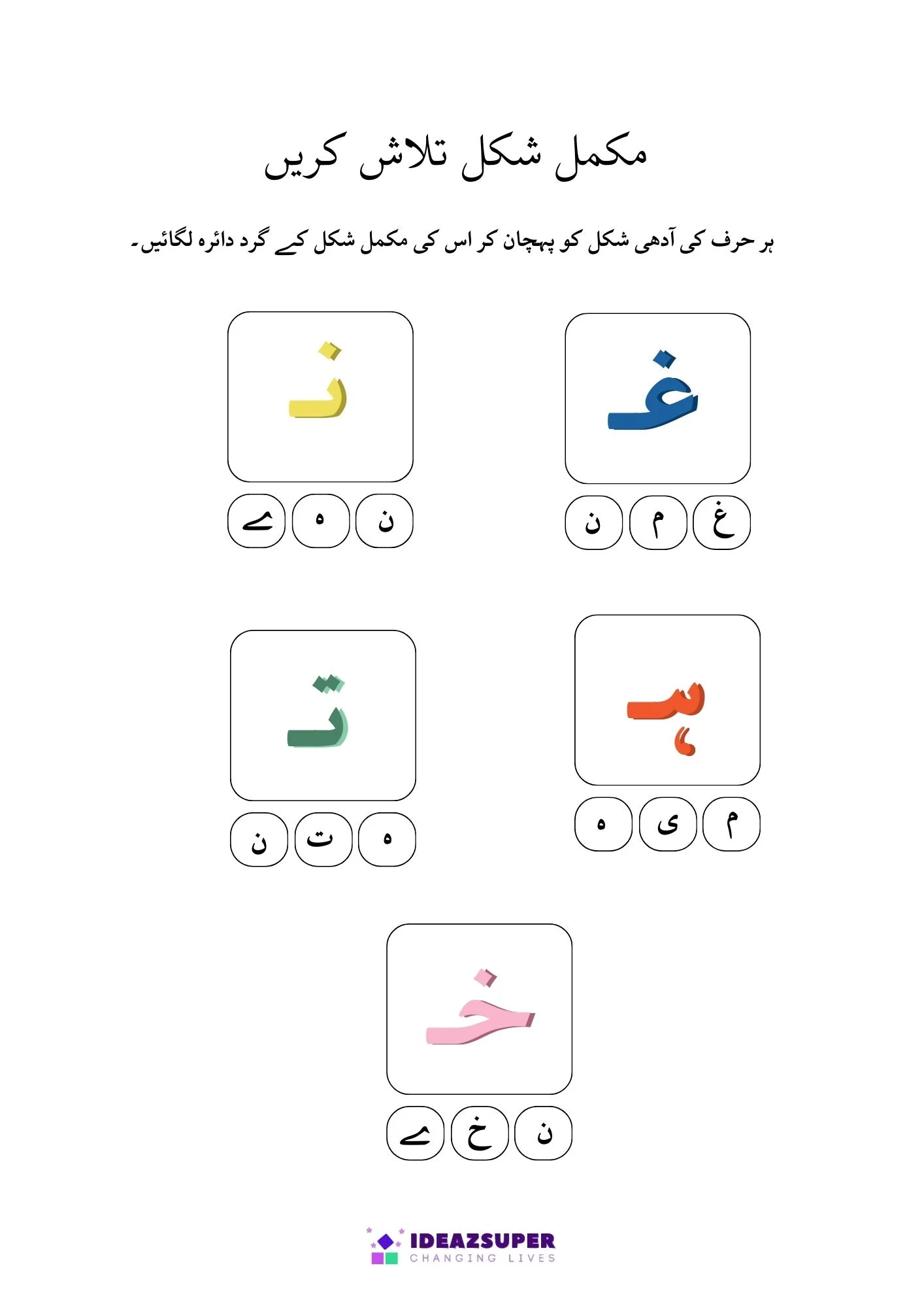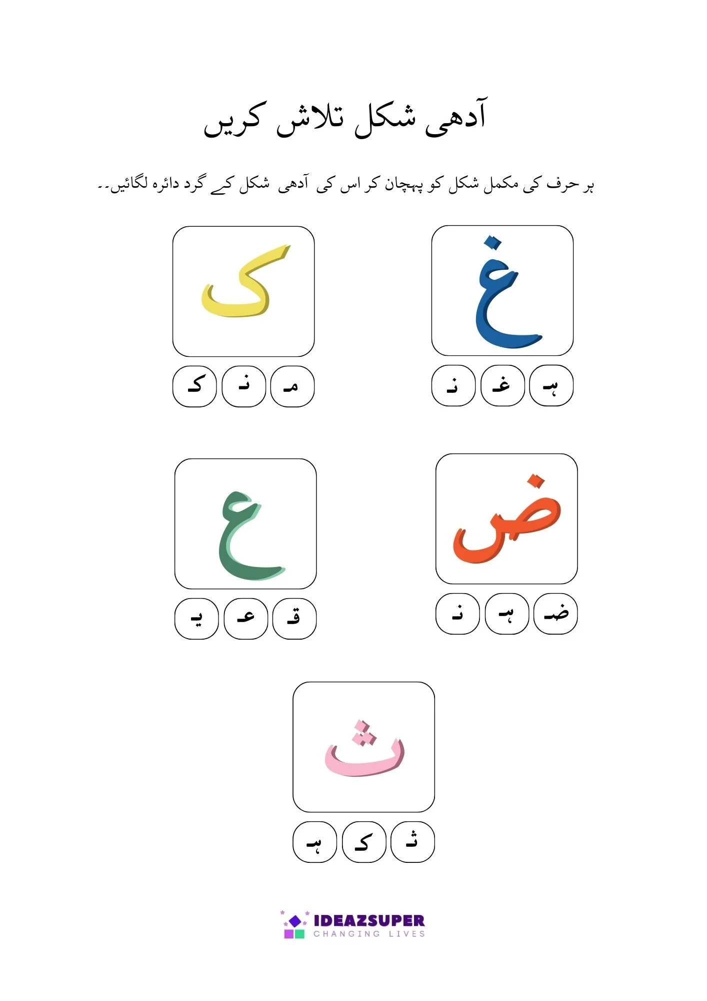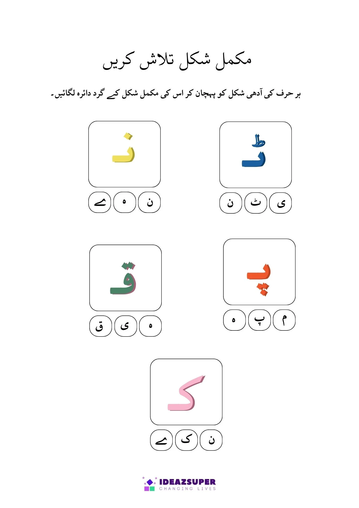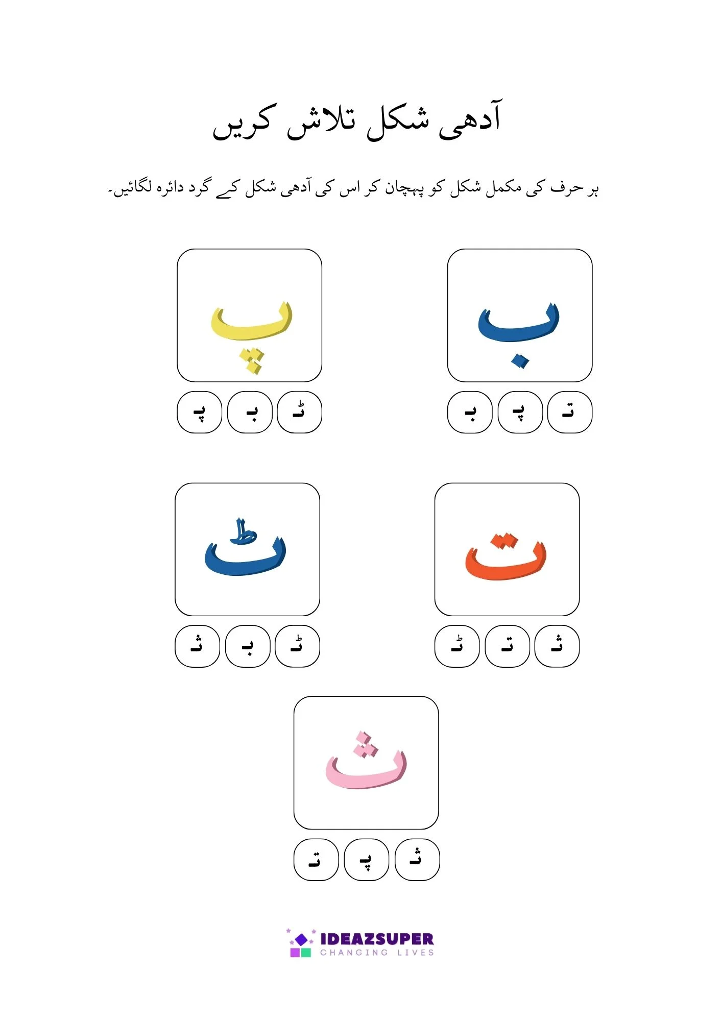 This worksheet helps young learners practice Urdu letter recognition through fun activities. Children will find and circle the correct Adhi Ashkaal (half shapes) and match them with Mukammal Huroof (complete letters). A simple and engaging worksheet designed for preschool and kindergarten kids.