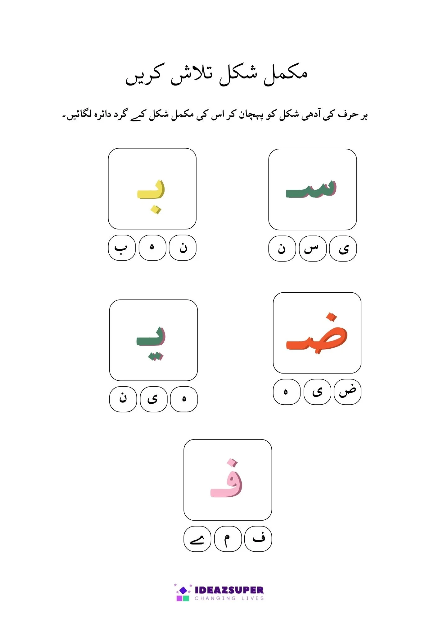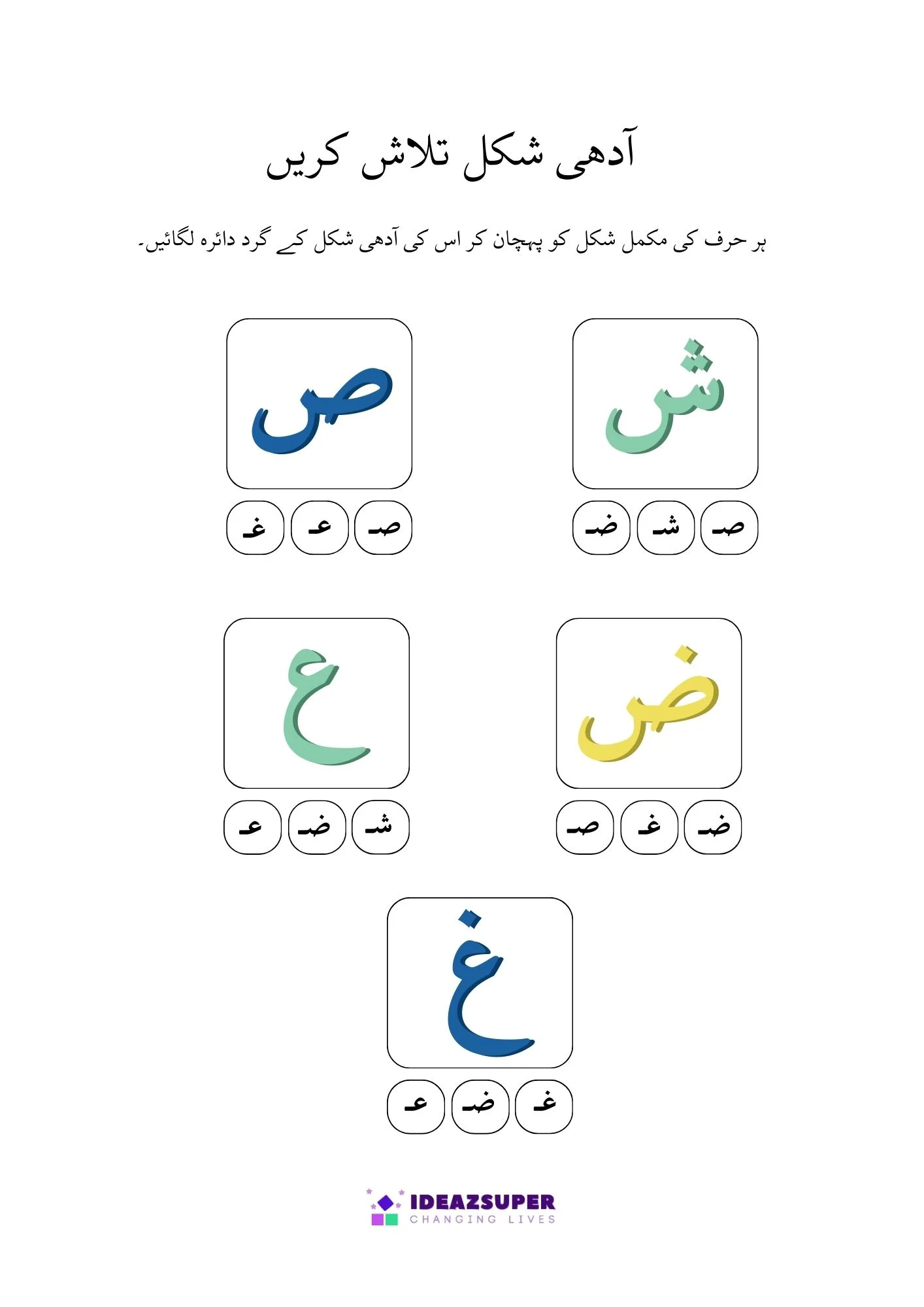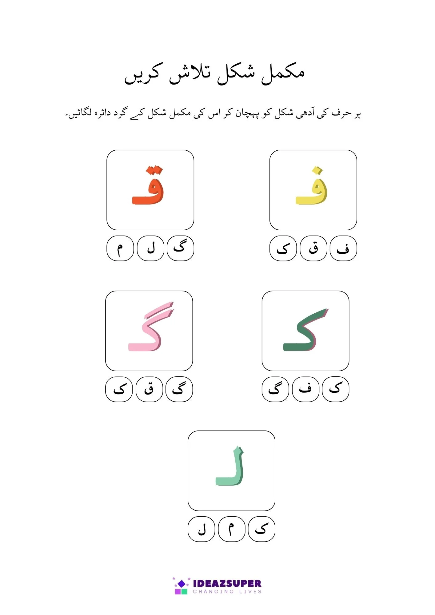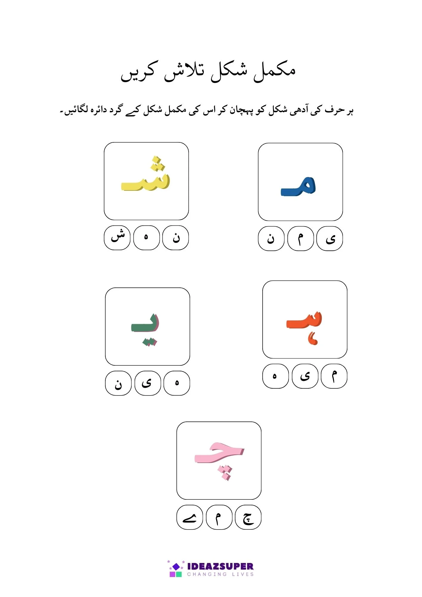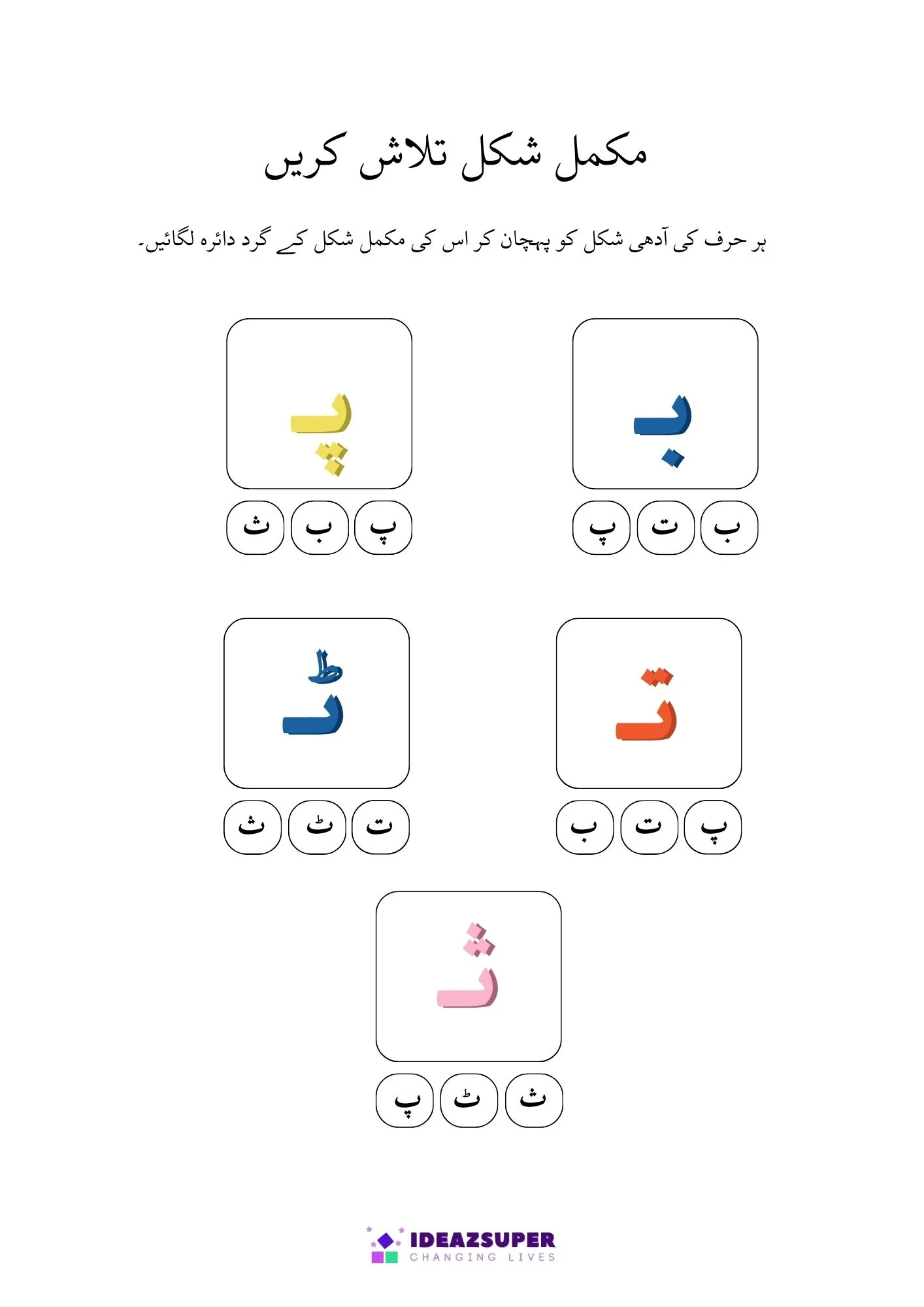 This worksheet helps young learners practice Urdu letter recognition through fun activities. Children will find and circle the correct Adhi Ashkaal (half shapes) and match them with Mukammal Huroof (complete letters). A simple and engaging worksheet designed for preschool and kindergarten kids.