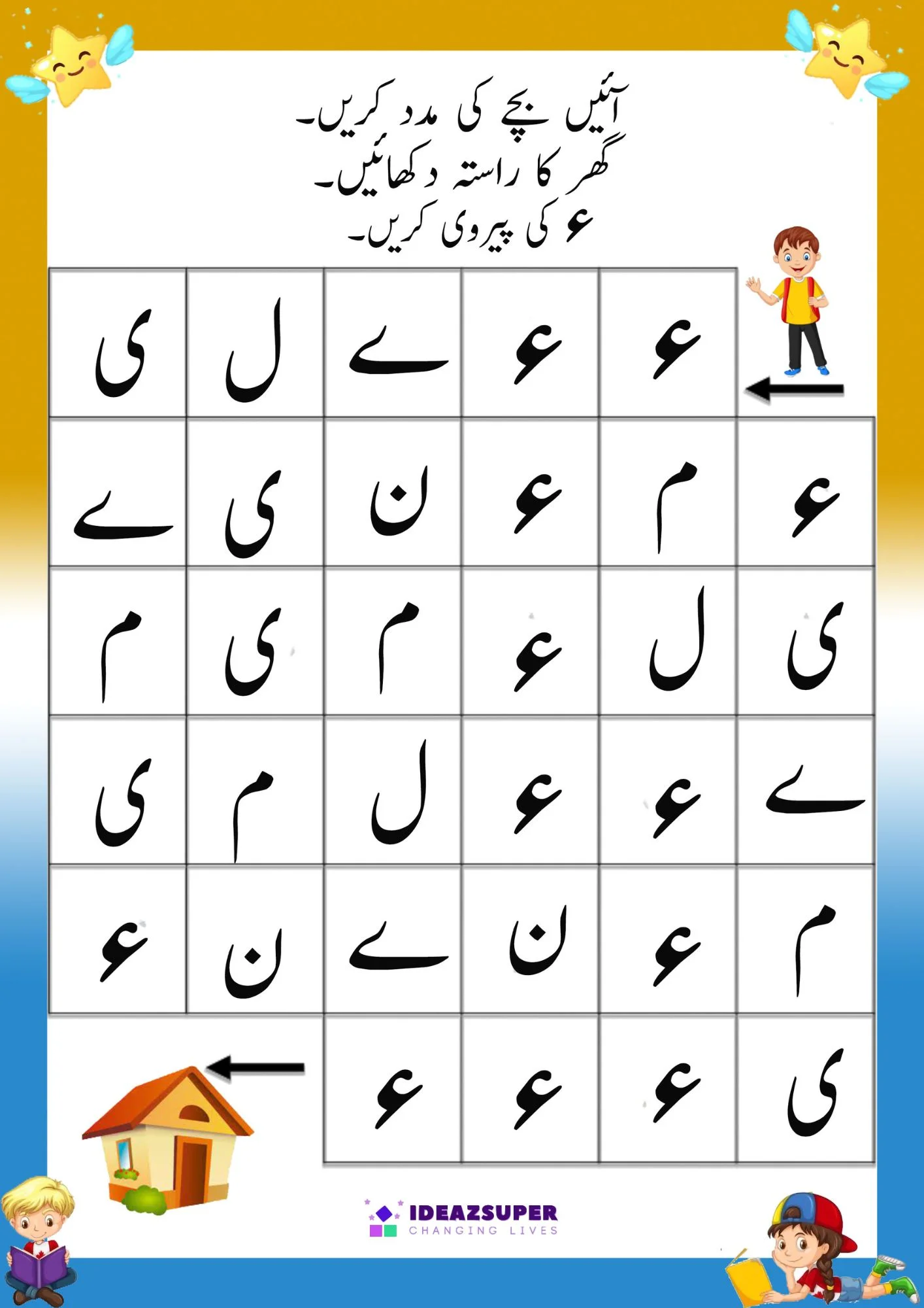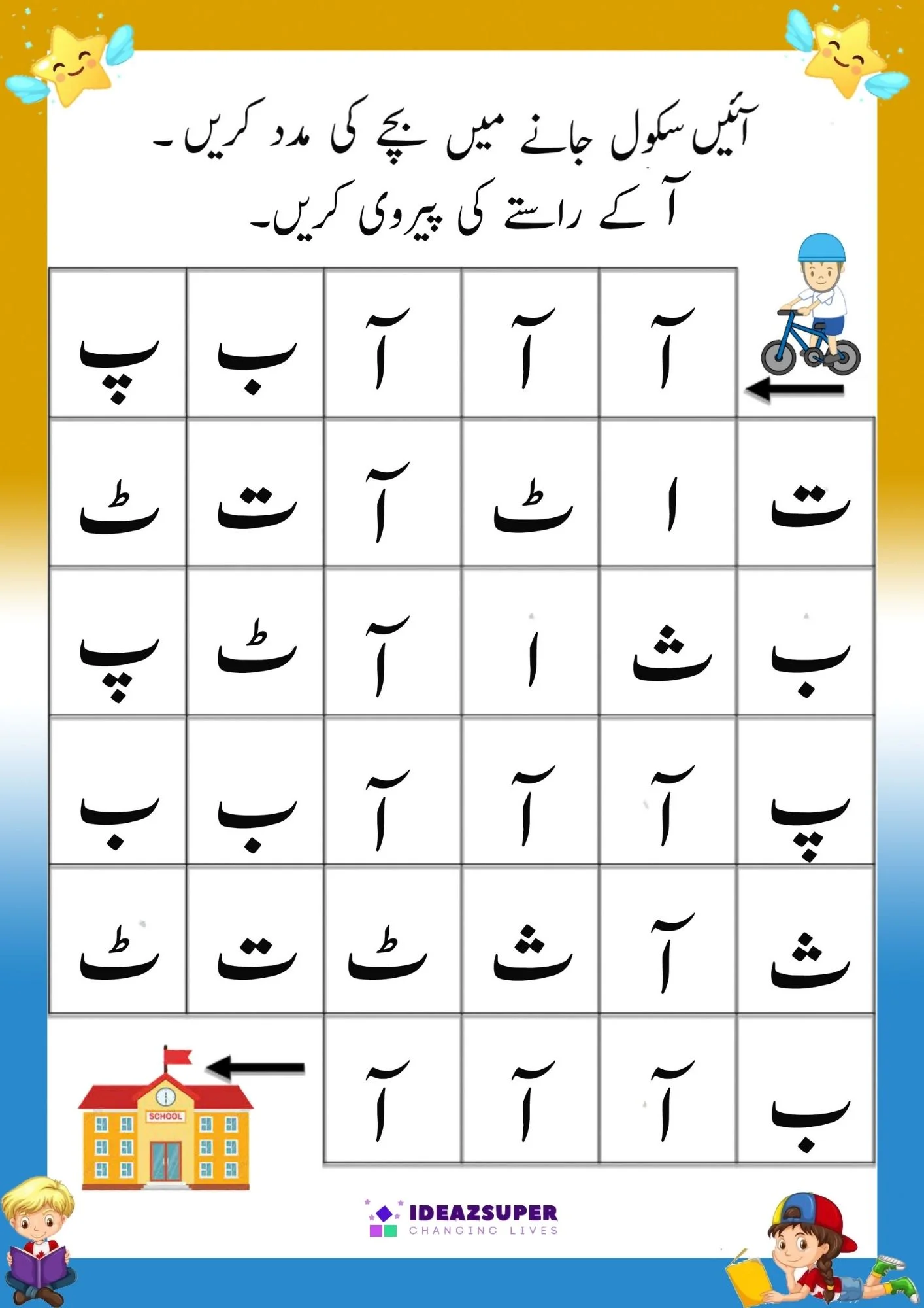Turn Urdu letter recognition into an adventure with these maze-style worksheets. Children aged 2–5 trace through a grid to find a path connecting target Urdu letters. This engaging format combines letter ID practice with critical thinking, making early learning playful and interactive.