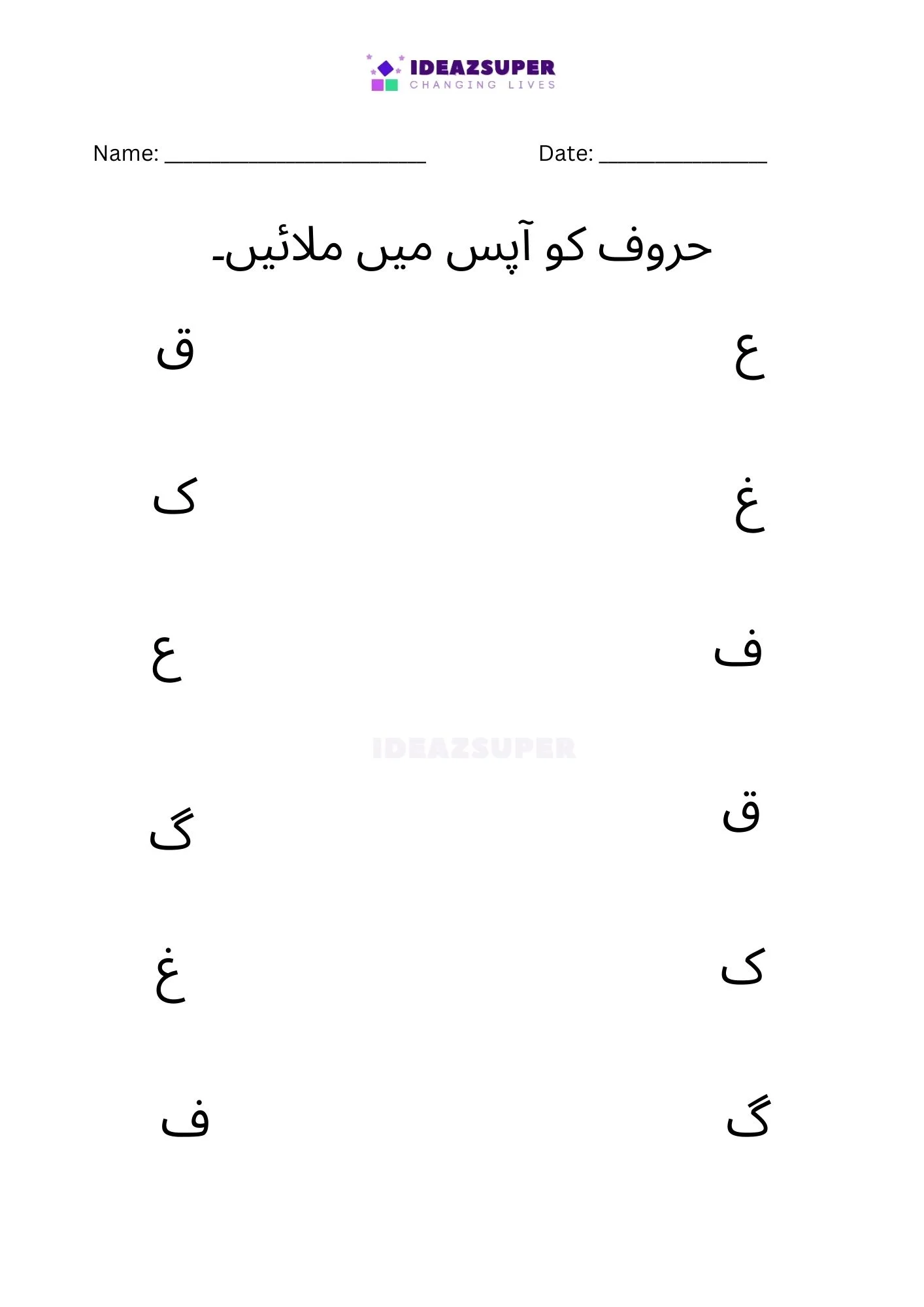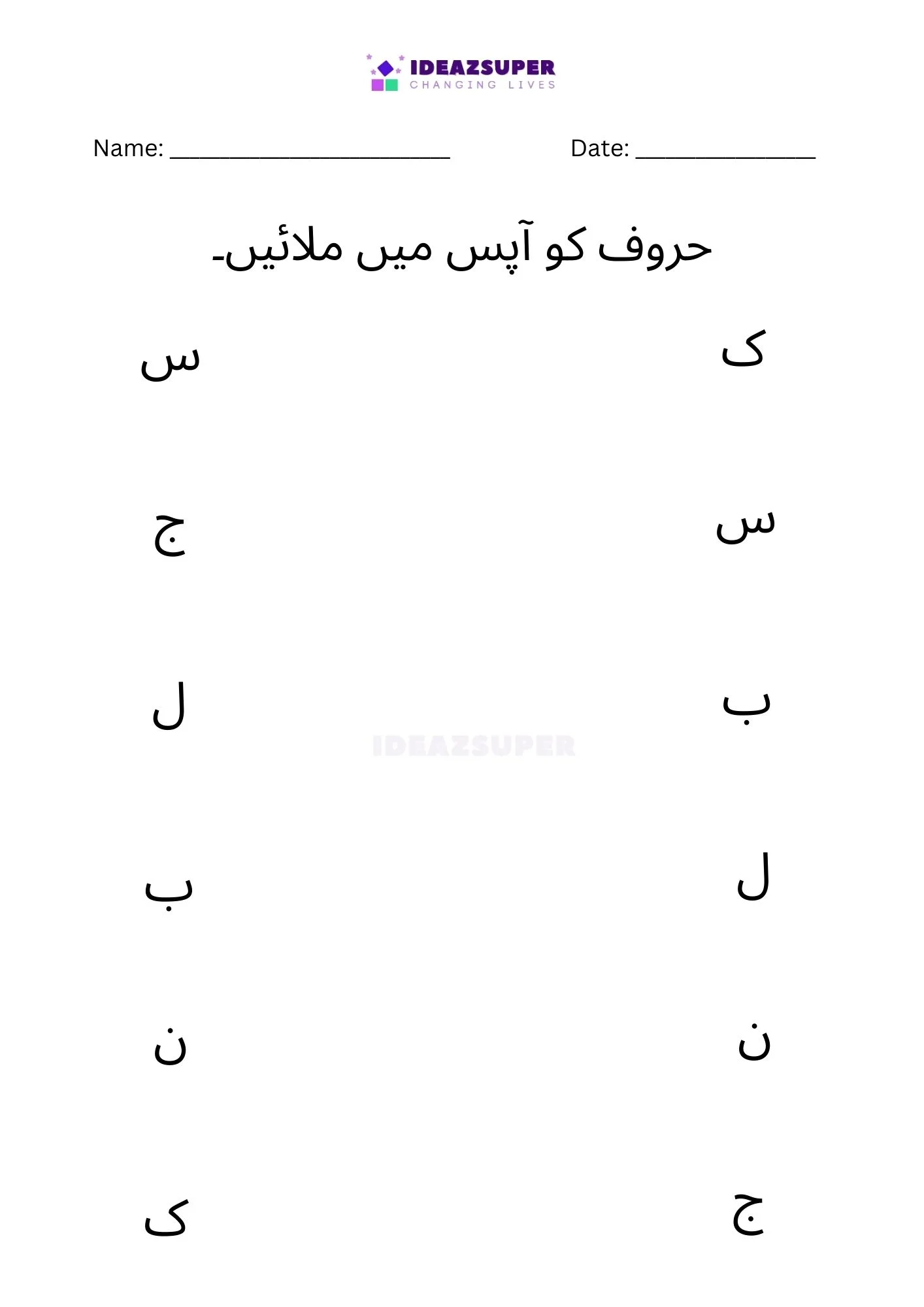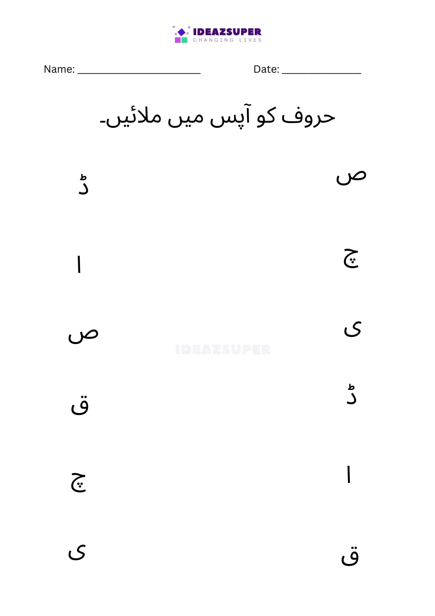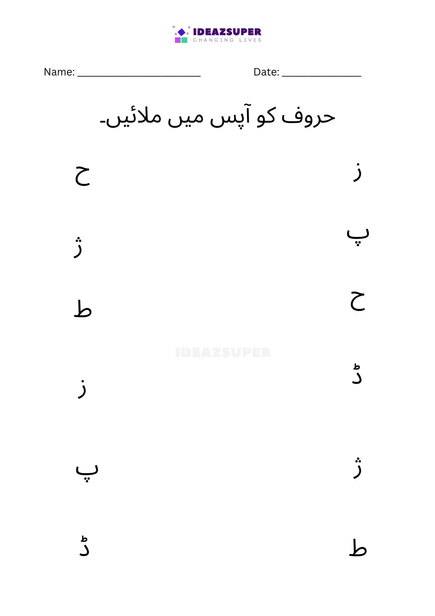 This set helps children aged 2–5 practice Urdu alphabet identification by drawing lines between identical Urdu letters. The clear, bold script supports recognition, while the matching activity strengthens visual memory and builds cognitive mapping skills. With fun and interactive exercises, toddlers and preschoolers enjoy early Urdu learning in a stress-free way.
