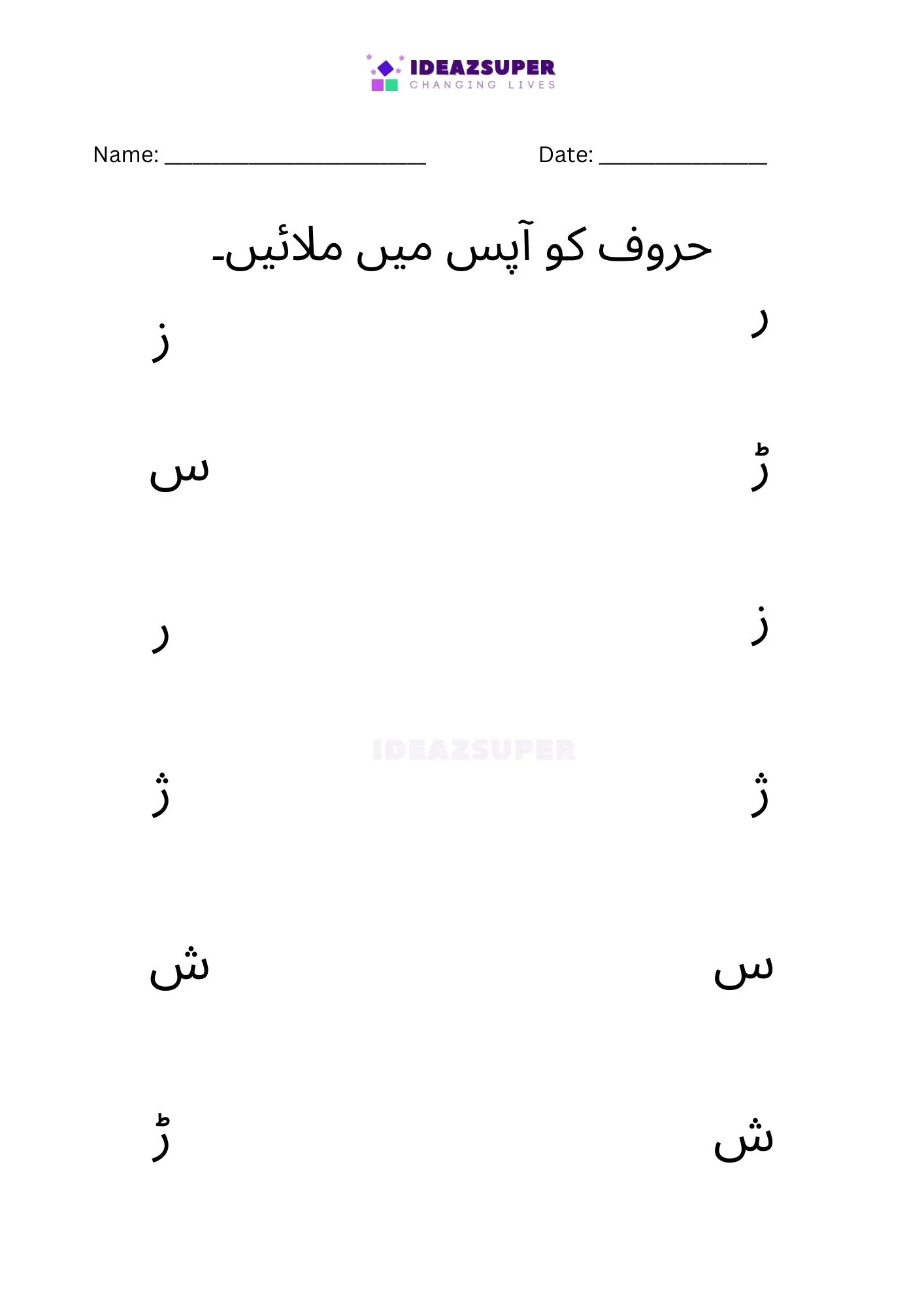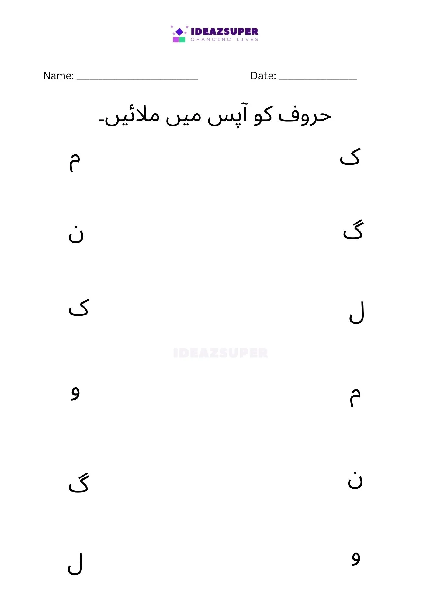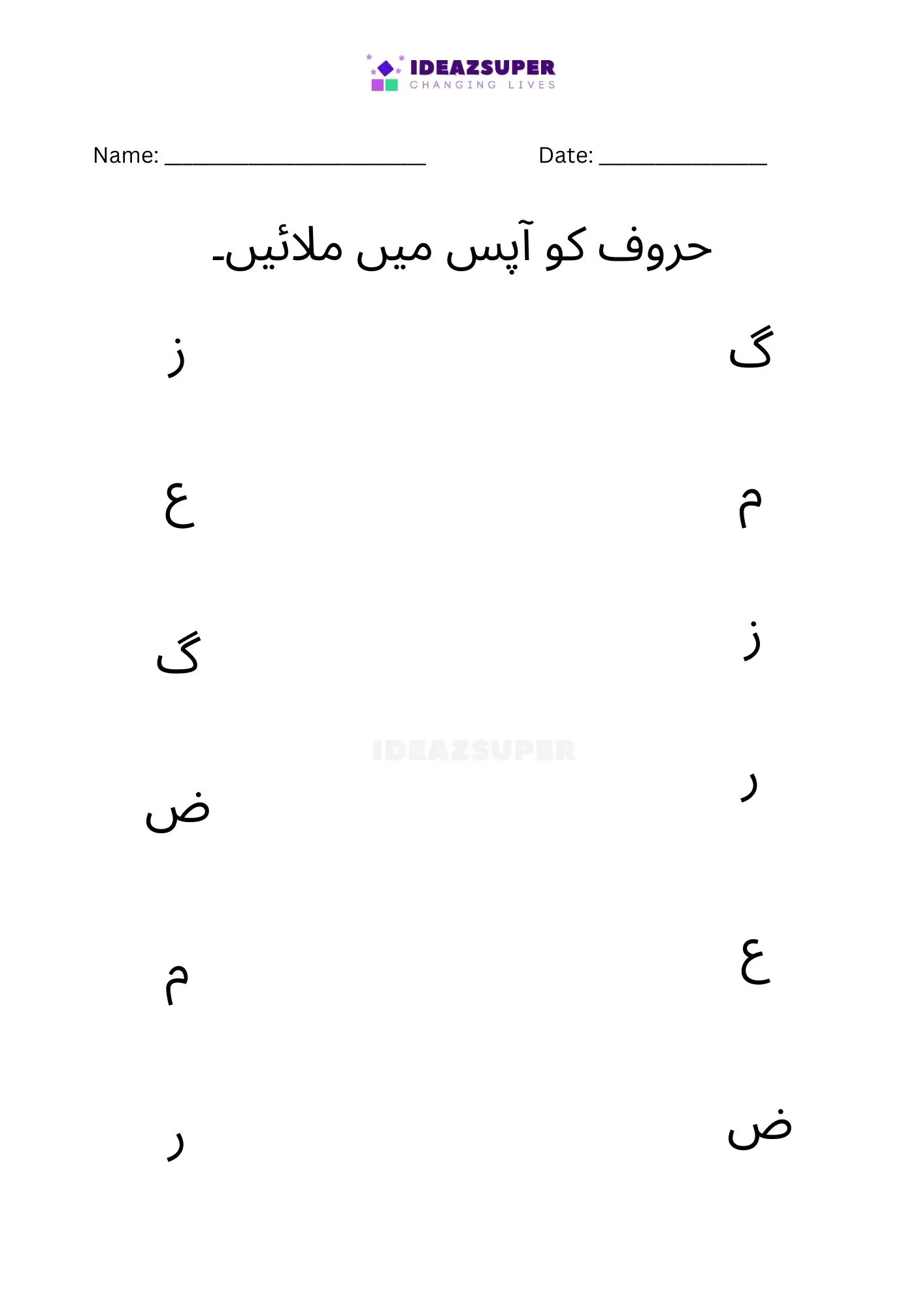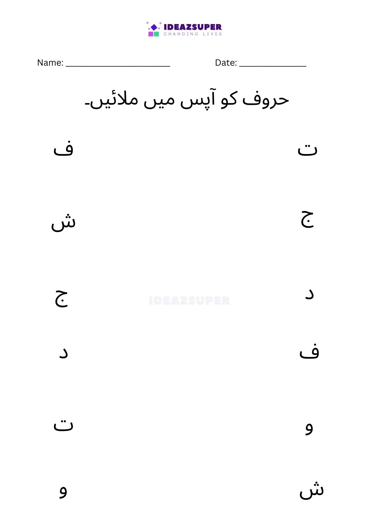This set helps children aged 2–5 practice Urdu alphabet identification by drawing lines between identical Urdu letters. The clear, bold script supports recognition, while the matching activity strengthens visual memory and builds cognitive mapping skills. With fun and interactive exercises, toddlers and preschoolers enjoy early Urdu learning in a stress-free way.