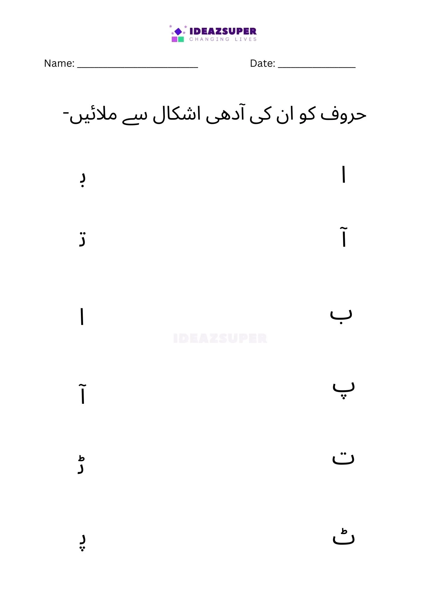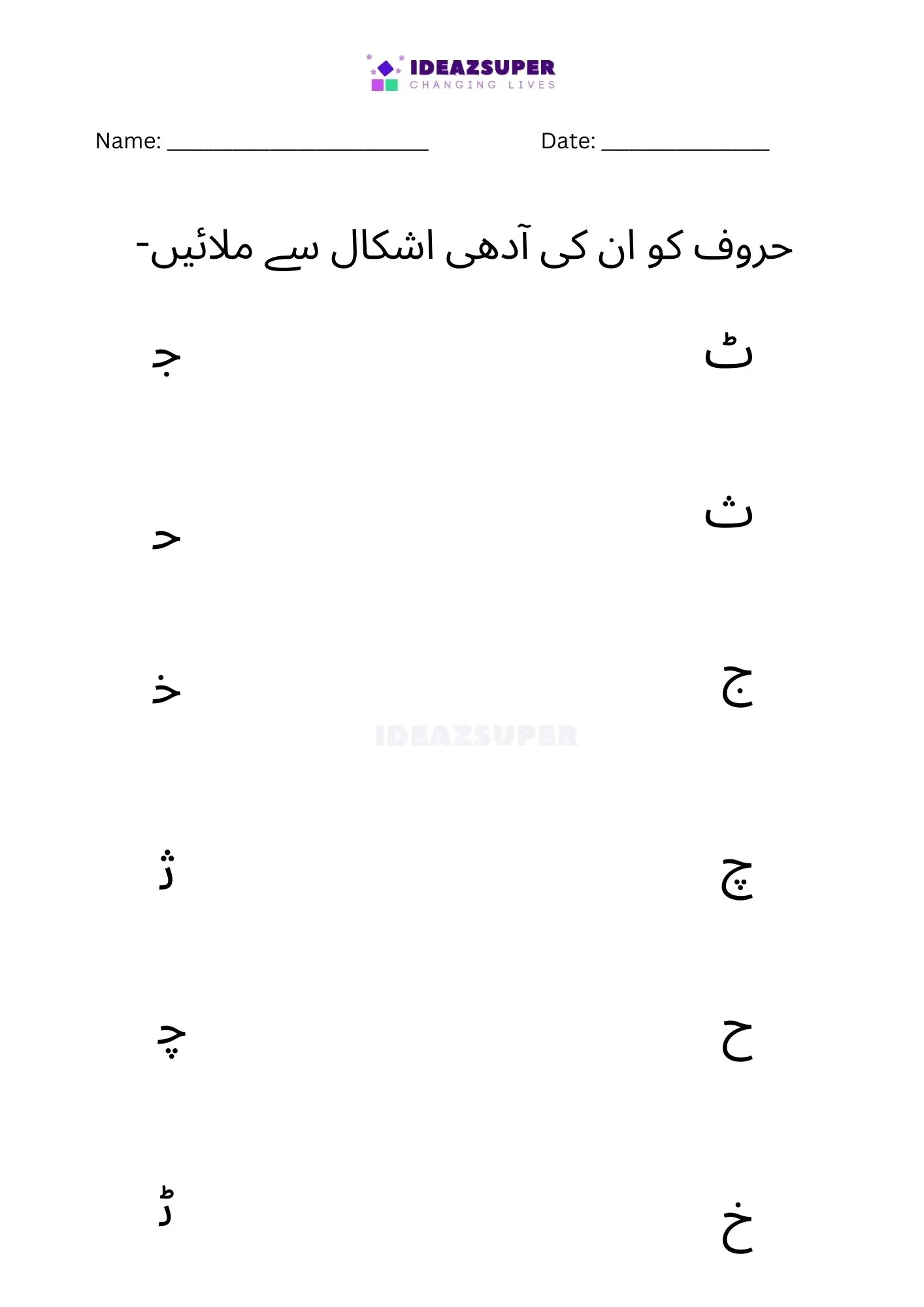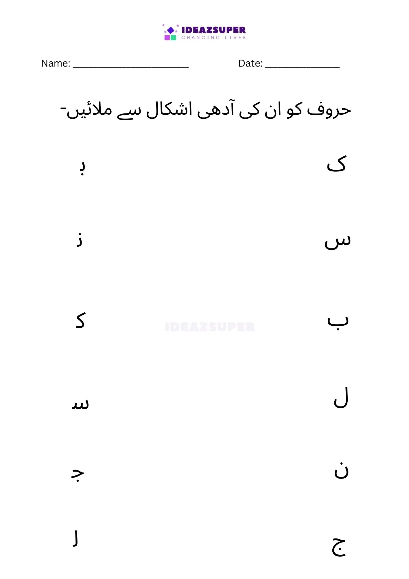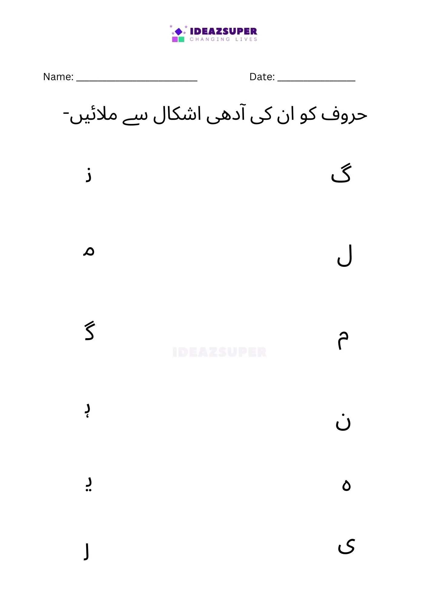 These worksheets guide children in matching full Urdu letters to their half-shapes (adhi ashkal). Designed for ages 2–5, the activity strengthens script recognition while building visual and cognitive skills. By treating half-shapes as puzzles, children gain a deeper understanding of letter structure in a fun, educational format.