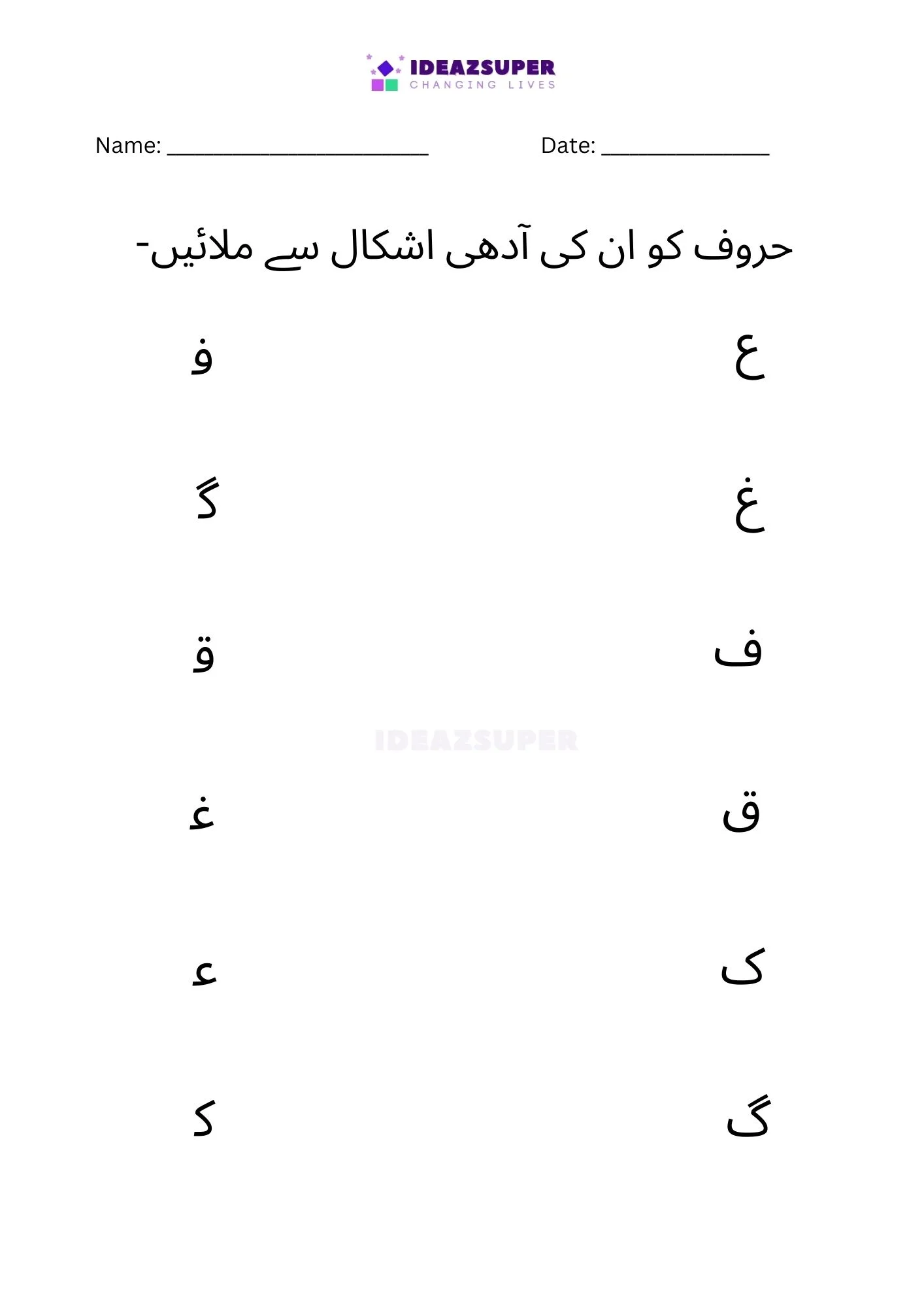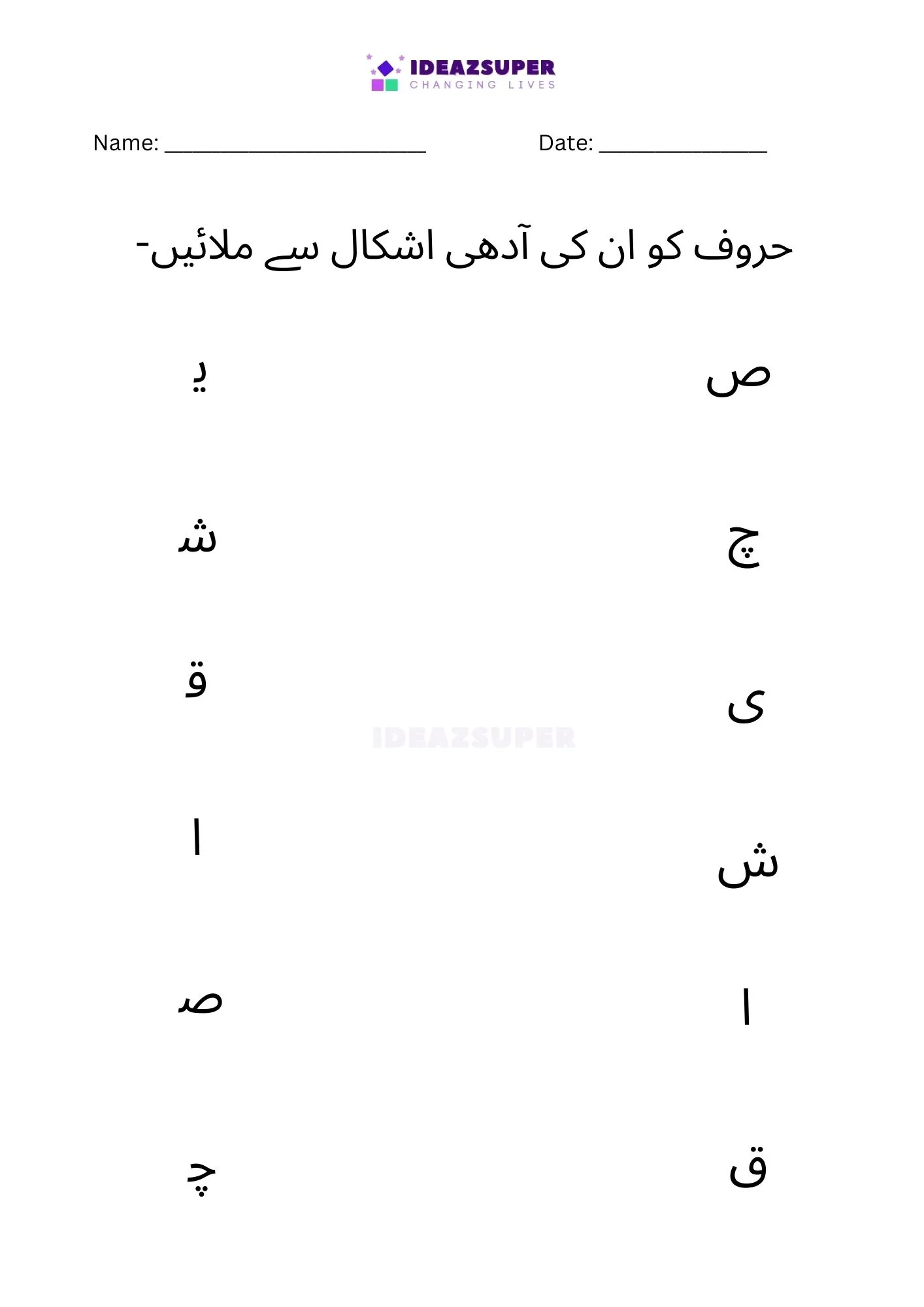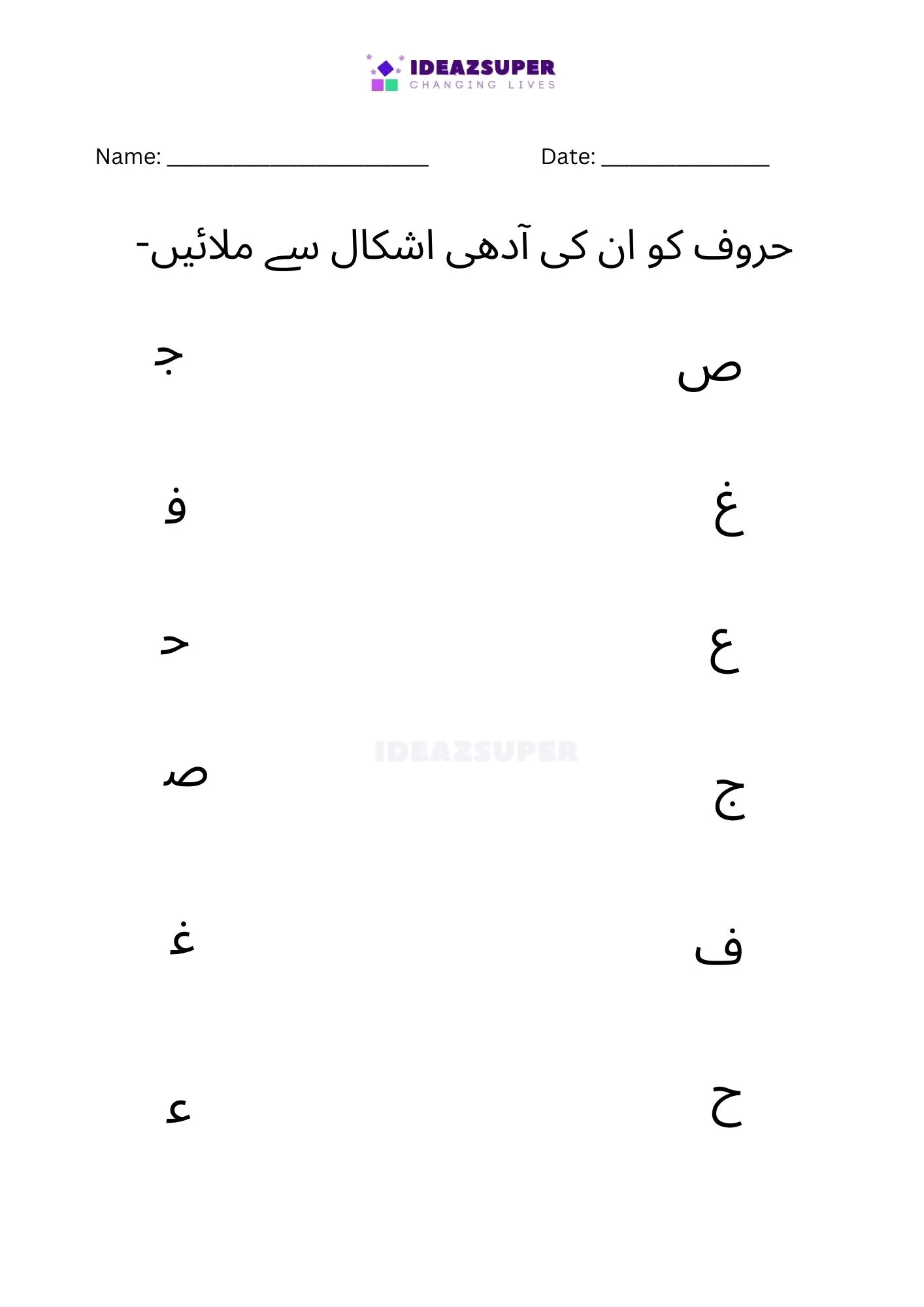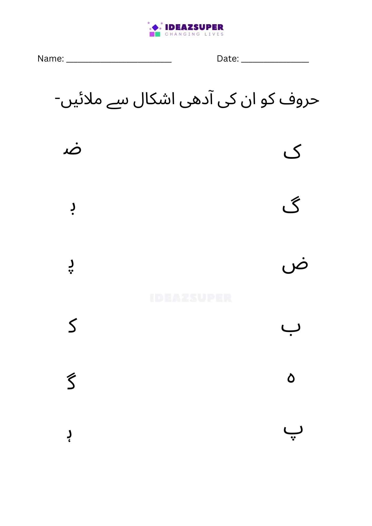 These worksheets guide children in matching full Urdu letters to their half-shapes (adhi ashkal). Designed for ages 2–5, the activity strengthens script recognition while building visual and cognitive skills. By treating half-shapes as puzzles, children gain a deeper understanding of letter structure in a fun, educational format.