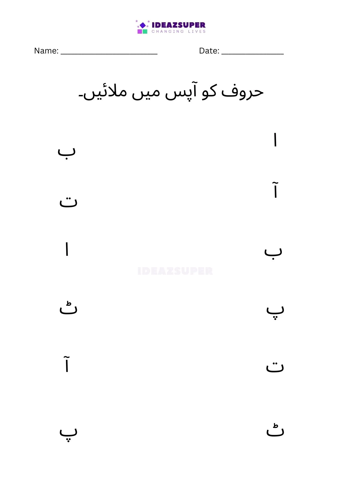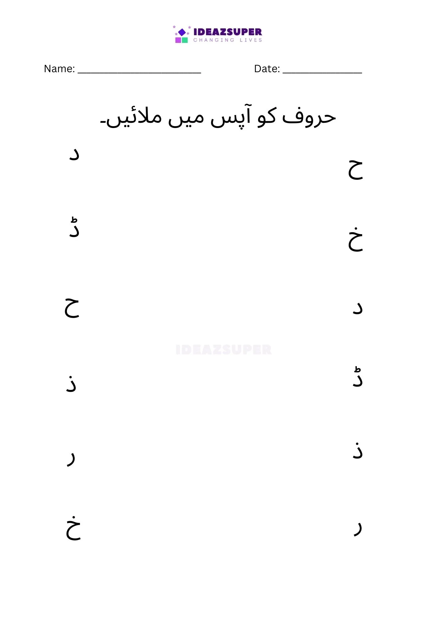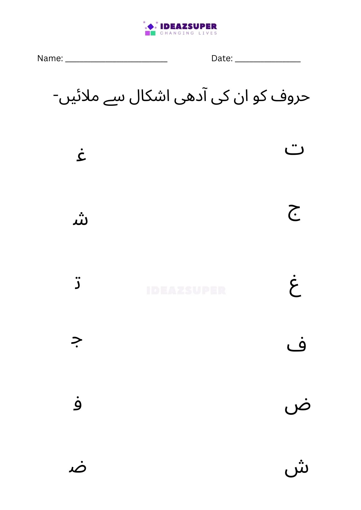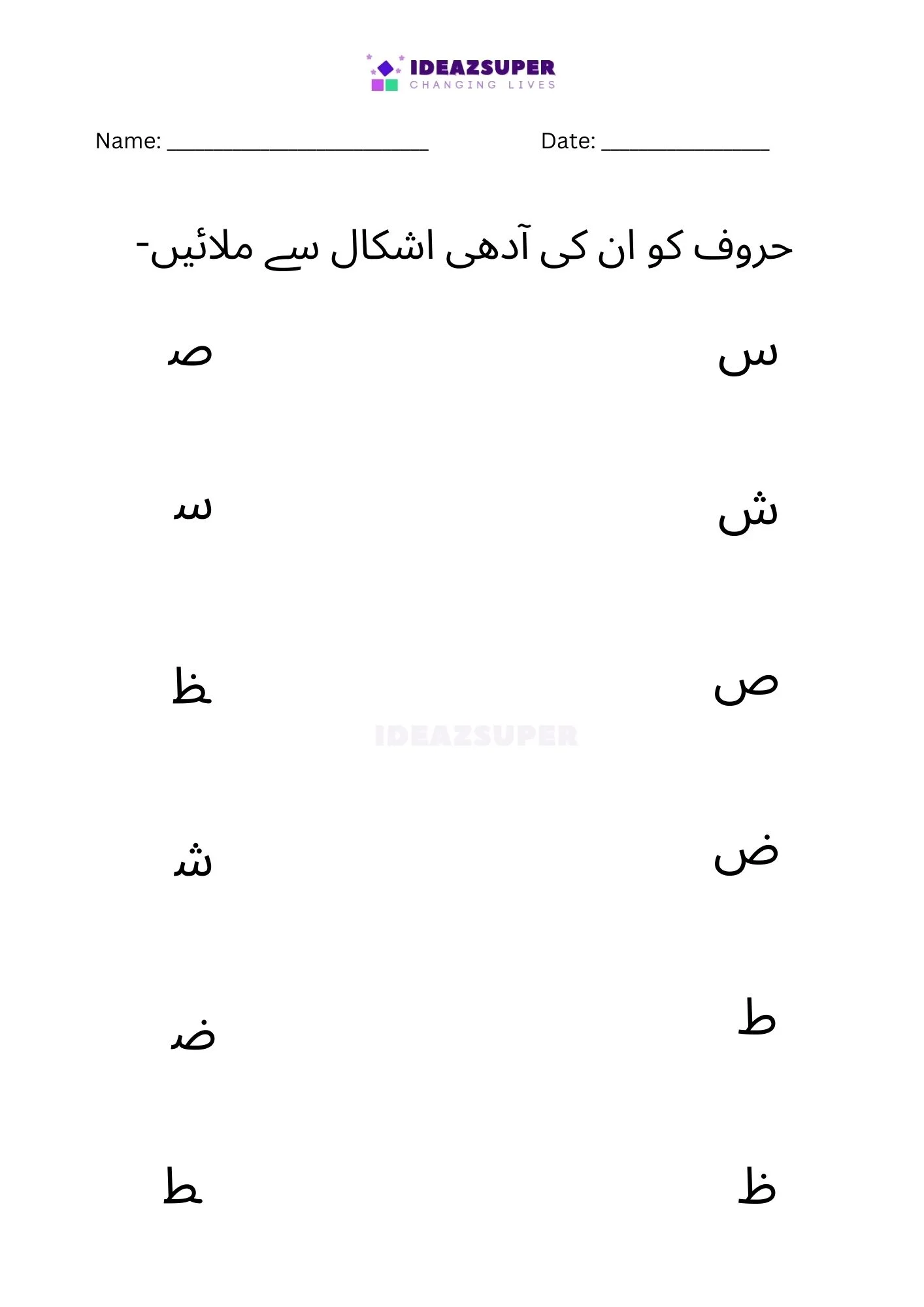 These worksheets guide children in matching full Urdu letters to their half-shapes (adhi ashkal). Designed for ages 2–5, the activity strengthens script recognition while building visual and cognitive skills. By treating half-shapes as puzzles, children gain a deeper understanding of letter structure in a fun, educational format.