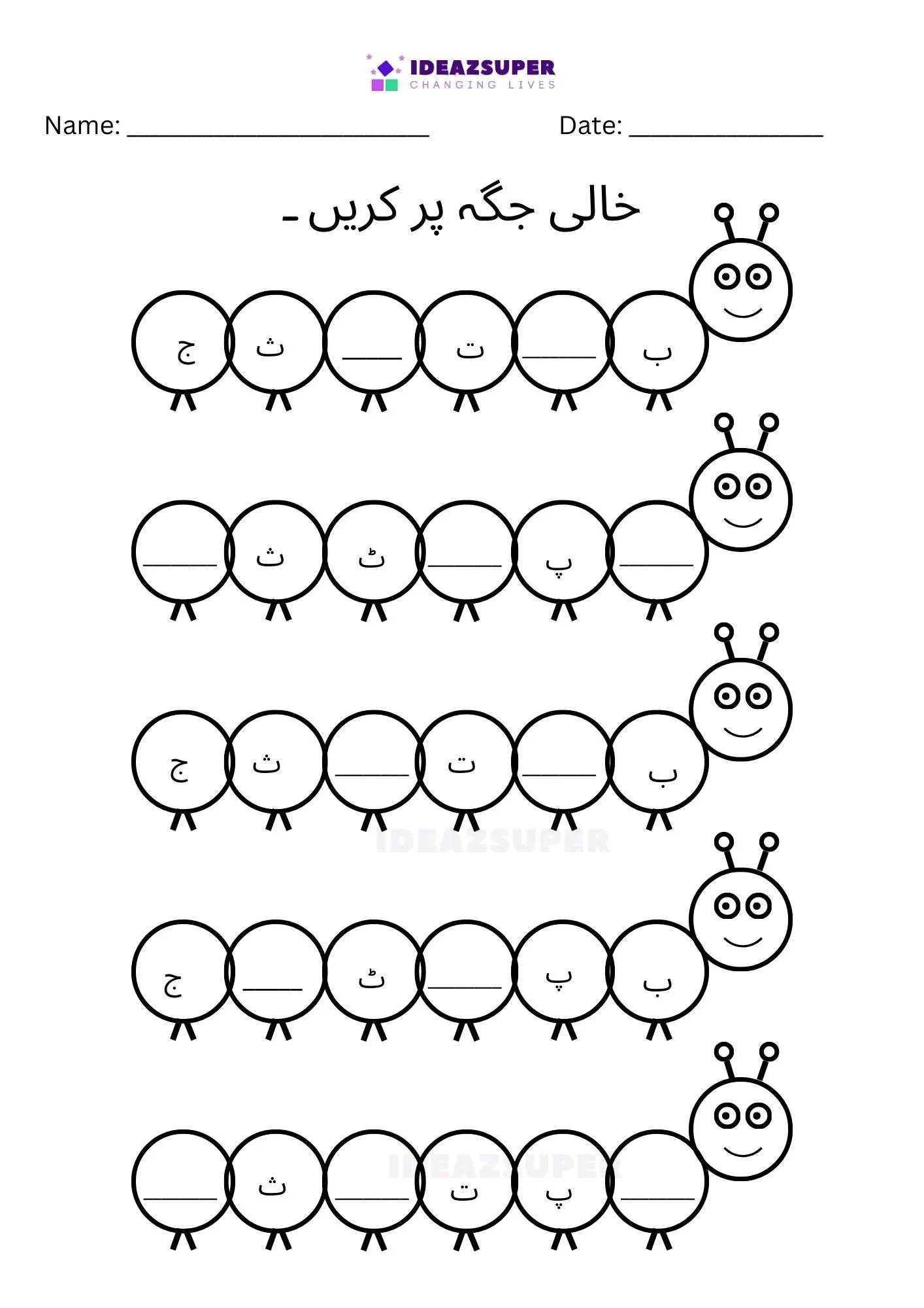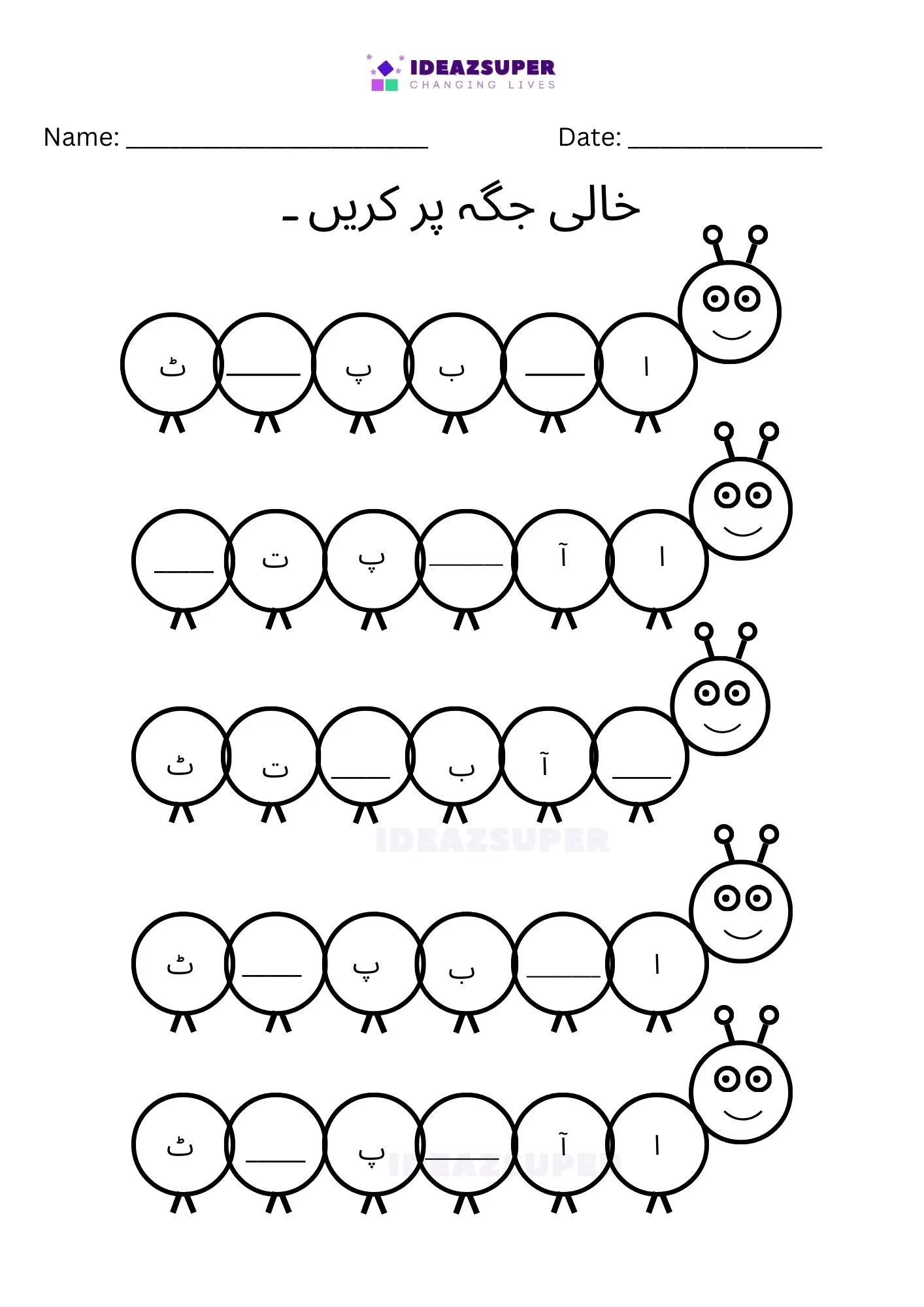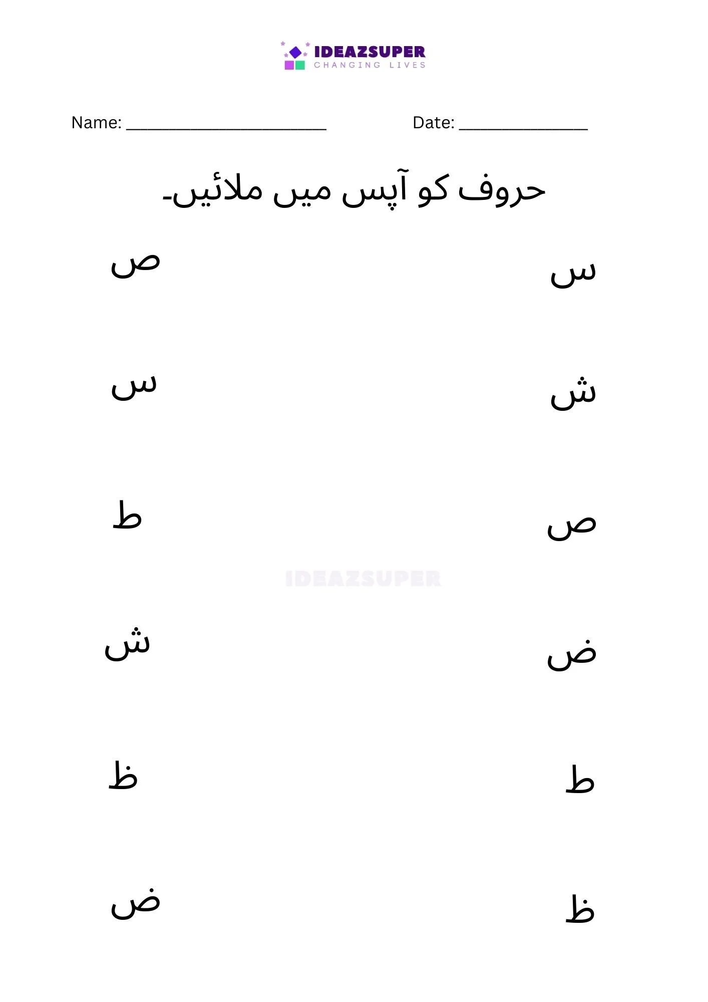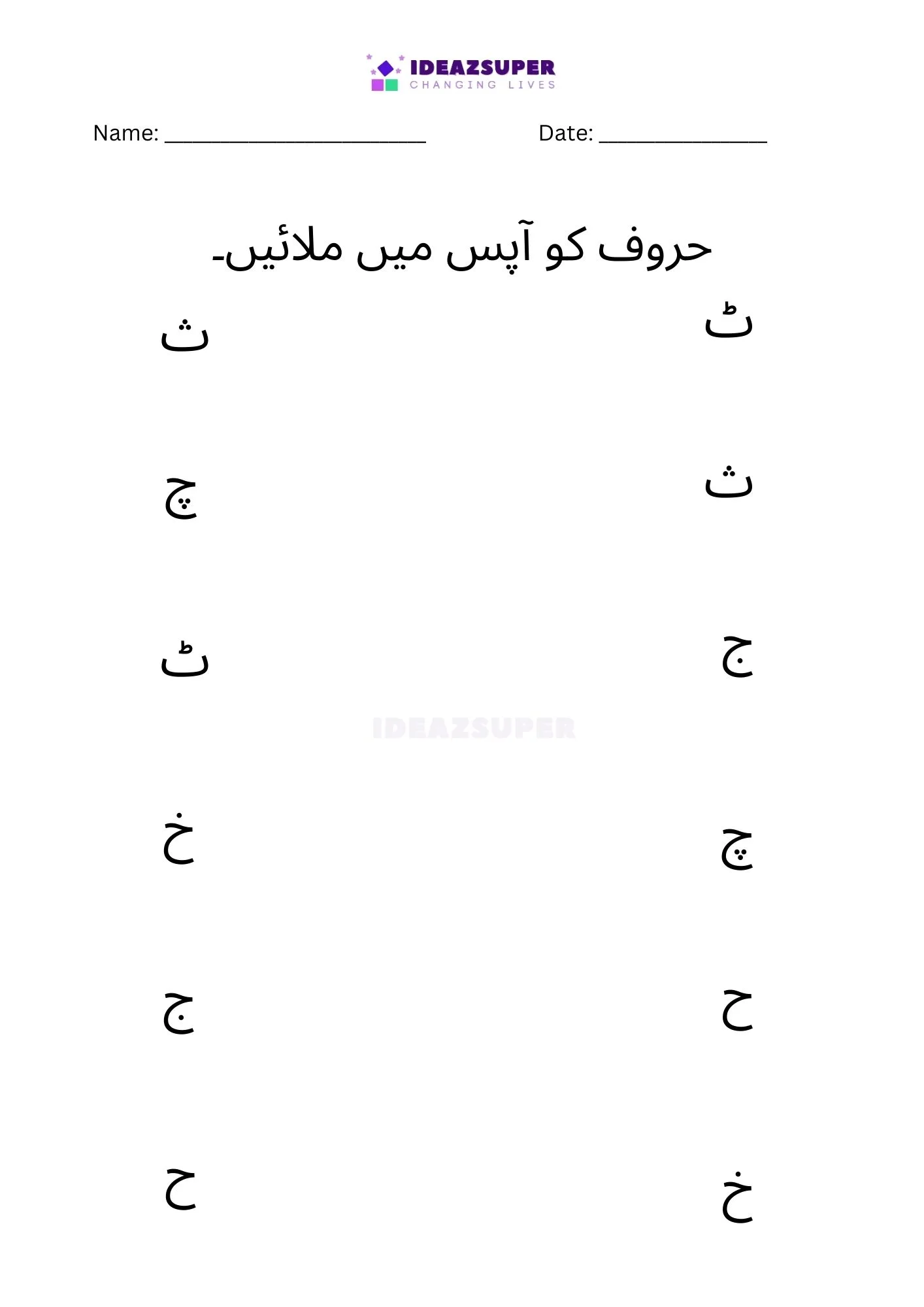 These worksheets guide children in matching full Urdu letters to their half-shapes (adhi ashkal). Designed for ages 2–5, the activity strengthens script recognition while building visual and cognitive skills. By treating half-shapes as puzzles, children gain a deeper understanding of letter structure in a fun, educational format.