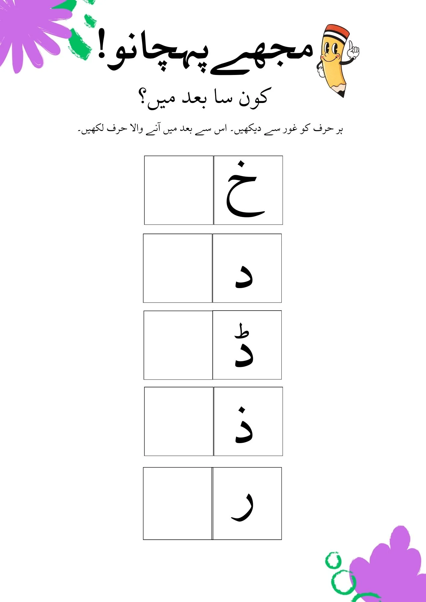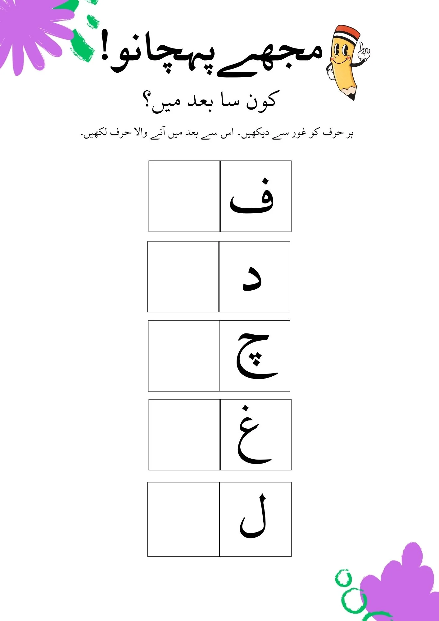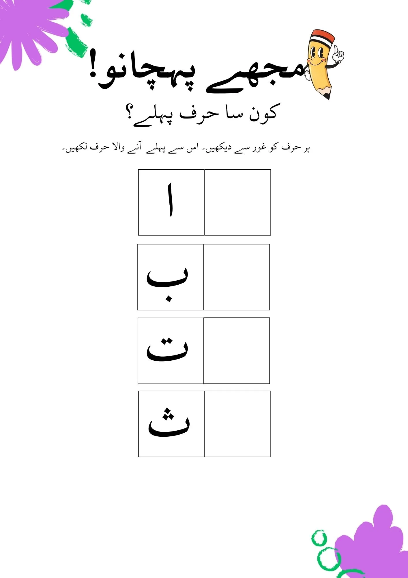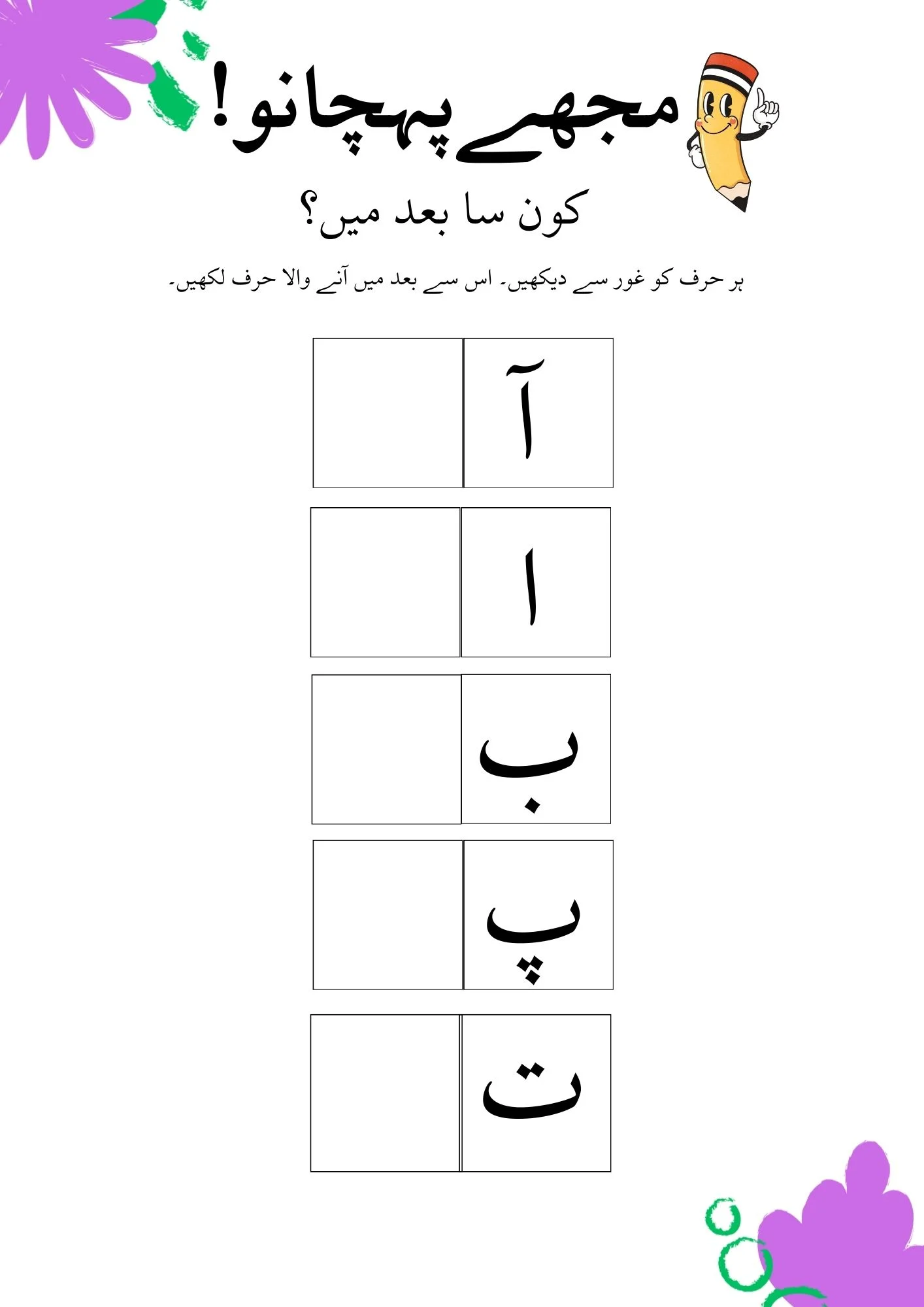 Help your child master Urdu alphabet sequencing with our Before & After Worksheets designed for preschoolers (ages 3–6). These engaging worksheets encourage children to: