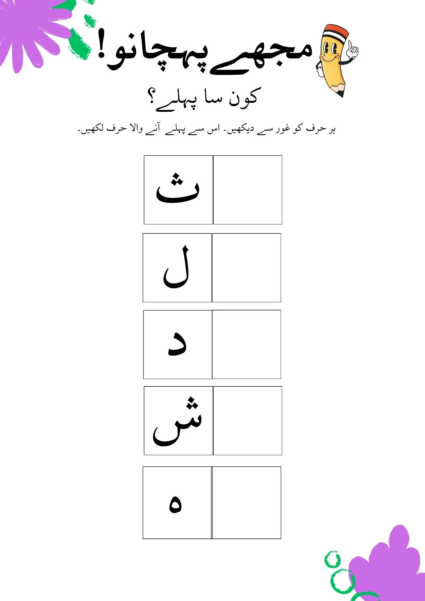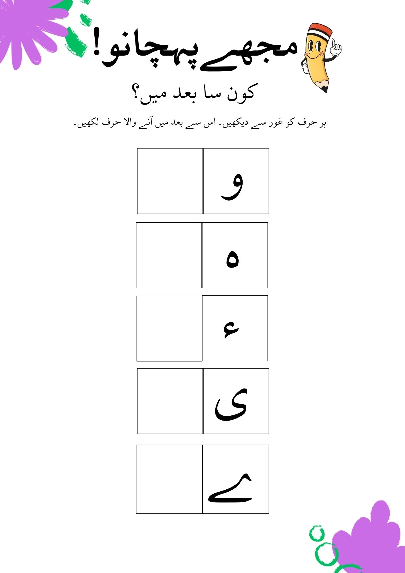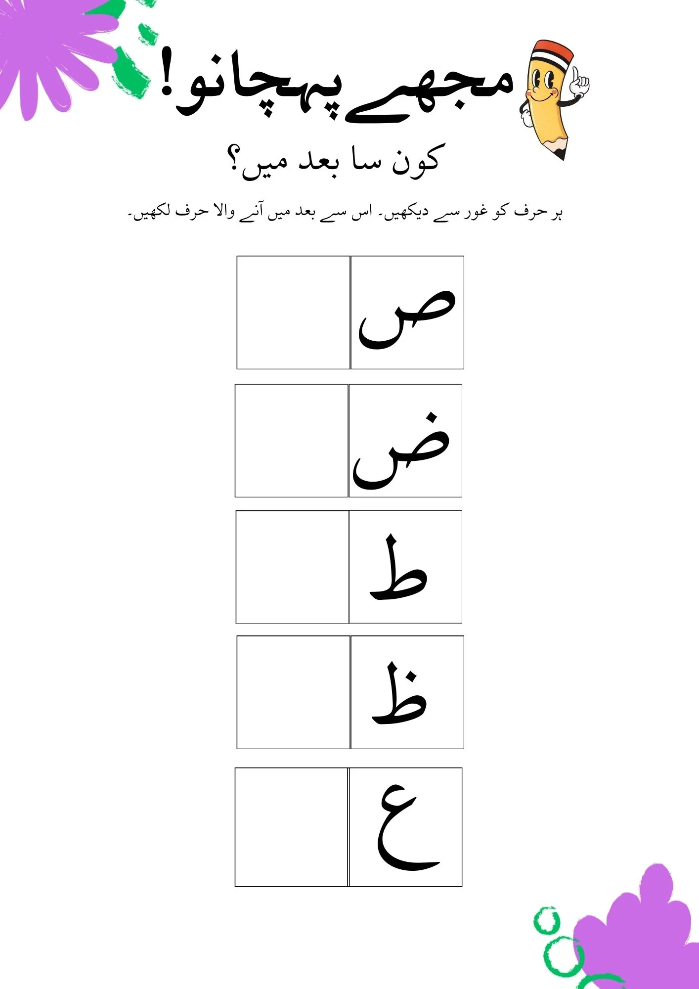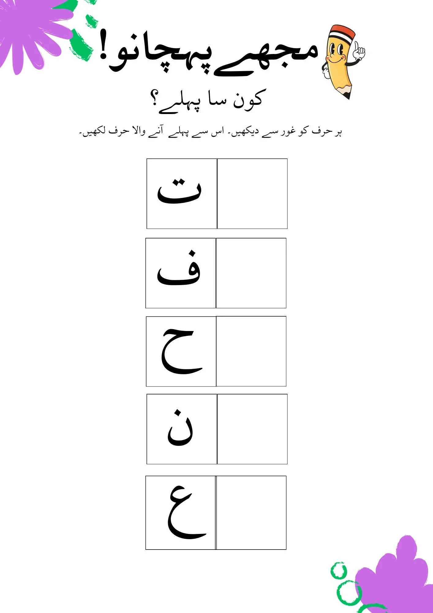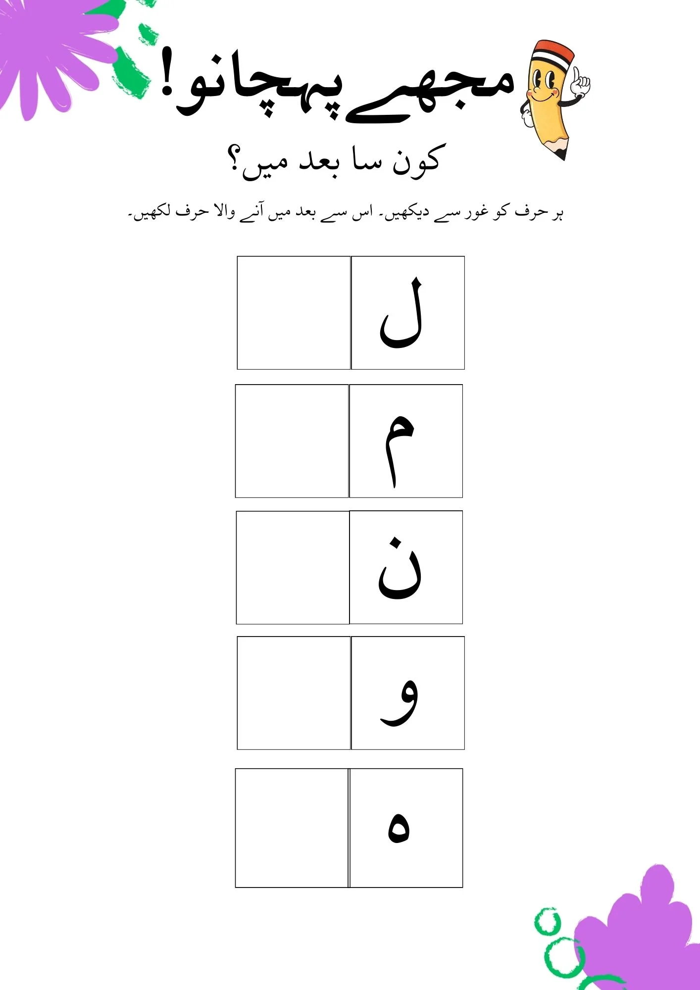 Help your child master Urdu alphabet sequencing with our Before & After Worksheets designed for preschoolers (ages 3–6). These engaging worksheets encourage children to: