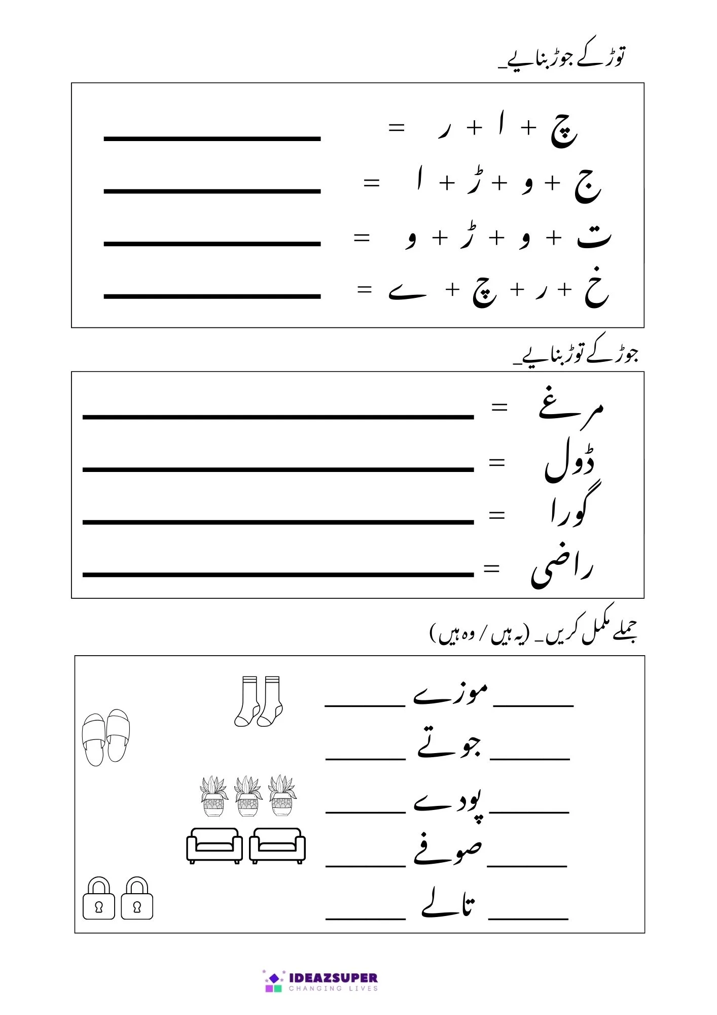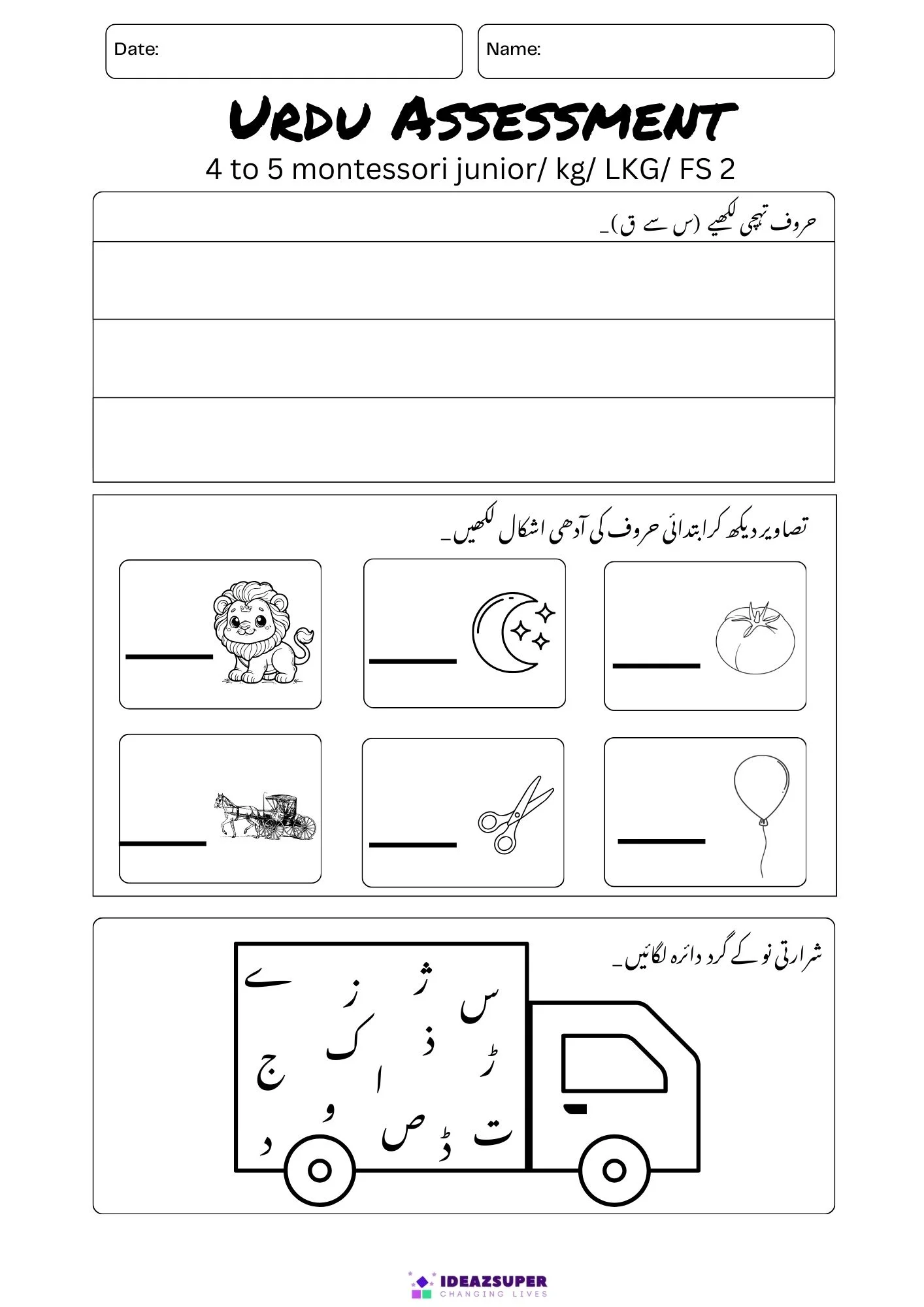 These Urdu assessment worksheets are created for Montessori, Junior KG, LKG, and FS-2 students to practice Urdu basics.