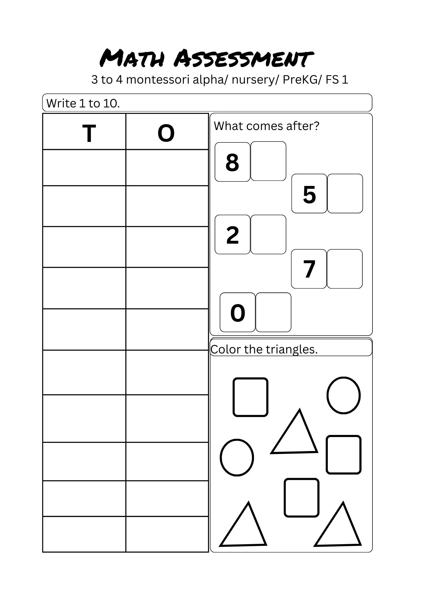 These Math assessment worksheets are created for Pre-KG, Montessori, and FS-1 children to practice numbers, counting, matching, shapes, and basic math skills following an exam pattern.