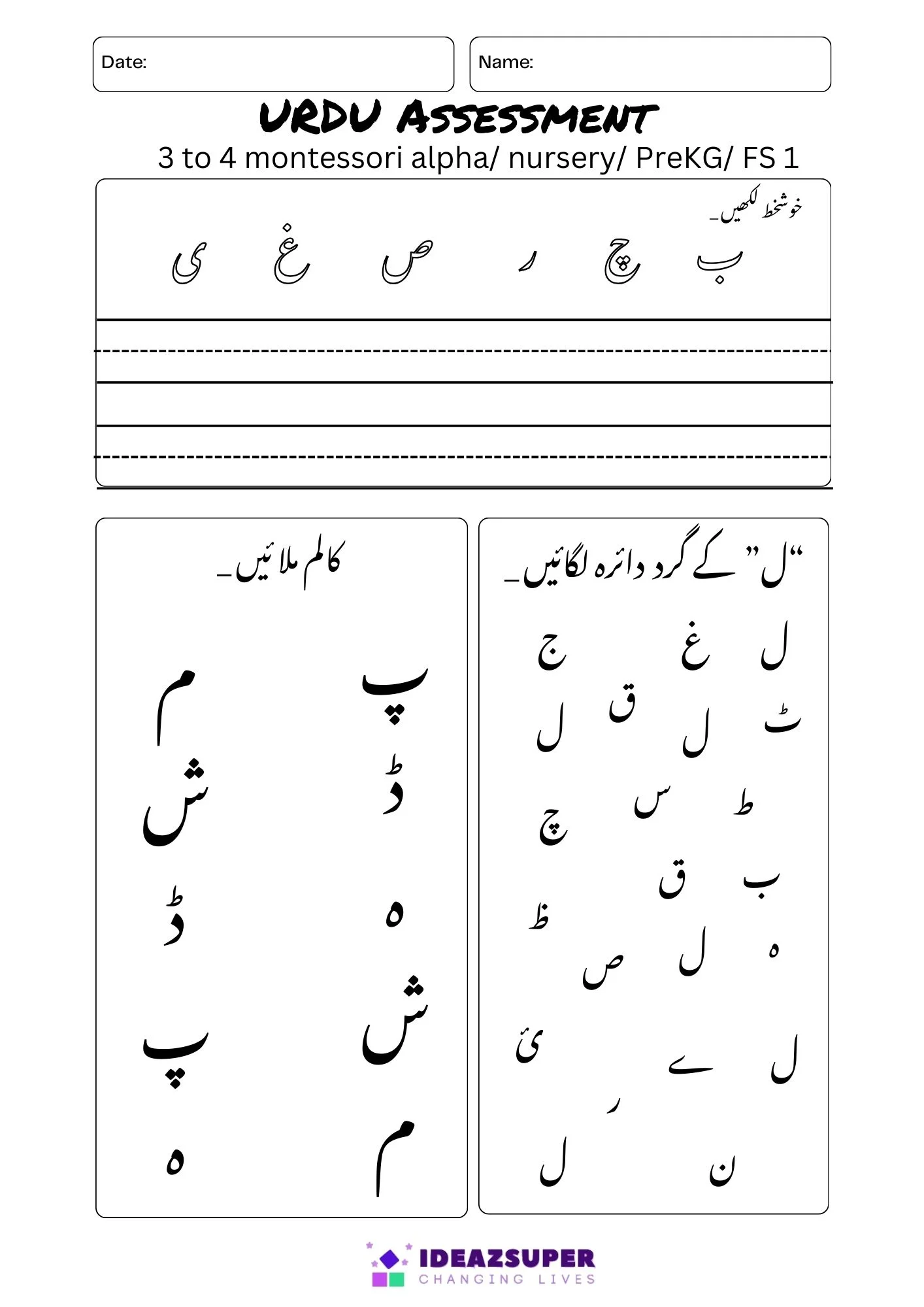 These Urdu assessment worksheets are specially designed for Pre-KG, Montessori, and FS-1 students to help them practice Urdu in an exam-style format.