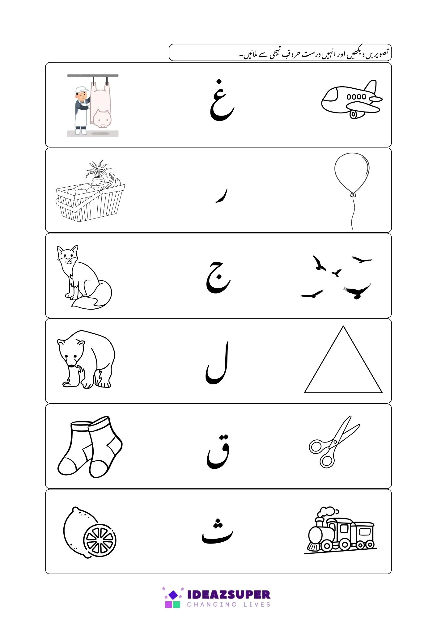 Activities include recognizing, matching, tracing, identifying, and developing a basic understanding of the Urdu alphabet to prepare kids for school assessments.