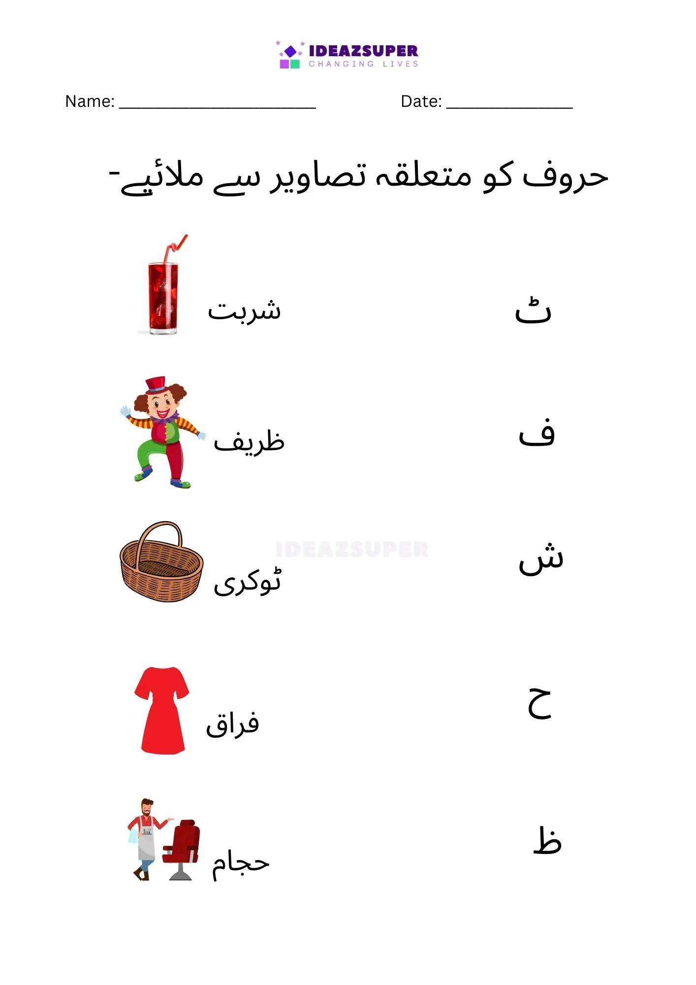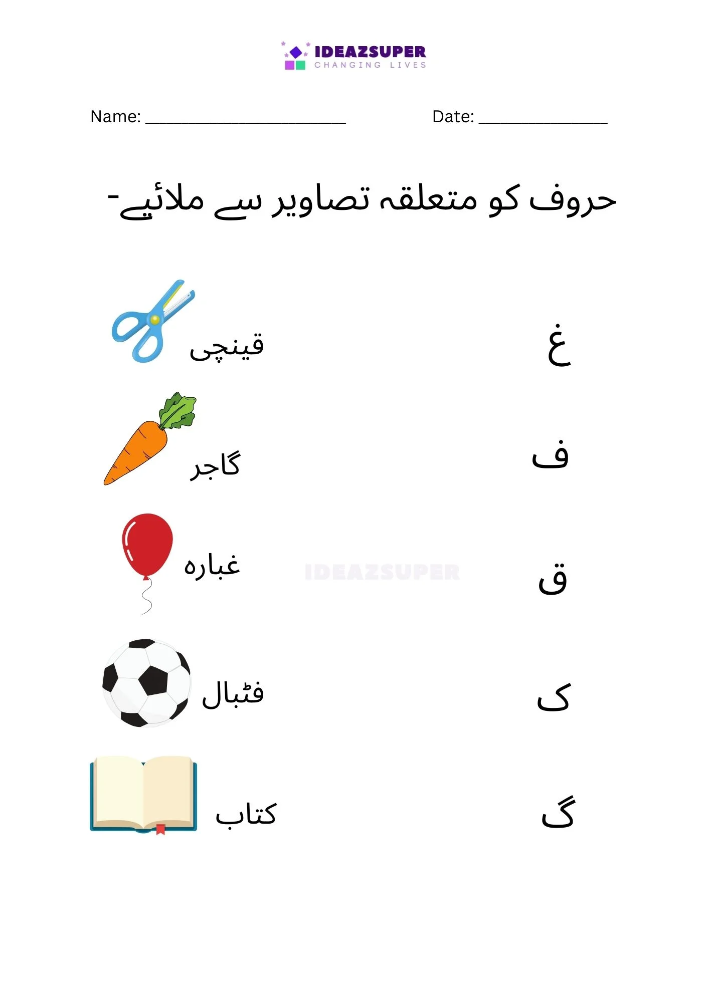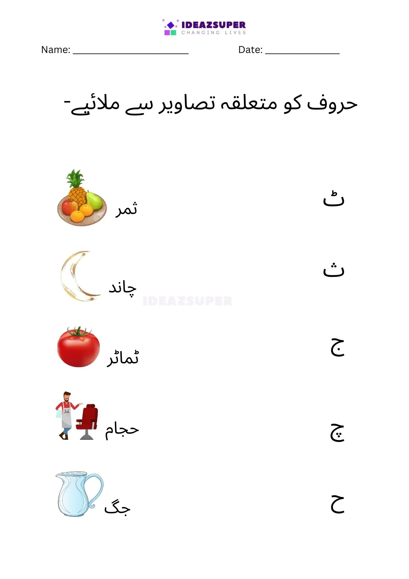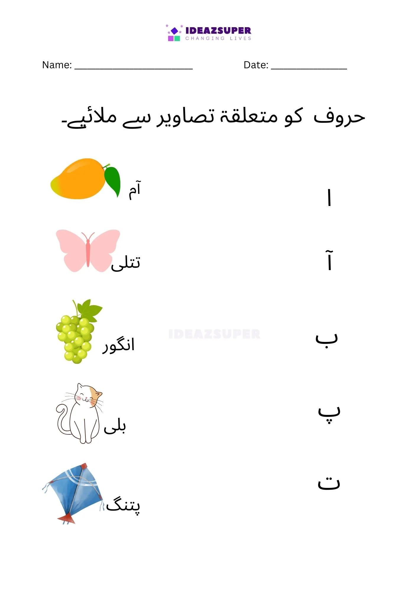 Introduce your child to Urdu phonics with these worksheets that focus on matching beginning sounds. Children (ages 2–5) see a small Urdu letter and choose the correct picture that starts with that sound. This activity strengthens letter–sound relationships, boosts phonemic awareness, and makes early learning fun with colorful illustrations.