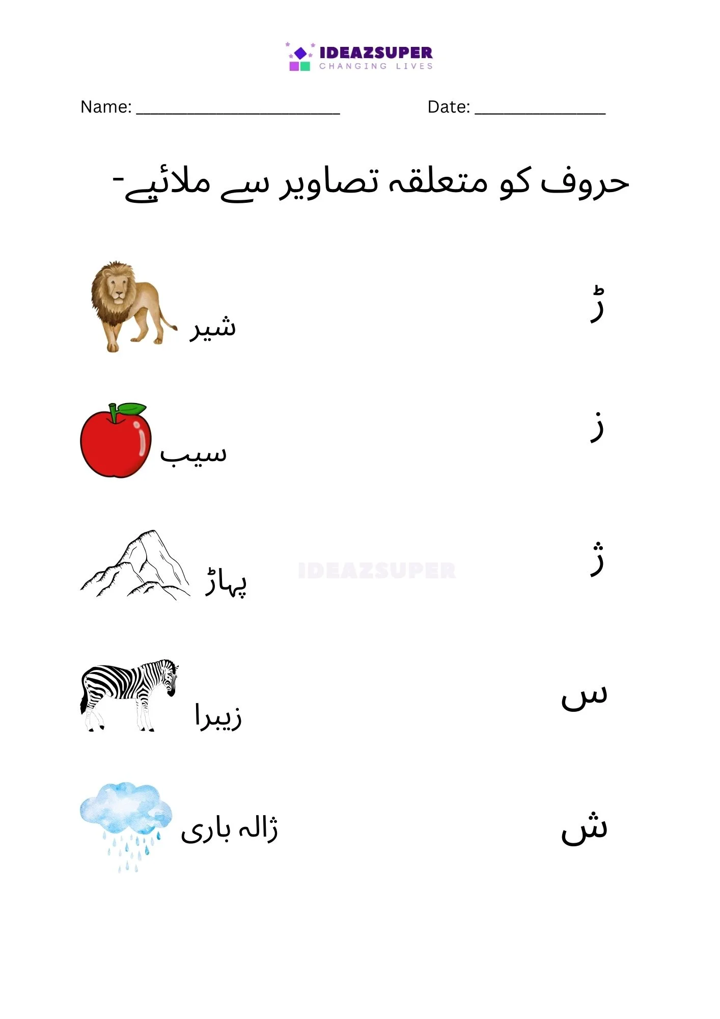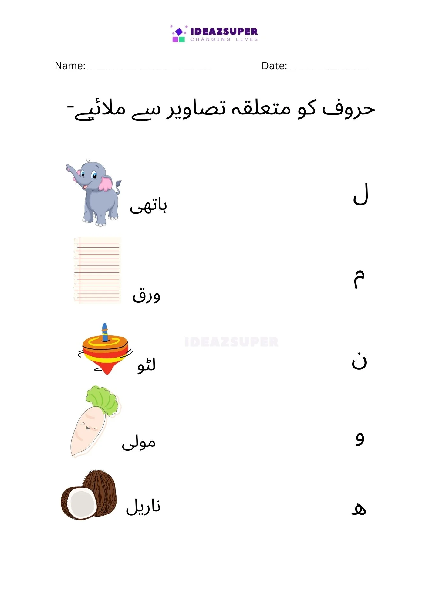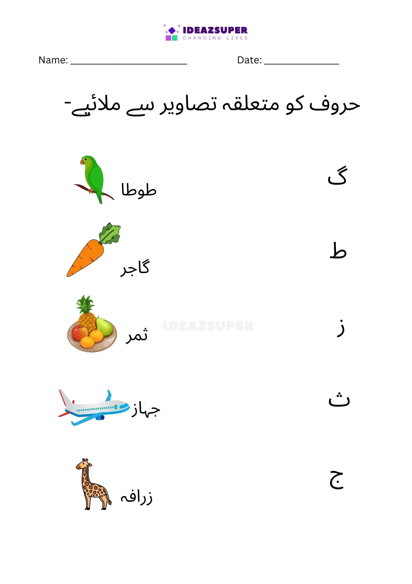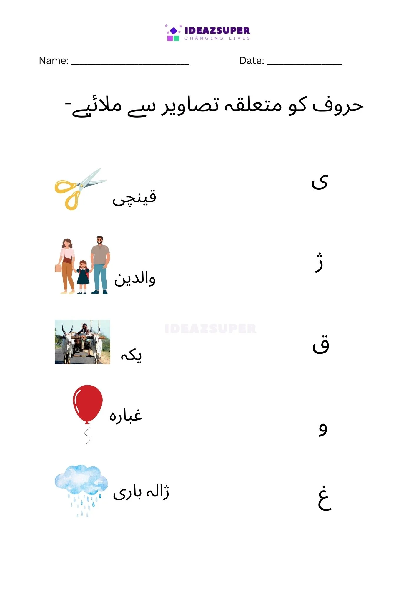 Introduce your child to Urdu phonics with these worksheets that focus on matching beginning sounds. Children (ages 2–5) see a small Urdu letter and choose the correct picture that starts with that sound. This activity strengthens letter–sound relationships, boosts phonemic awareness, and makes early learning fun with colorful illustrations.
