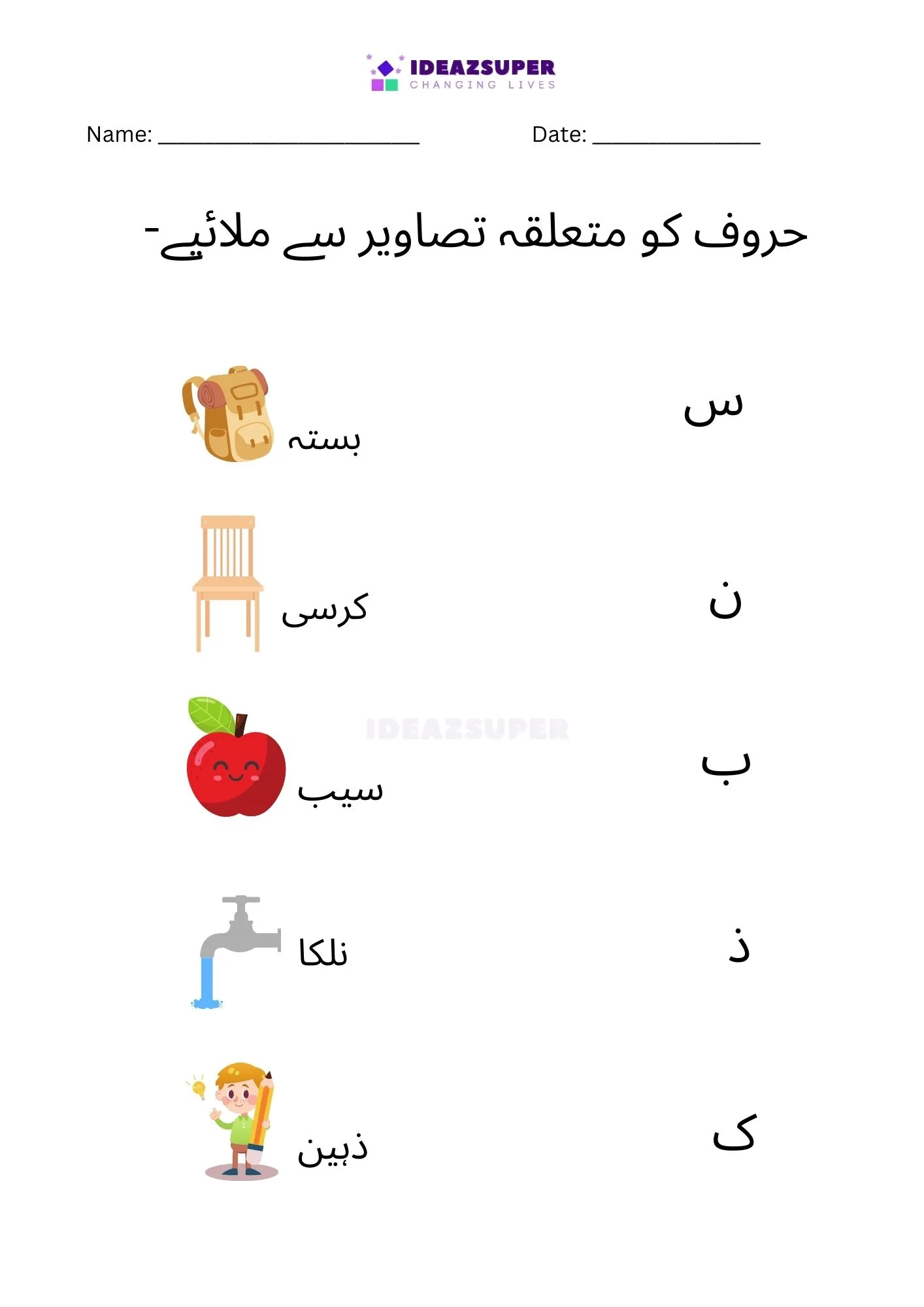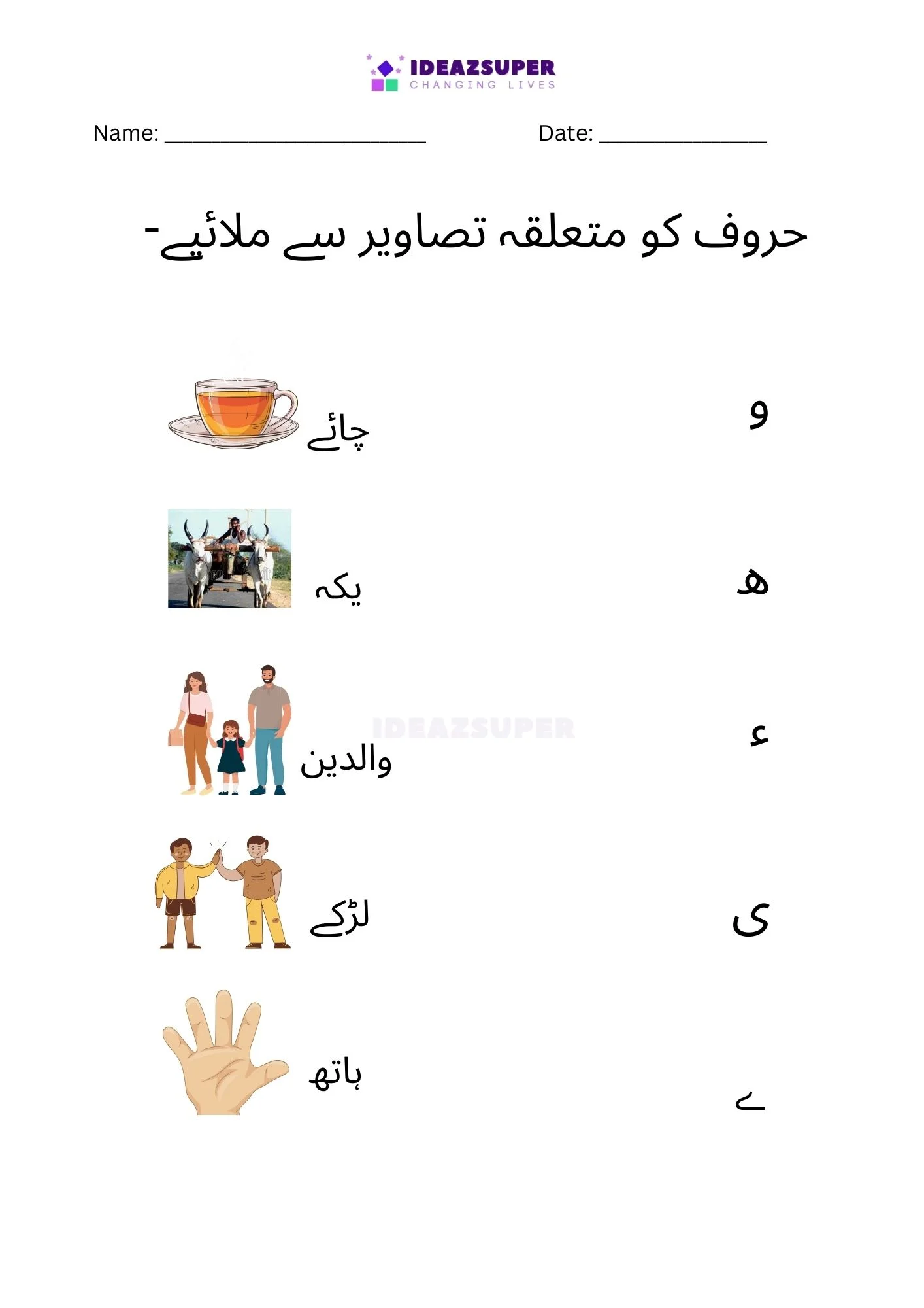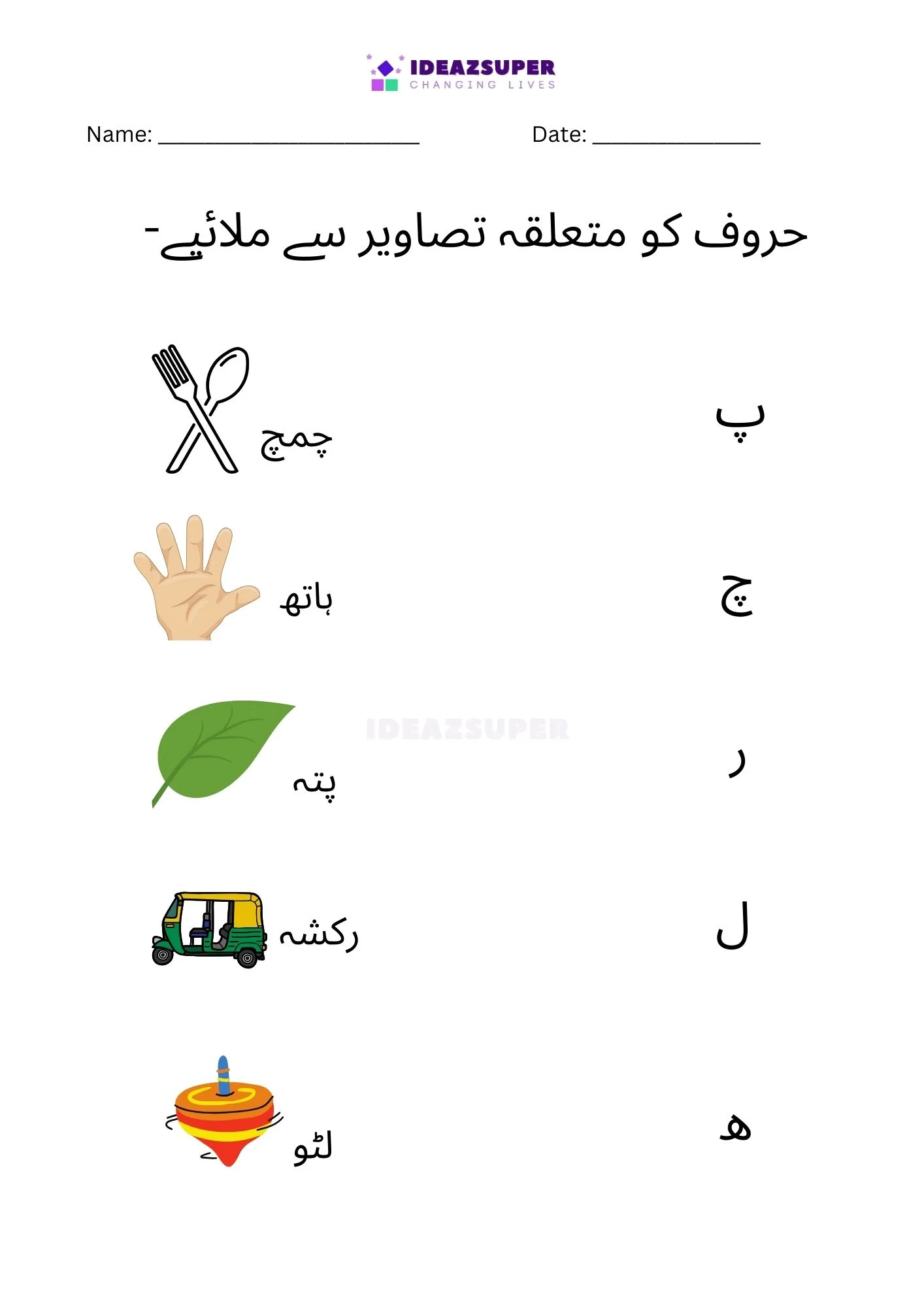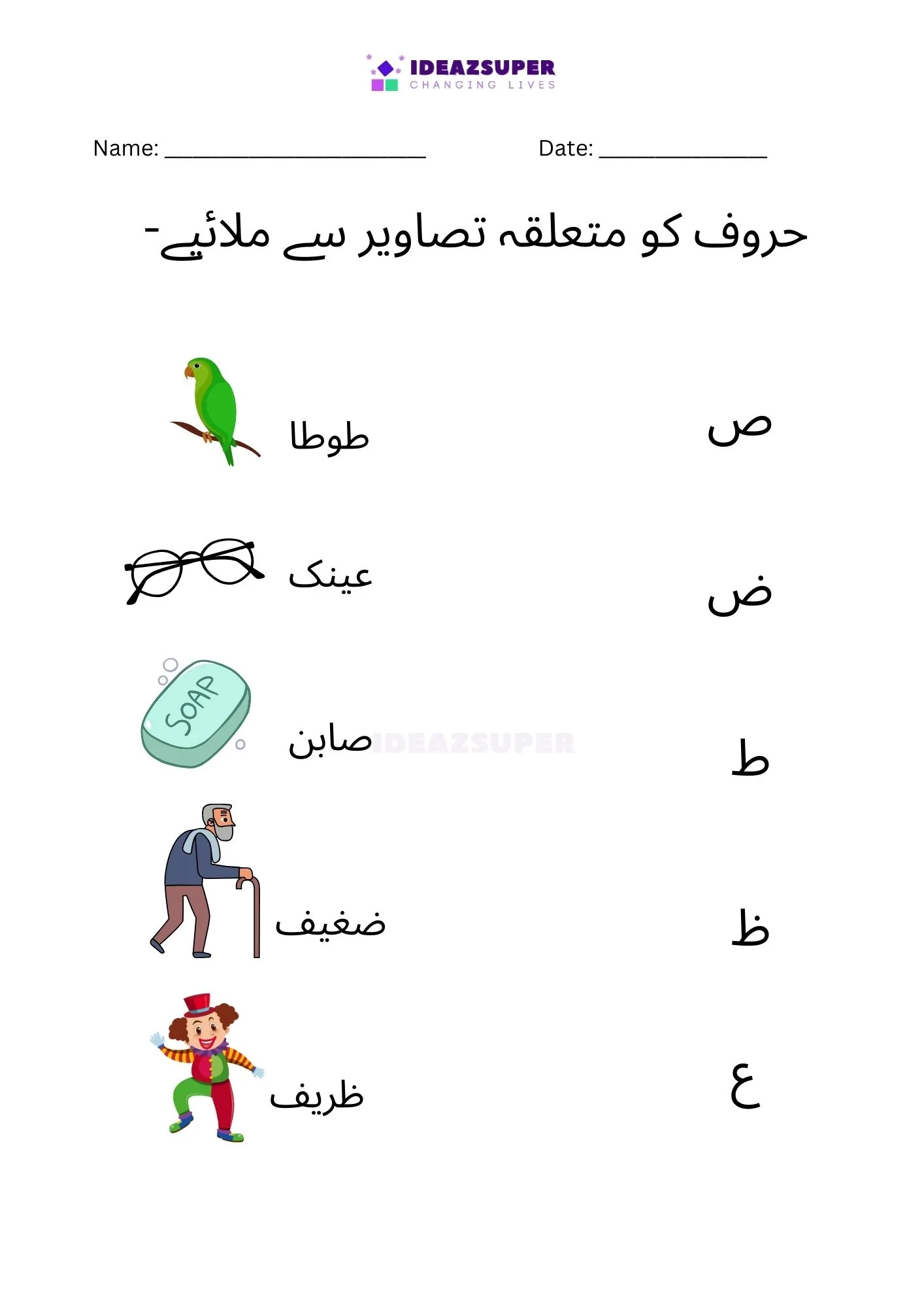 Introduce your child to Urdu phonics with these worksheets that focus on matching beginning sounds. Children (ages 2–5) see a small Urdu letter and choose the correct picture that starts with that sound. This activity strengthens letter–sound relationships, boosts phonemic awareness, and makes early learning fun with colorful illustrations.